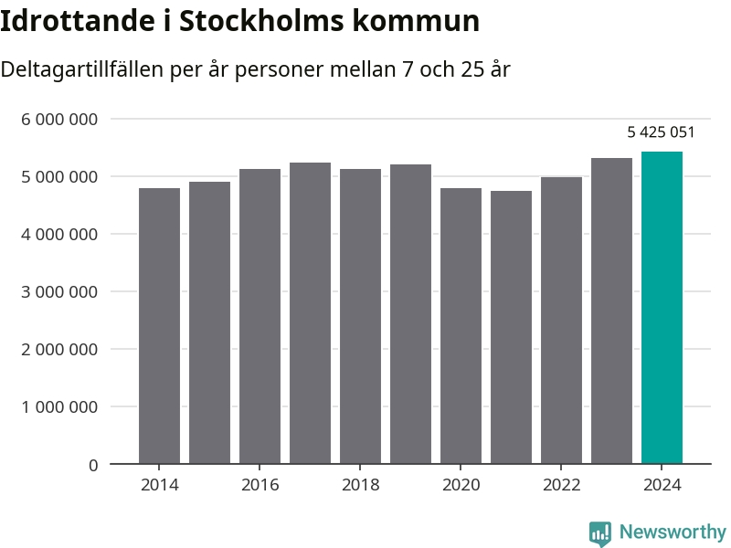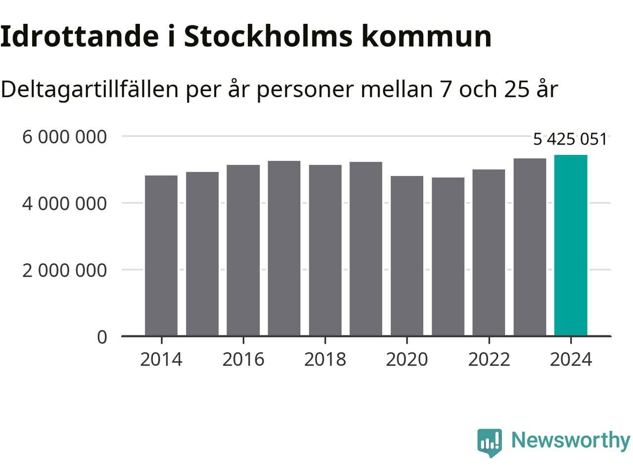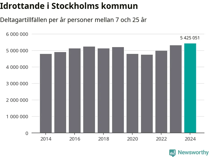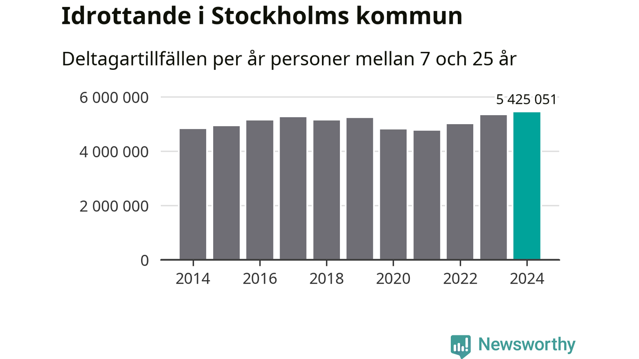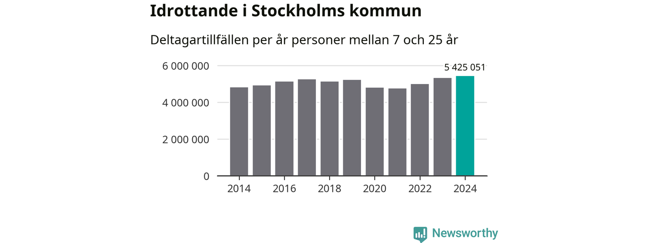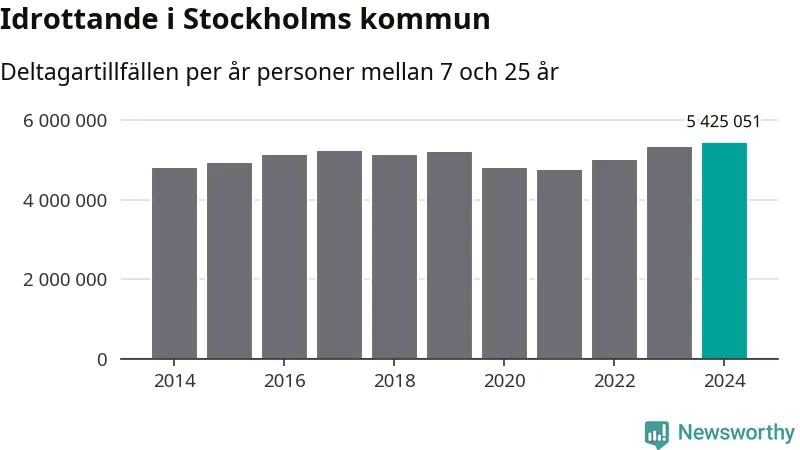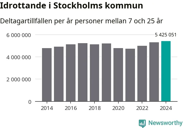 Idrottande ungdomar i Stockholms kommun registrerades för omkring 5 425 000 deltagartillfällen under 2024. Det är något fler än året innan och den högsta siffran i kommunen sedan åtminstone 2014. Det visar nya siffror om utbetalt Lok-stöd, som delas ut till föreningar anslutna till Riksidrottsförbundet specialidrottsförbund. Stödet riktar sig till föreningar som bedriver verksamhet för deltagare i åldern 7-25 år. I riket som helhet ökade antalet deltagartillfällen med fem procent under 2024.