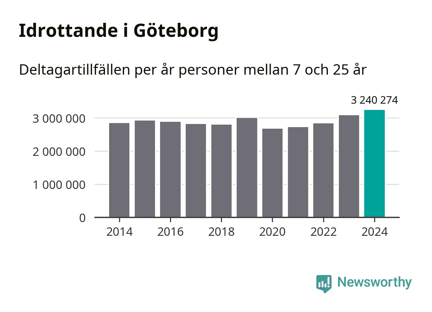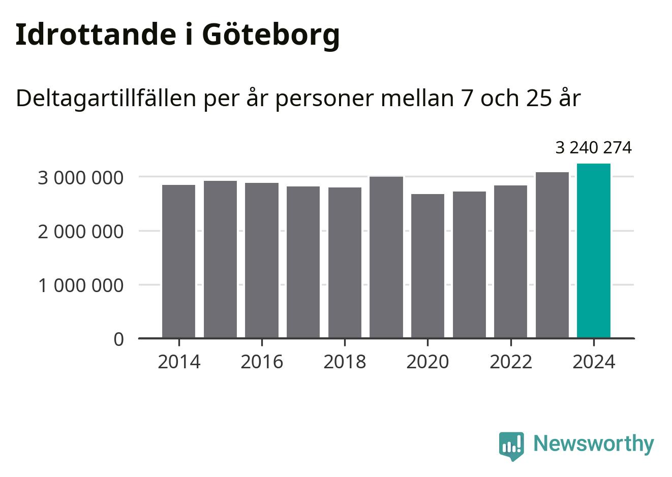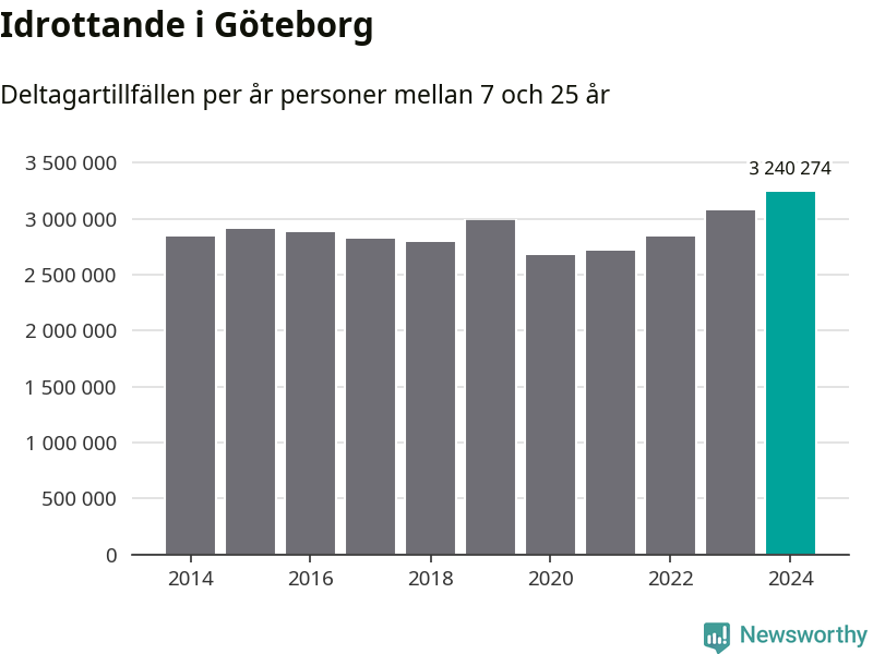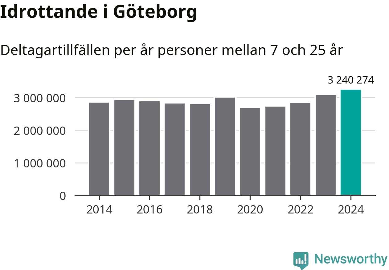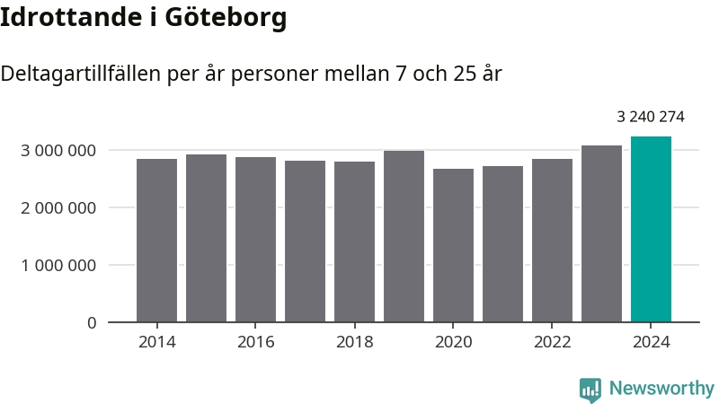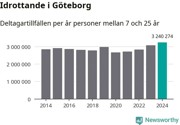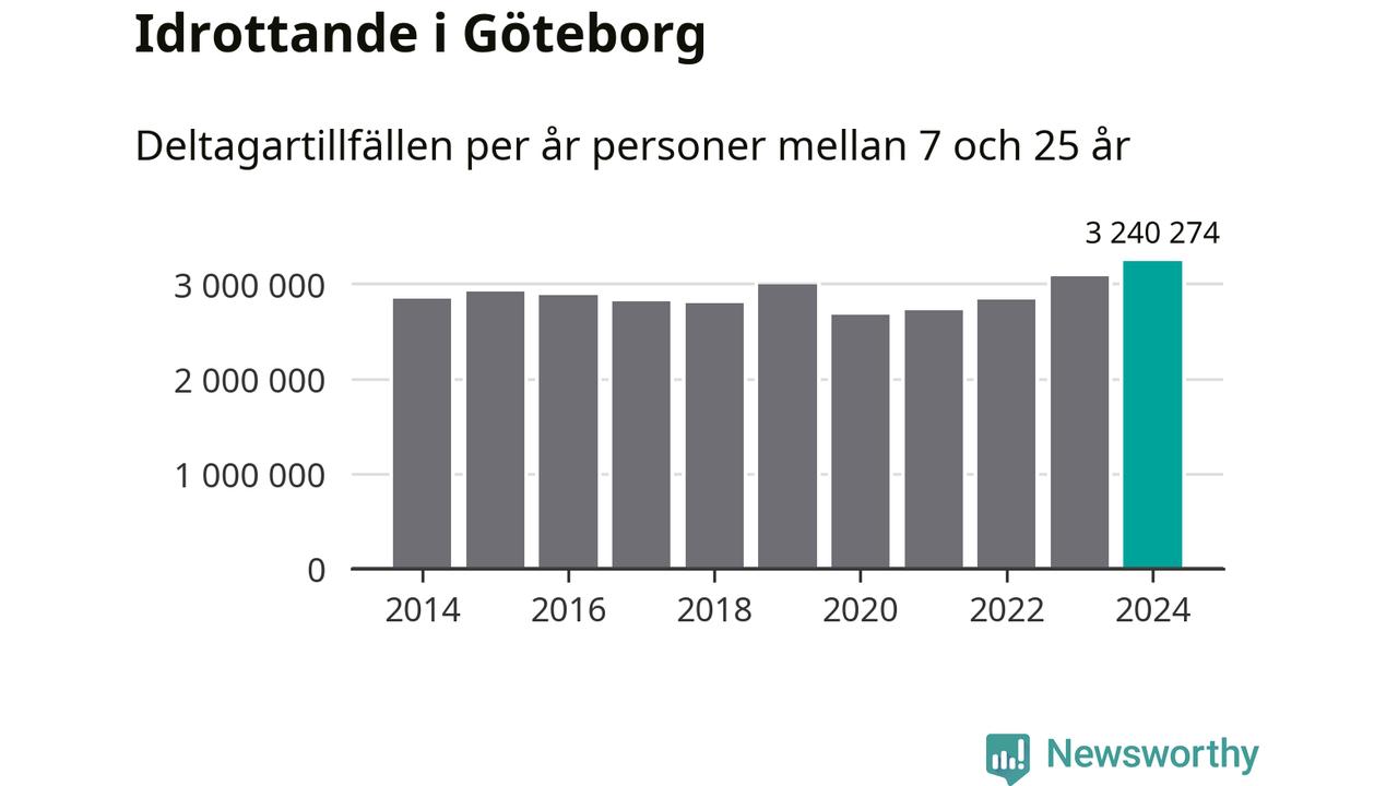 För tredje året i rad ökade aktiviteten inom ungdomsidrotten i Göteborg under 2024. Det visar nya siffror om utbetalt Lok-stöd, som delas ut till föreningar anslutna till Riksidrottsförbundet specialidrottsförbund. Stödet riktar sig till föreningar som bedriver verksamhet för deltagare i åldern 7-25 år. Under året rapporterade föreningarna i Göteborg runt 3 240 000 deltagartillfällen, vilket är en ökning med fem procent jämfört med 2023, och den högsta siffran i kommunen sedan åtminstone 2014. I riket som helhet ökade antalet deltagartillfällen med fem procent under 2024.