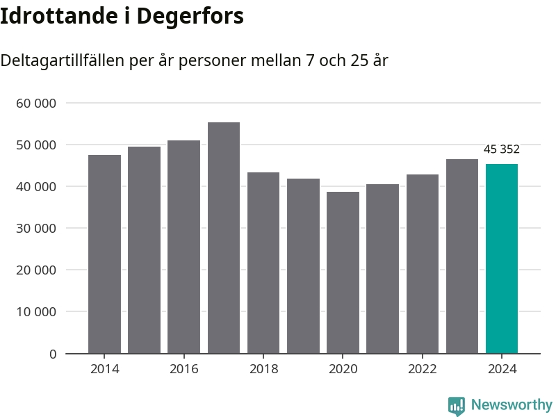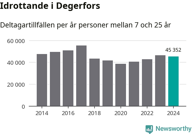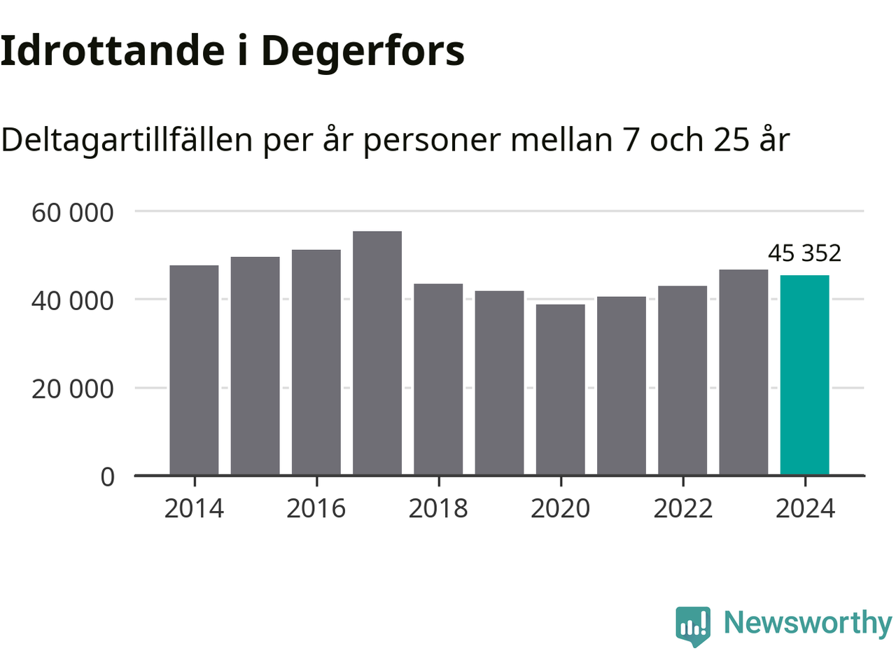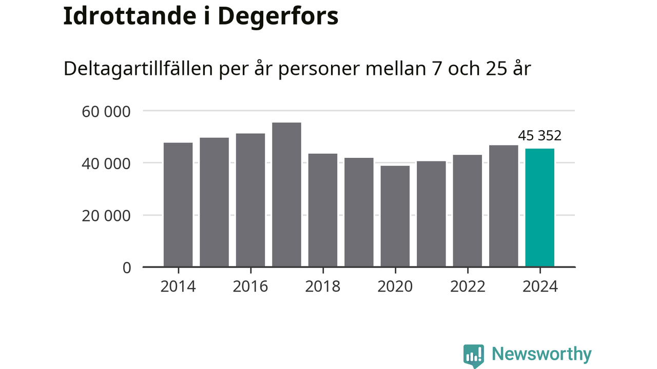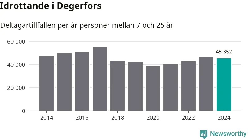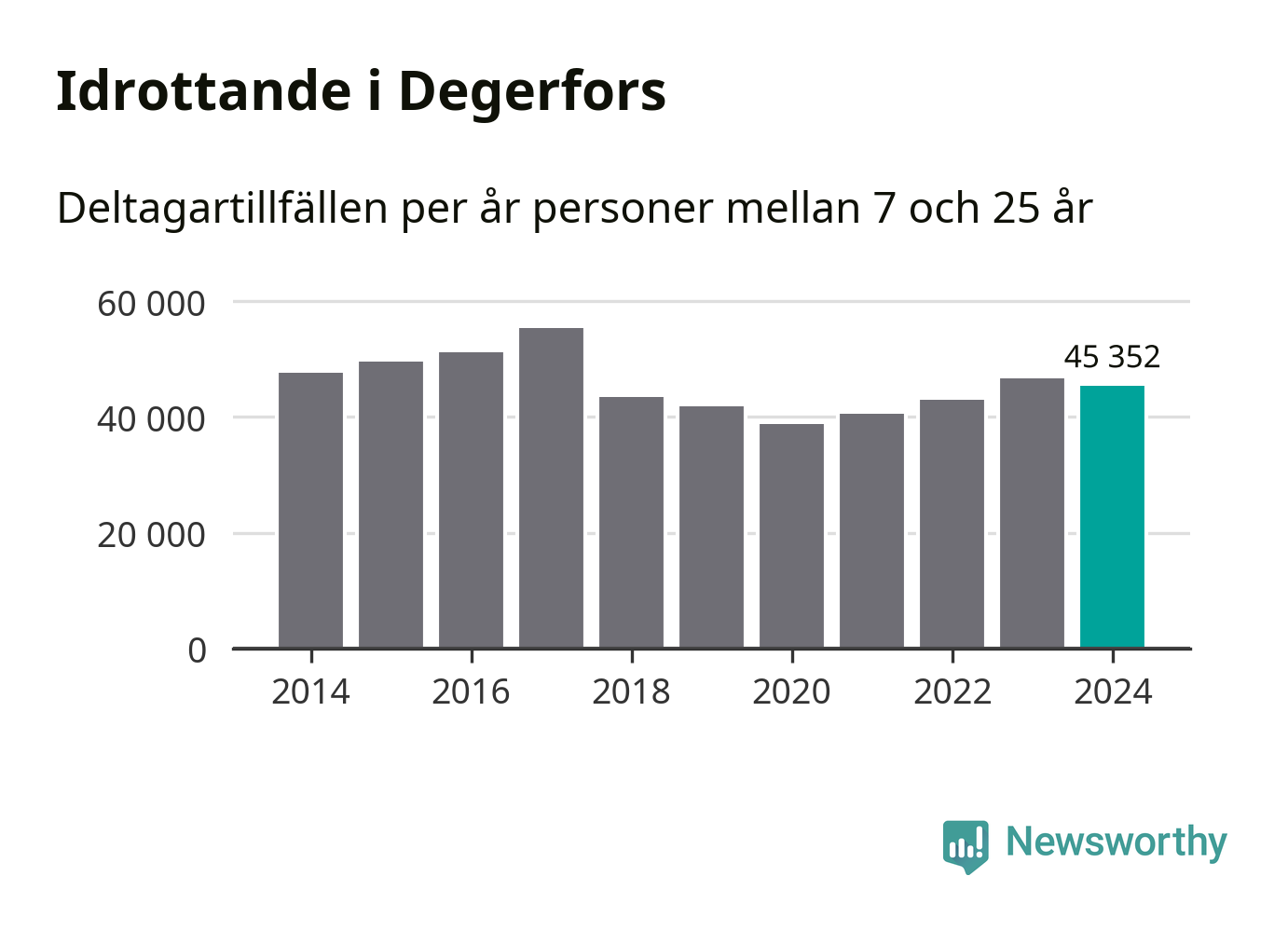 Degerfors-ungdomarna idrottade mindre under 2024. Det visar nya siffror om utbetalt Lok-stöd, som delas ut till föreningar anslutna till Riksidrottsförbundet specialidrottsförbund. Stödet riktar sig till föreningar som bedriver verksamhet för deltagare i åldern 7-25 år. Under året rapporterade föreningarna i Degerfors runt 45 000 deltagartillfällen, vilket är en minskning med tre procent jämfört med 2023. I riket som helhet ökade antalet deltagartillfällen med fem procent under 2024.