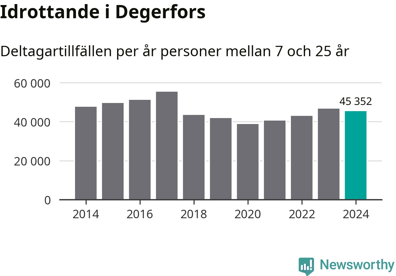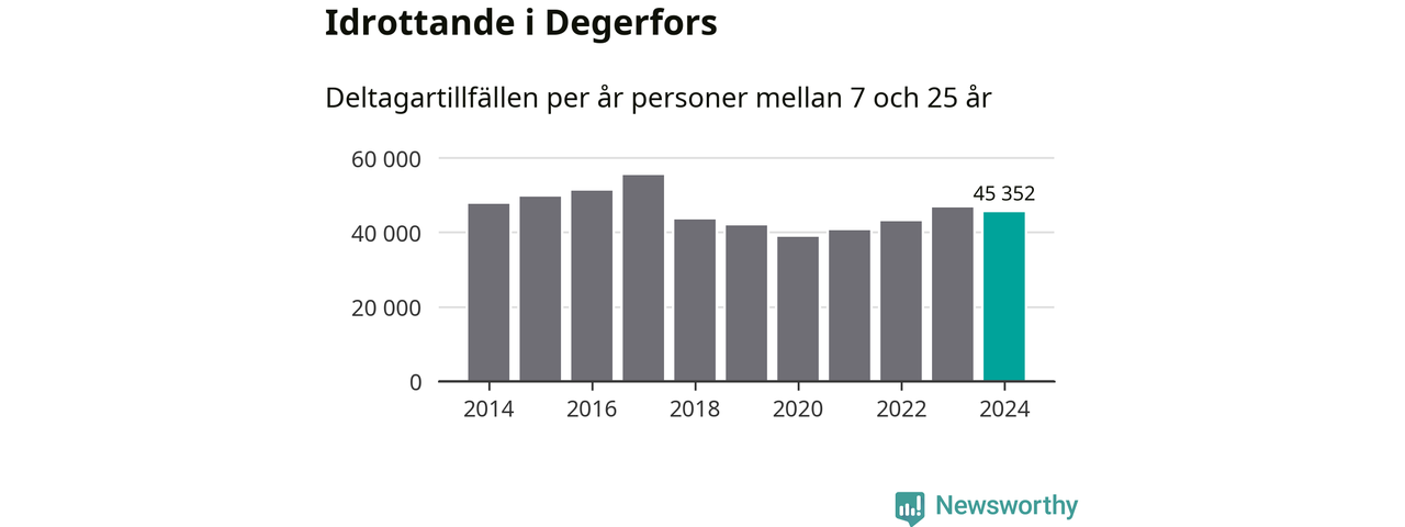 De 45 000 deltagartillfällen innebär att varje invånare i Degerfors mellan 7 och 25 år i snitt deltog i 26 träningar, matcher eller turneringar under 2024. Flest deltagartillfällen per invånare i Örebro län hade Lindesbergs kommun med 29 deltagartillfällen per invånare. I andra änden av listan finns Laxå kommun, 8 deltagartillfällen per invånare. Värt att nämna är att deltagartillfällena räknas i den kommun föreningen finns, det kan alltså vara ungdomar från en annan kommun som deltar.