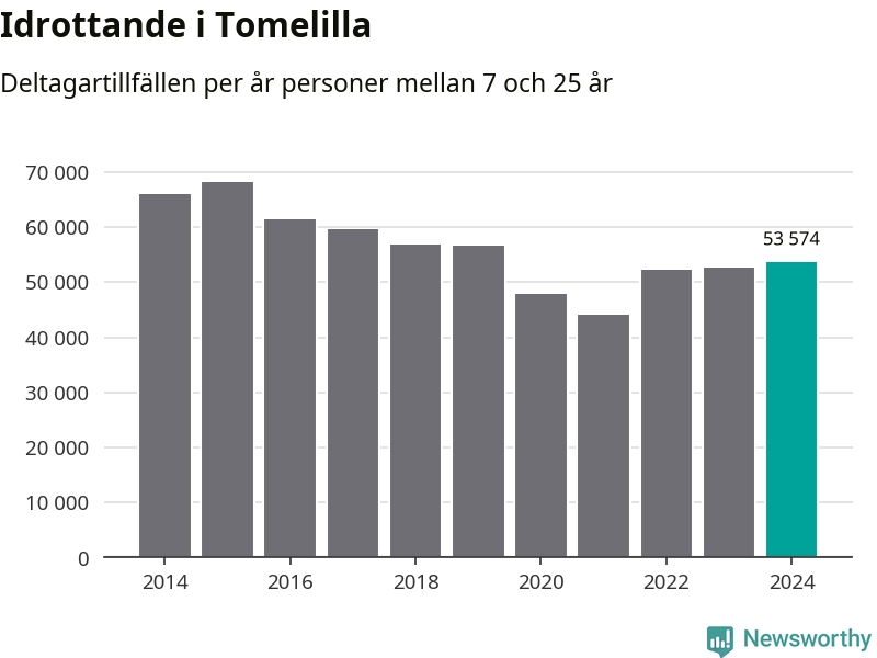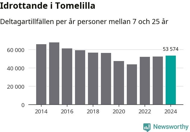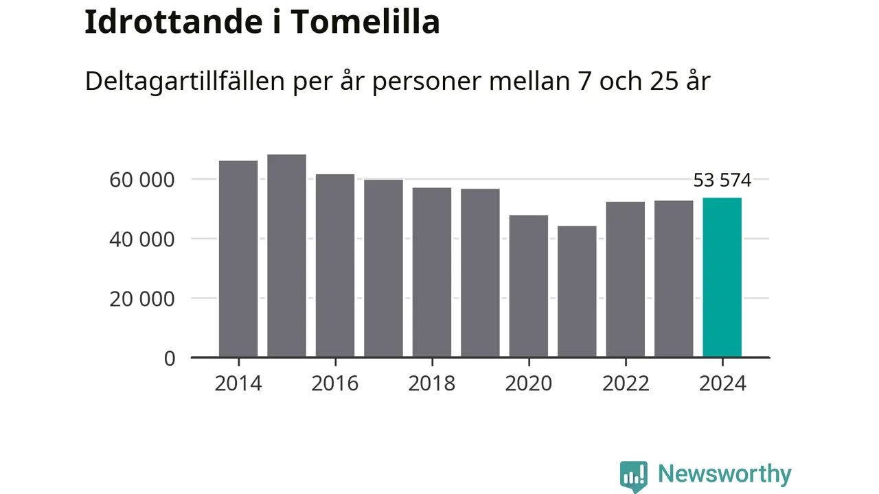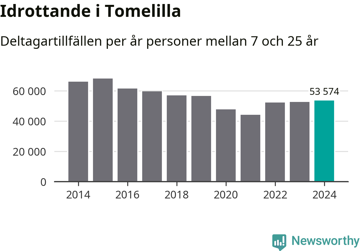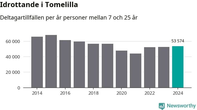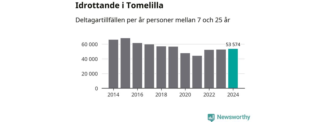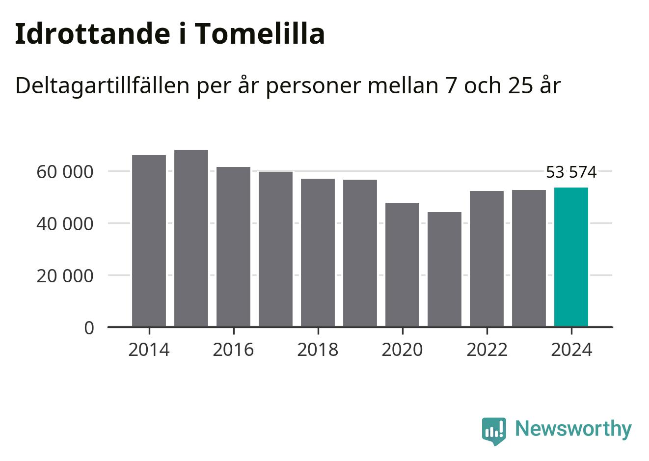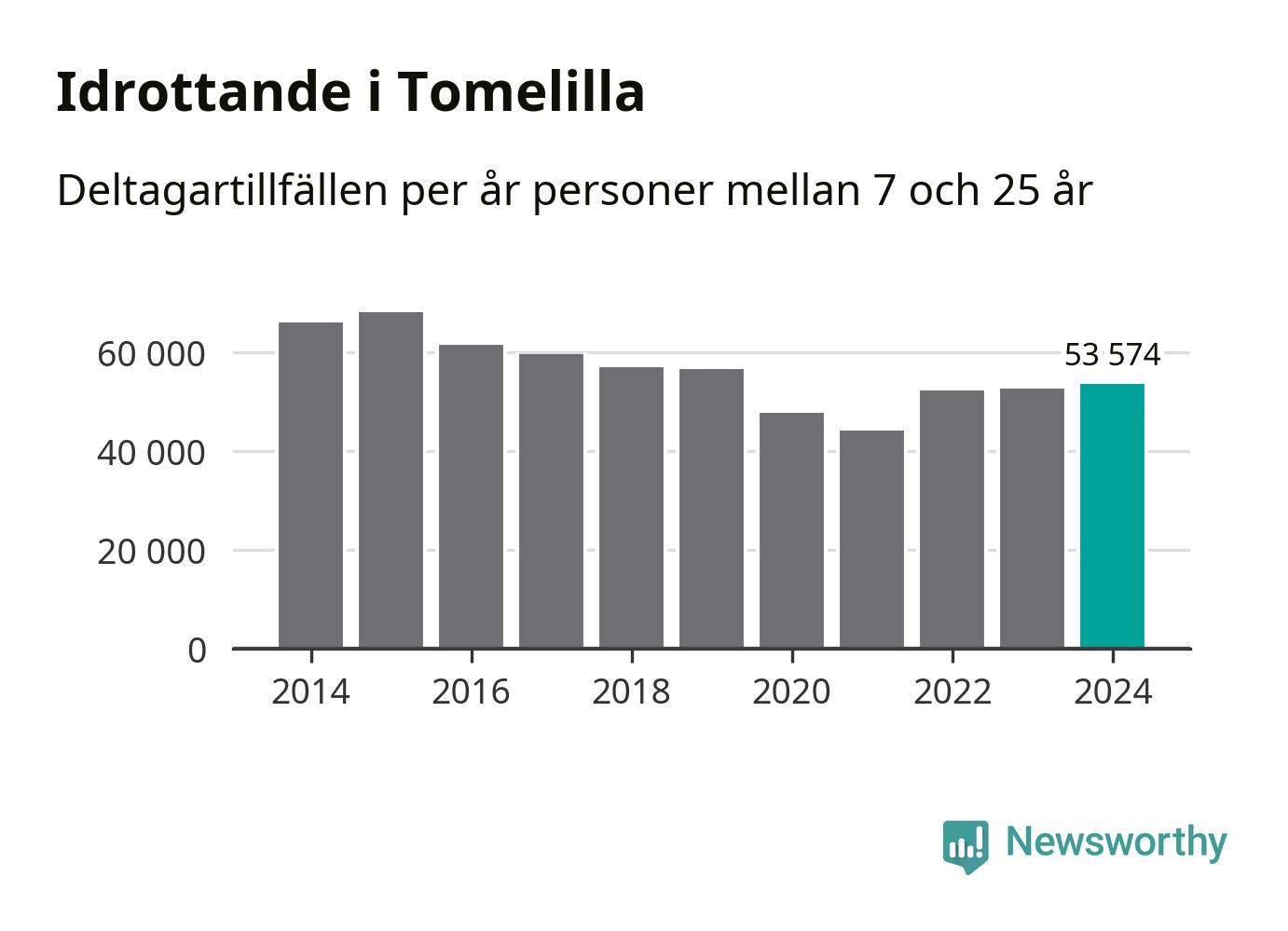 Idrottande Tomelillaungdomar registrerades för omkring 54 000 deltagartillfällen under 2024. Det är något fler än året innan. Det visar nya siffror om utbetalt Lok-stöd, som delas ut till föreningar anslutna till Riksidrottsförbundet specialidrottsförbund. Stödet riktar sig till föreningar som bedriver verksamhet för deltagare i åldern 7-25 år. I riket som helhet ökade antalet deltagartillfällen med fem procent under 2024.