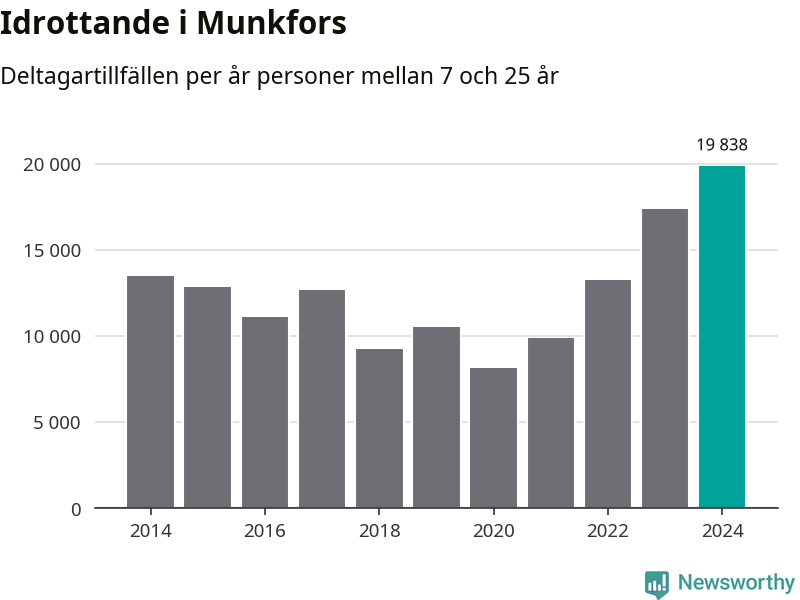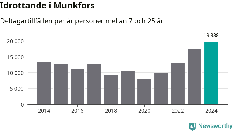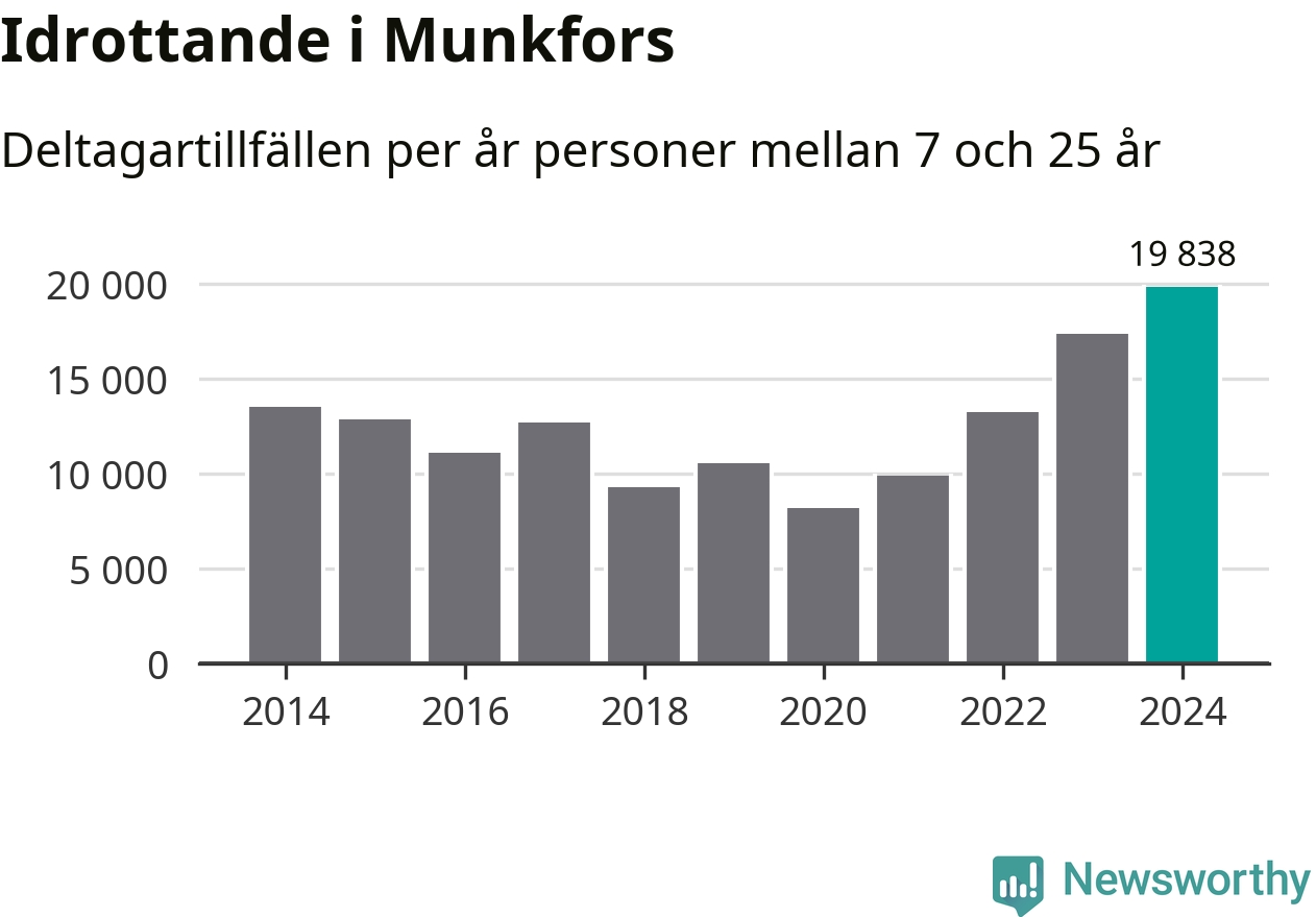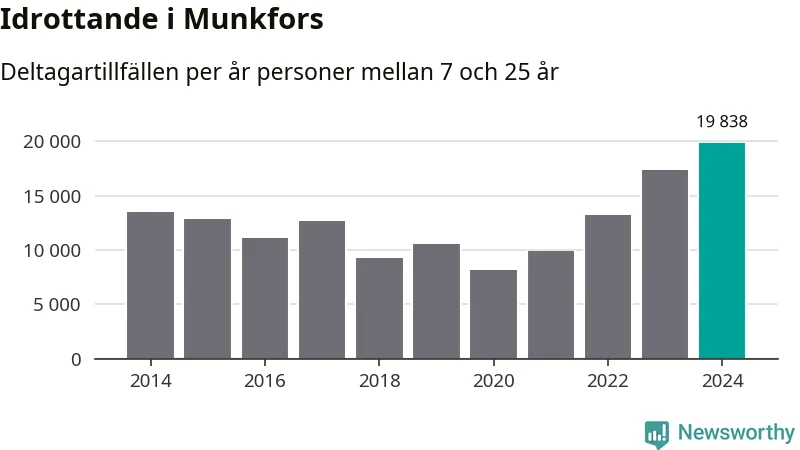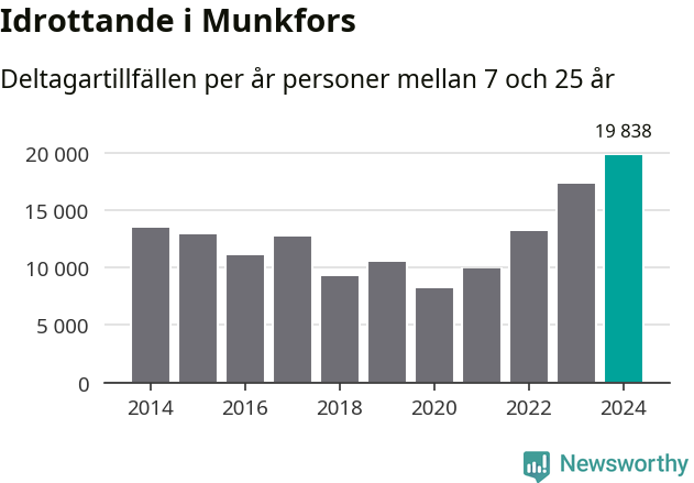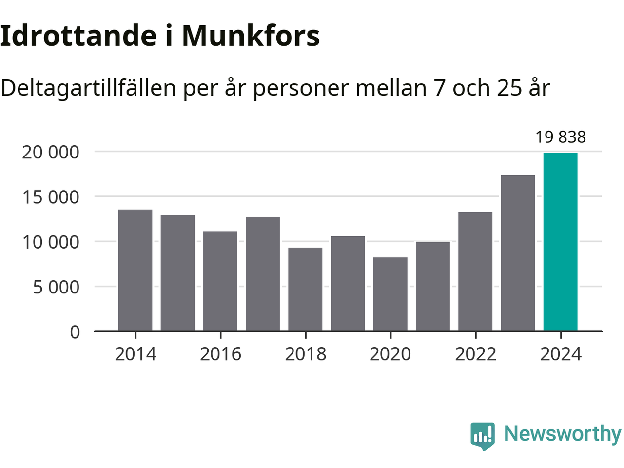För fjärde året i rad ökade aktiviteten inom ungdomsidrotten i Munkfors under 2024. Det visar nya siffror om utbetalt Lok-stöd, som delas ut till föreningar anslutna till Riksidrottsförbundet specialidrottsförbund. Stödet riktar sig till föreningar som bedriver verksamhet för deltagare i åldern 7-25 år. Under året rapporterade föreningarna i Munkfors runt 20 000 deltagartillfällen, vilket är en ökning med 14 procent jämfört med 2023, och den högsta siffran i kommunen sedan åtminstone 2014. I riket som helhet ökade antalet deltagartillfällen med fem procent under 2024.
