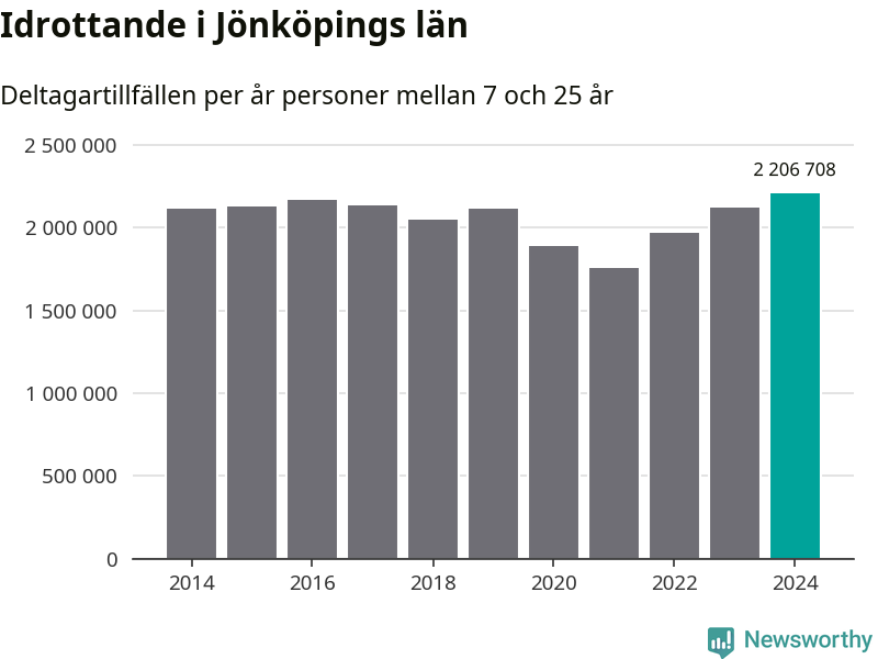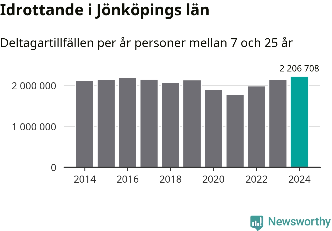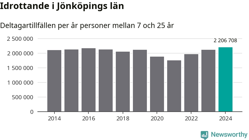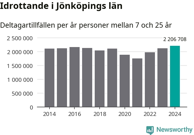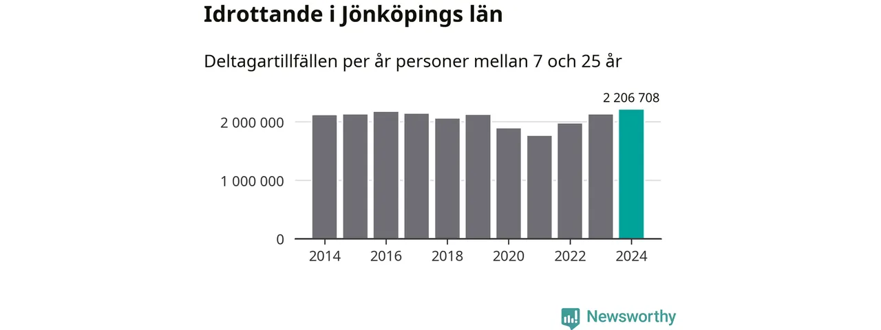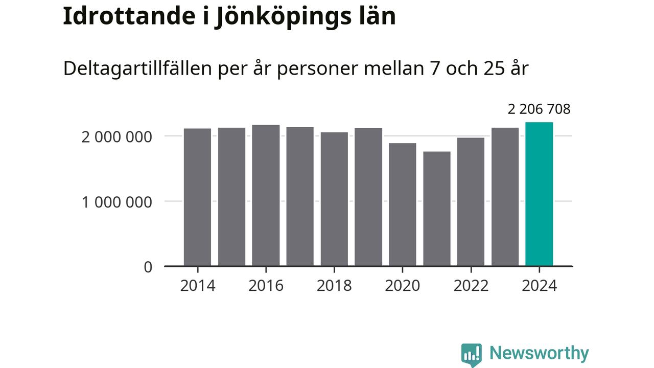 För tredje året i rad ökade aktiviteten inom ungdomsidrotten i Jönköpings län under 2024. Det visar nya siffror om utbetalt Lok-stöd, som delas ut till föreningar anslutna till Riksidrottsförbundet specialidrottsförbund. Stödet riktar sig till föreningar som bedriver verksamhet för deltagare i åldern 7-25 år. Under året rapporterade föreningarna i Jönköpings län runt 2 207 000 deltagartillfällen, vilket är en ökning med fyra procent jämfört med 2023, och den högsta siffran i länet sedan åtminstone 2014. I riket som helhet ökade antalet deltagartillfällen med fem procent under 2024.