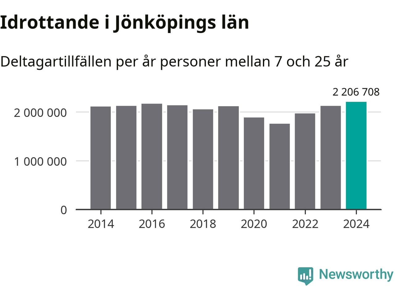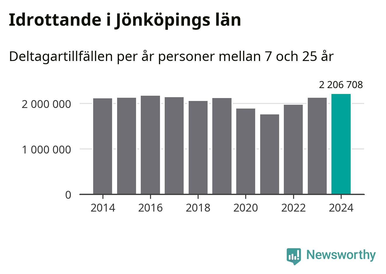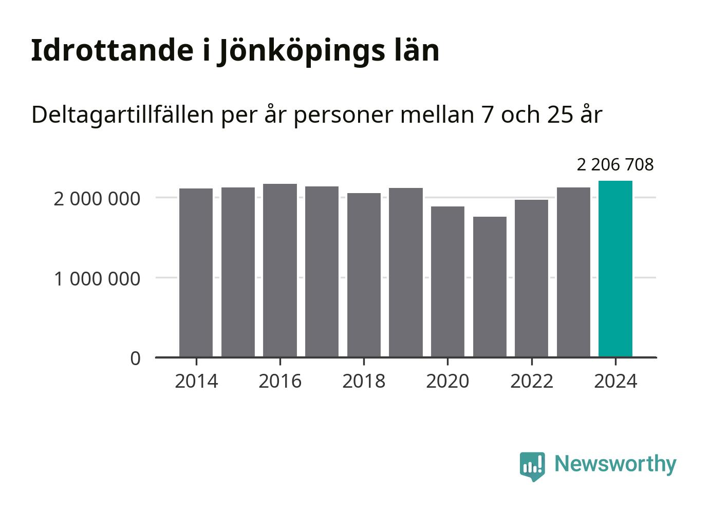 För tredje året i rad ökade aktiviteten inom ungdomsidrotten i Jönköpings län under 2024. Det visar nya siffror om utbetalt Lok-stöd, som delas ut till föreningar anslutna till Riksidrottsförbundet specialidrottsförbund. Stödet riktar sig till föreningar som bedriver verksamhet för deltagare i åldern 7-25 år. Under året rapporterade föreningarna i Jönköpings län runt 2 207 000 deltagartillfällen, vilket är en ökning med fyra procent jämfört med 2023, och den högsta siffran i länet sedan åtminstone 2014. I riket som helhet ökade antalet deltagartillfällen med fem procent under 2024.