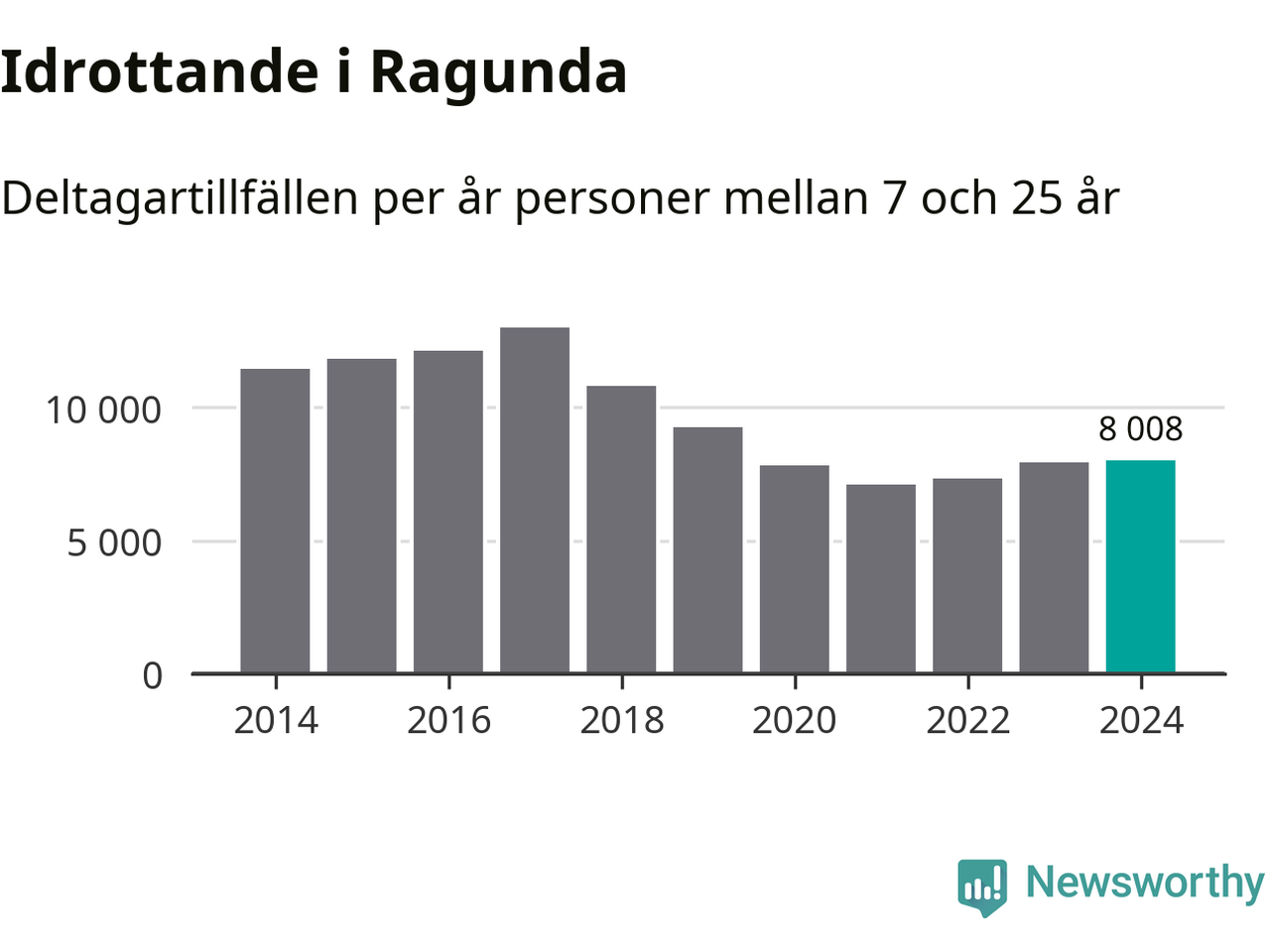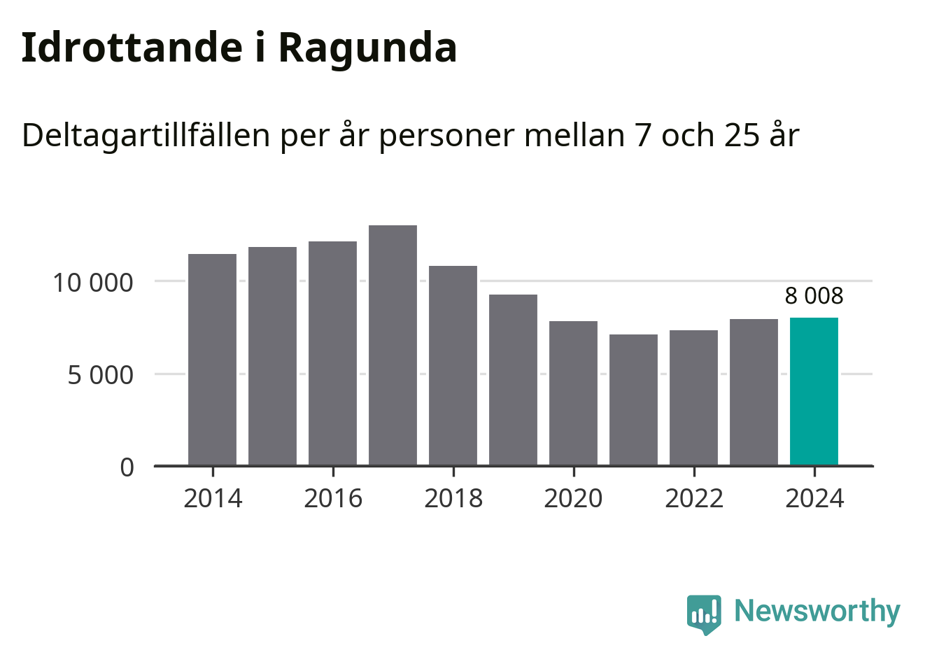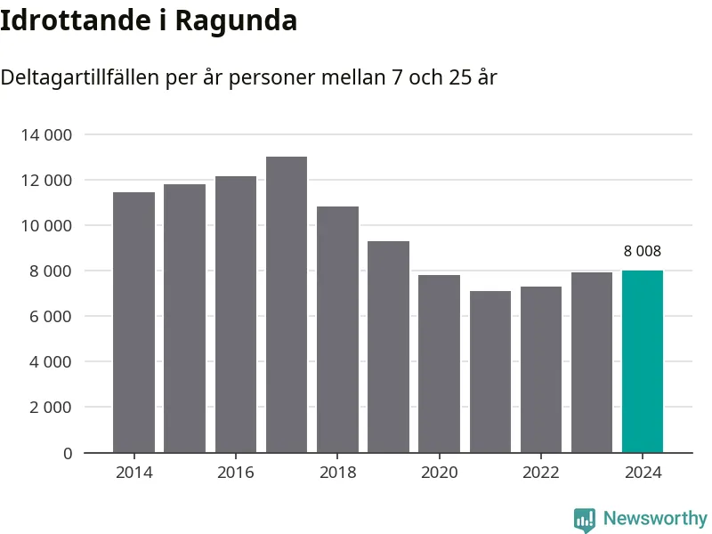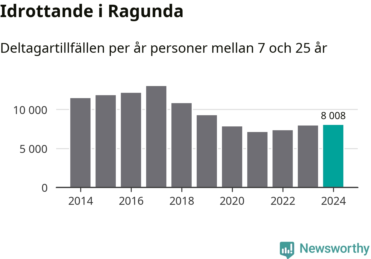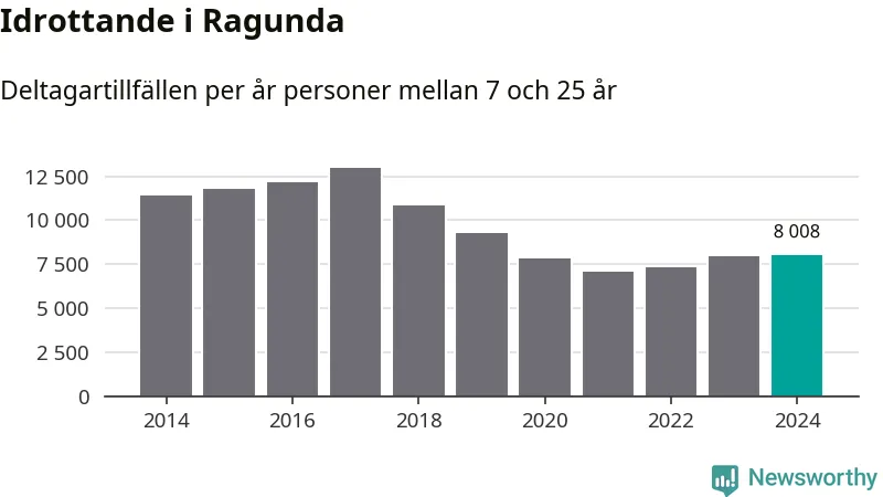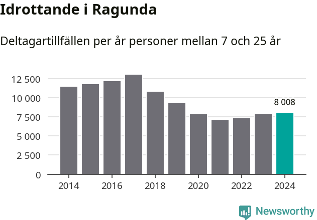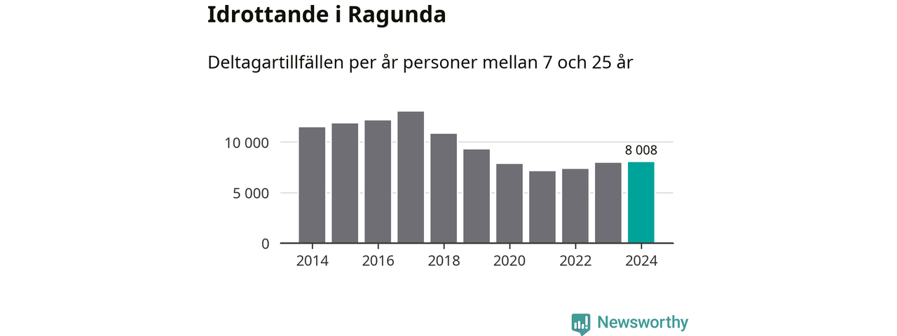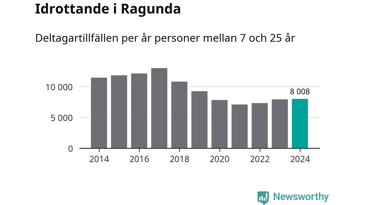 Idrottande Ragundaungdomar registrerades för omkring 8 000 deltagartillfällen under 2024. Det är något fler än året innan. Det visar nya siffror om utbetalt Lok-stöd, som delas ut till föreningar anslutna till Riksidrottsförbundet specialidrottsförbund. Stödet riktar sig till föreningar som bedriver verksamhet för deltagare i åldern 7-25 år. I riket som helhet ökade antalet deltagartillfällen med fem procent under 2024.