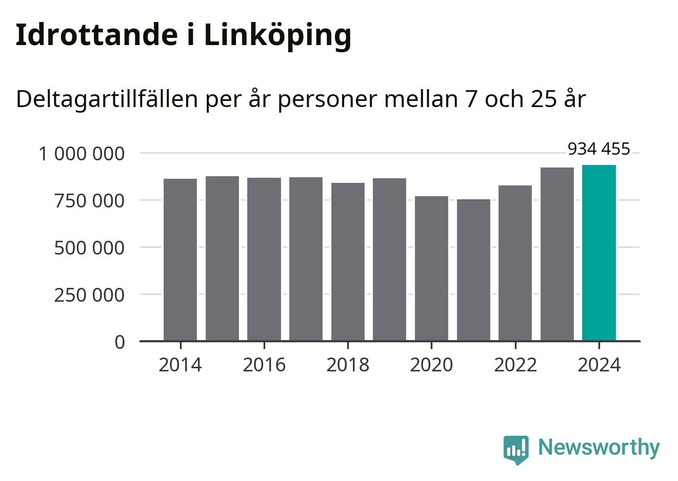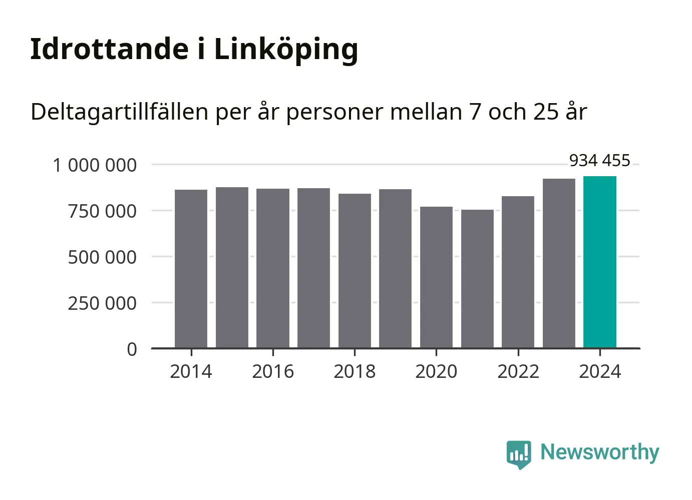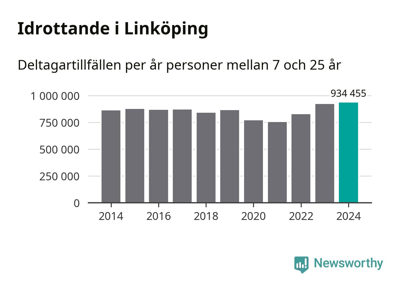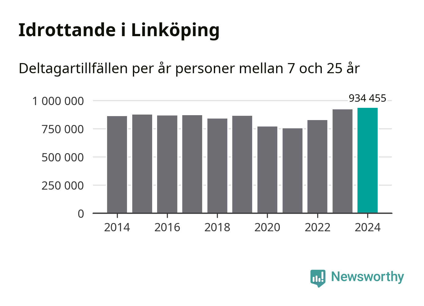 Idrottande Linköpingsungdomar registrerades för omkring 934 000 deltagartillfällen under 2024. Det är något fler än året innan och den högsta siffran i kommunen sedan åtminstone 2014. Det visar nya siffror om utbetalt Lok-stöd, som delas ut till föreningar anslutna till Riksidrottsförbundet specialidrottsförbund. Stödet riktar sig till föreningar som bedriver verksamhet för deltagare i åldern 7-25 år. I riket som helhet ökade antalet deltagartillfällen med fem procent under 2024.