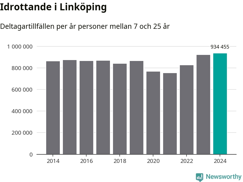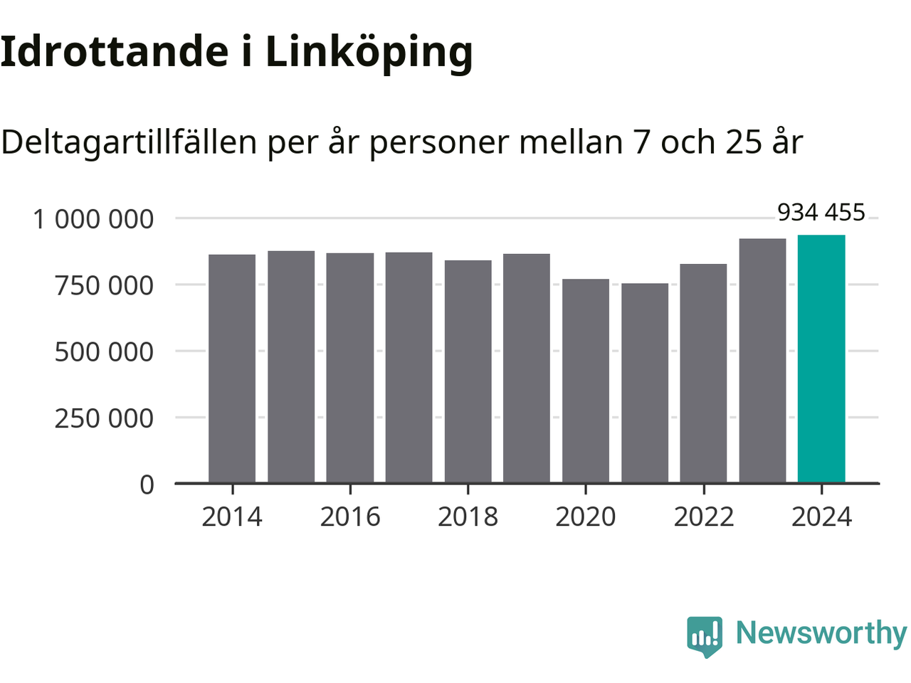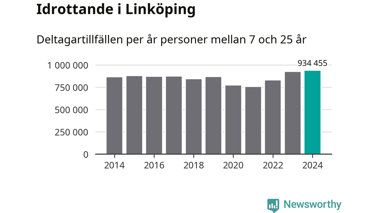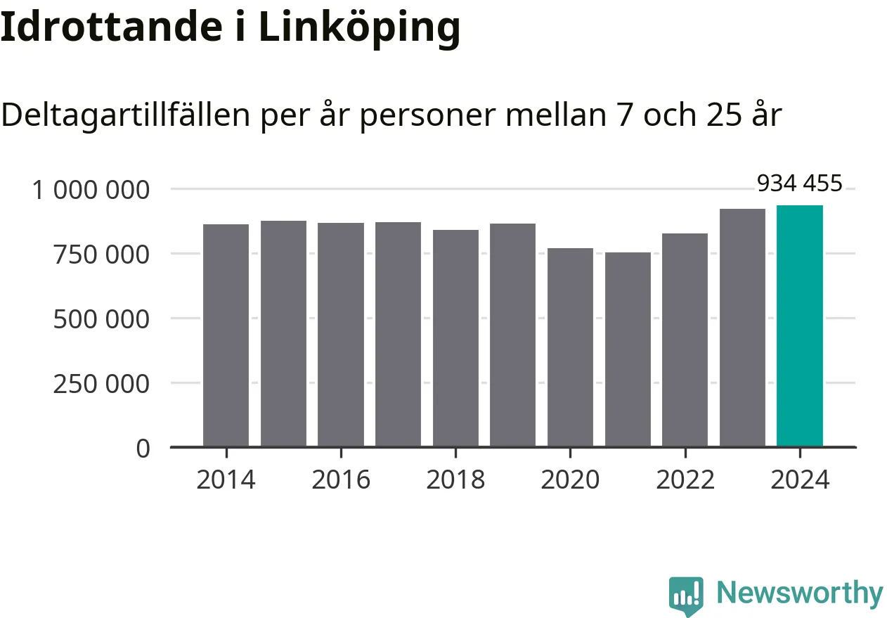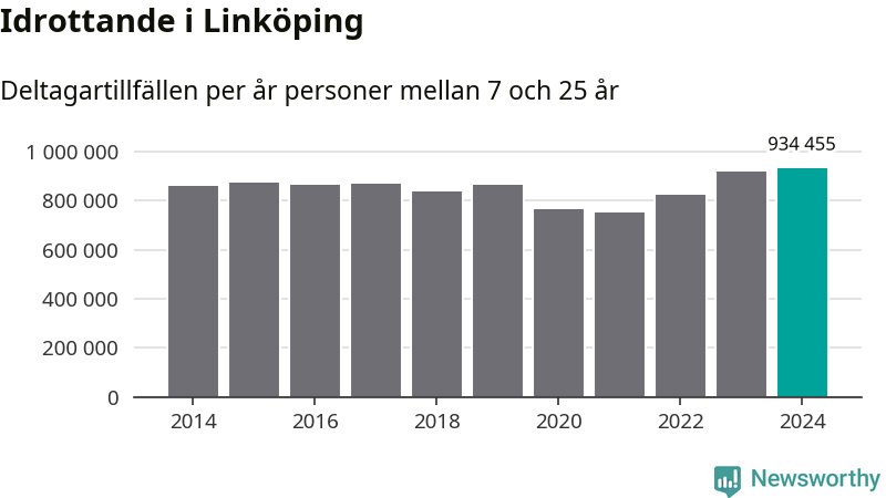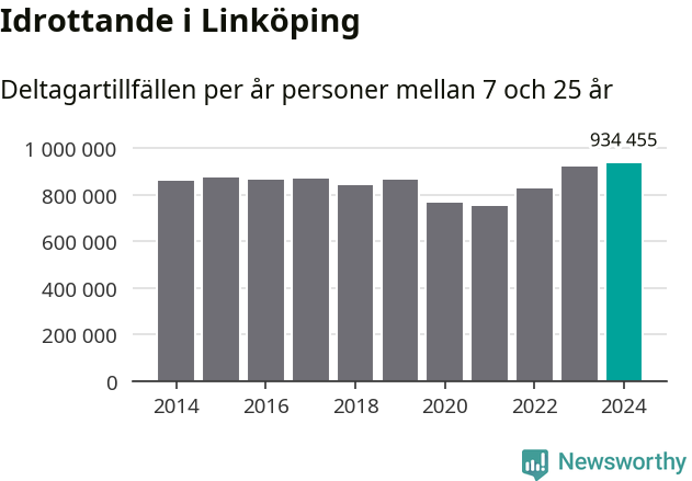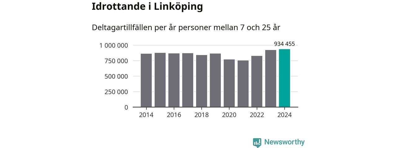 Idrottande Linköpingsungdomar registrerades för omkring 934 000 deltagartillfällen under 2024. Det är något fler än året innan och den högsta siffran i kommunen sedan åtminstone 2014. Det visar nya siffror om utbetalt Lok-stöd, som delas ut till föreningar anslutna till Riksidrottsförbundet specialidrottsförbund. Stödet riktar sig till föreningar som bedriver verksamhet för deltagare i åldern 7-25 år. I riket som helhet ökade antalet deltagartillfällen med fem procent under 2024.