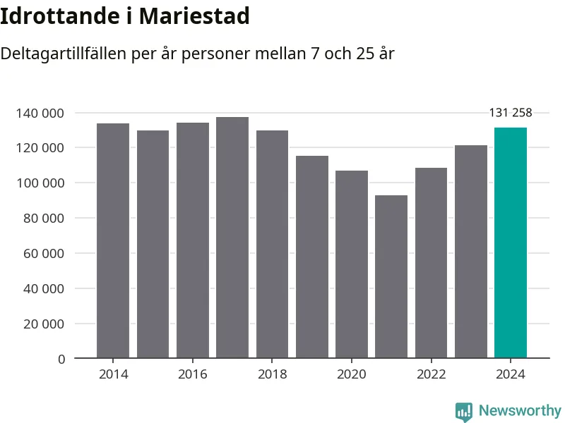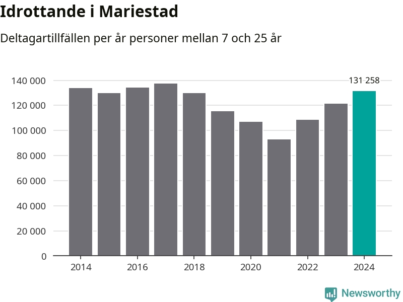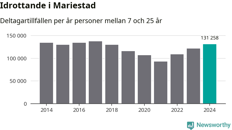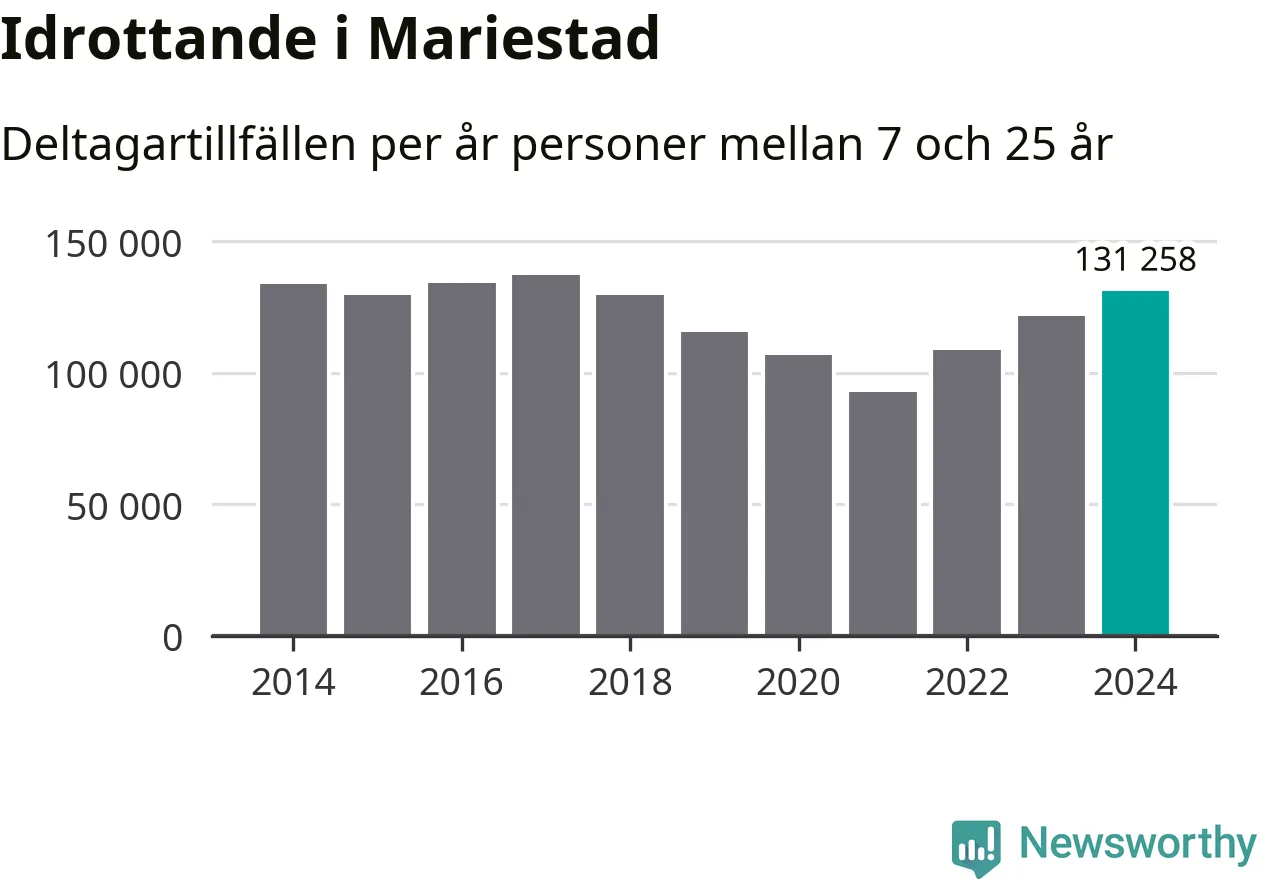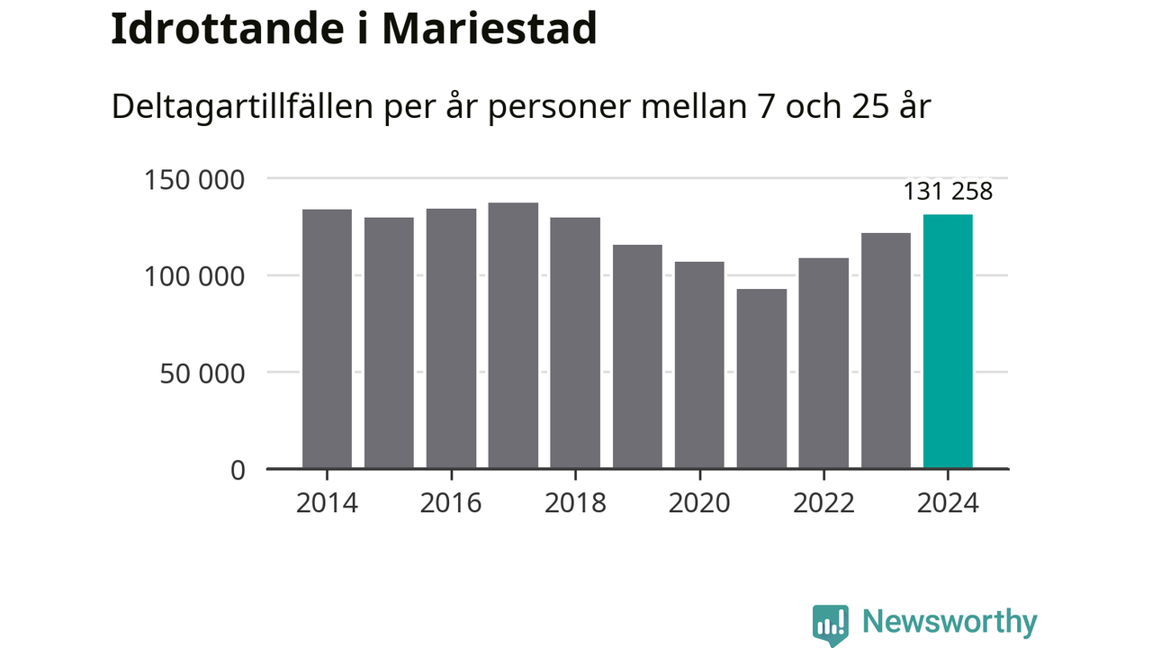 För tredje året i rad ökade aktiviteten inom ungdomsidrotten i Mariestad under 2024. Det visar nya siffror om utbetalt Lok-stöd, som delas ut till föreningar anslutna till Riksidrottsförbundet specialidrottsförbund. Stödet riktar sig till föreningar som bedriver verksamhet för deltagare i åldern 7-25 år. Under året rapporterade föreningarna i Mariestad runt 131 000 deltagartillfällen, vilket är en ökning med åtta procent jämfört med 2023 och den högsta siffran i kommunen sedan 2017. I riket som helhet ökade antalet deltagartillfällen med fem procent under 2024.