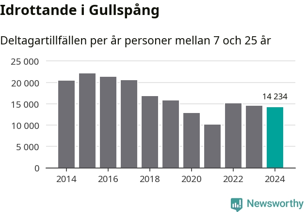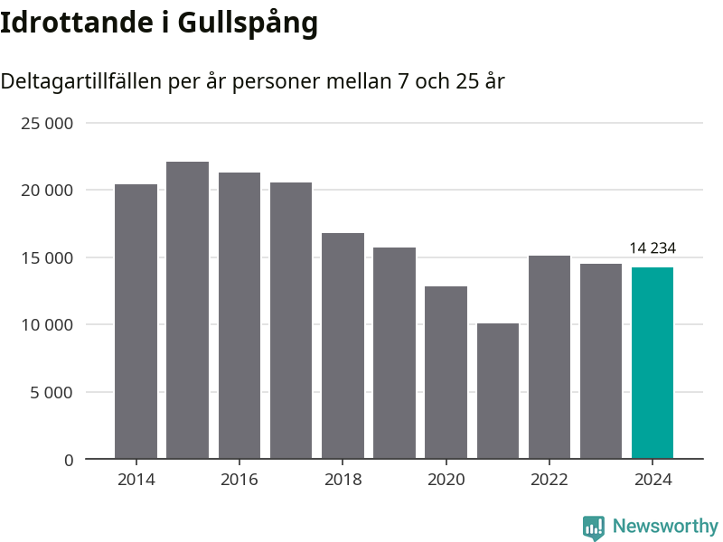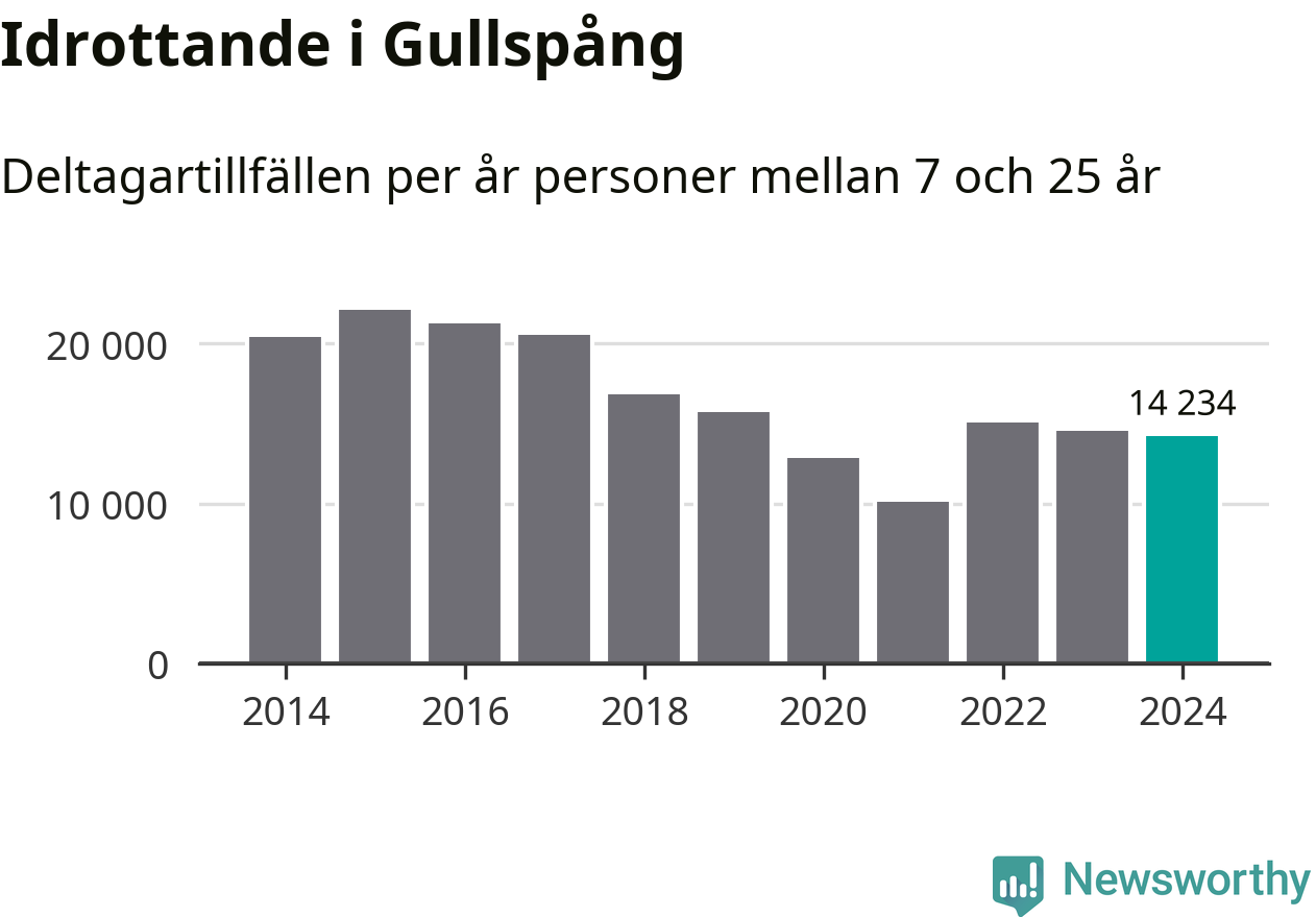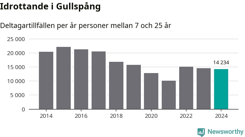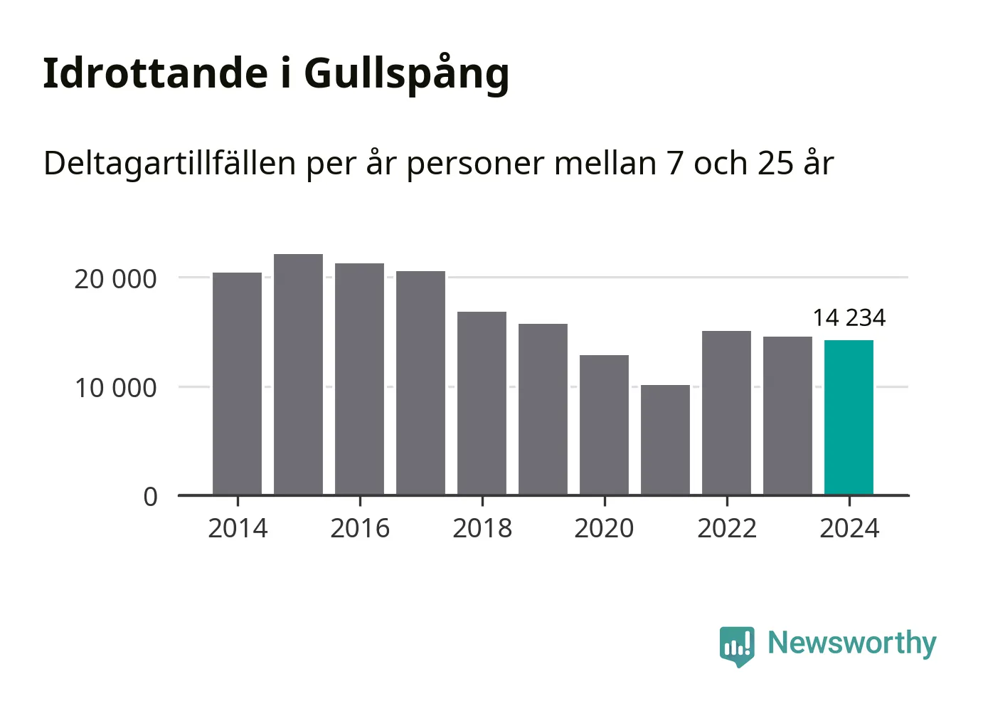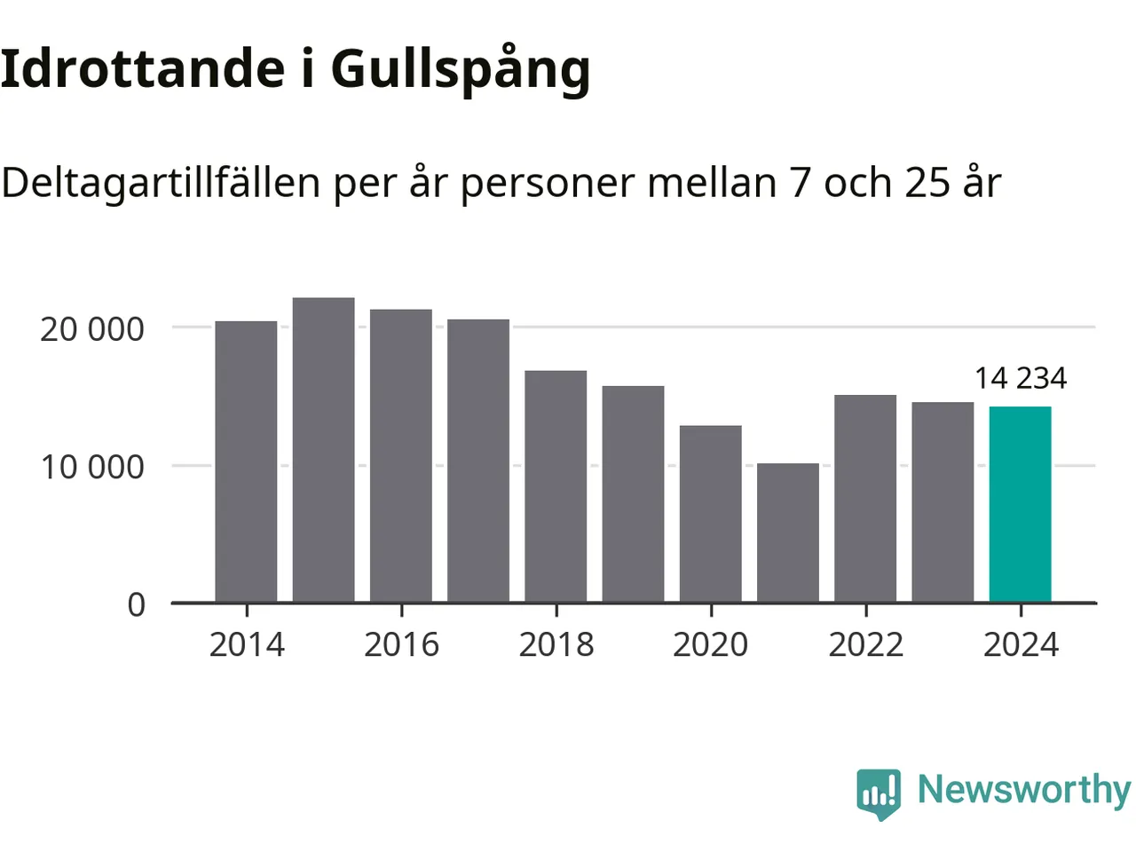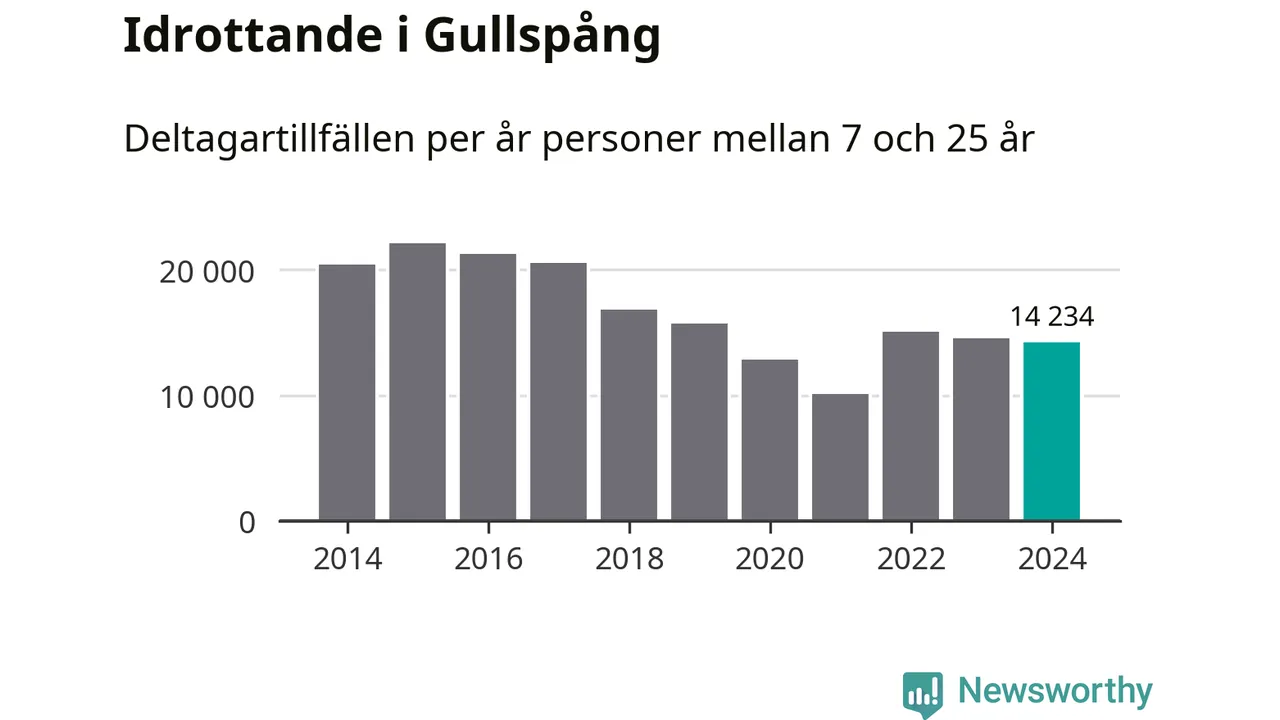 För andra året i rad minskade aktiviteten inom ungdomsidrotten i Gullspång under 2024. Det visar nya siffror om utbetalt Lok-stöd, som delas ut till föreningar anslutna till Riksidrottsförbundet specialidrottsförbund. Stödet riktar sig till föreningar som bedriver verksamhet för deltagare i åldern 7-25 år. Under året rapporterade föreningarna i Gullspång drygt 14 000 deltagartillfällen, vilket är en minskning med två procent jämfört med 2023. I riket som helhet ökade antalet deltagartillfällen med fem procent under 2024.