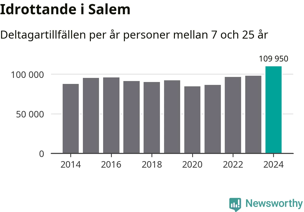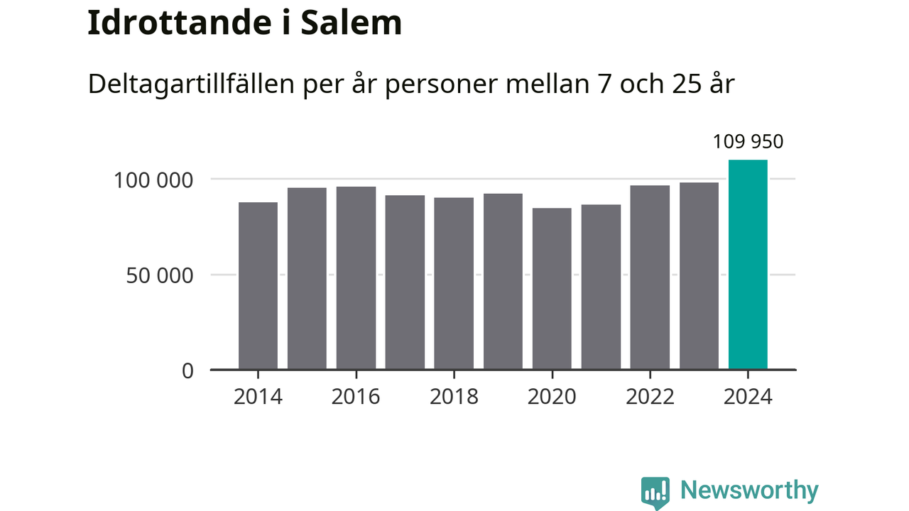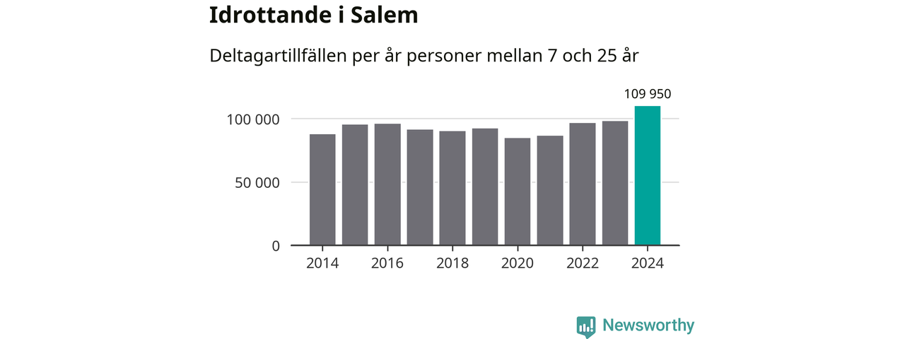 Salem-ungdomarna idrottade mer under 2024. Det visar nya siffror om utbetalt Lok-stöd, som delas ut till föreningar anslutna till Riksidrottsförbundet specialidrottsförbund. Stödet riktar sig till föreningar som bedriver verksamhet för deltagare i åldern 7-25 år. Under året rapporterade föreningarna i Salem runt 110 000 deltagartillfällen, vilket är en ökning med tolv procent jämfört med 2023, och den högsta siffran i kommunen sedan åtminstone 2014. I riket som helhet ökade antalet deltagartillfällen med fem procent under 2024.