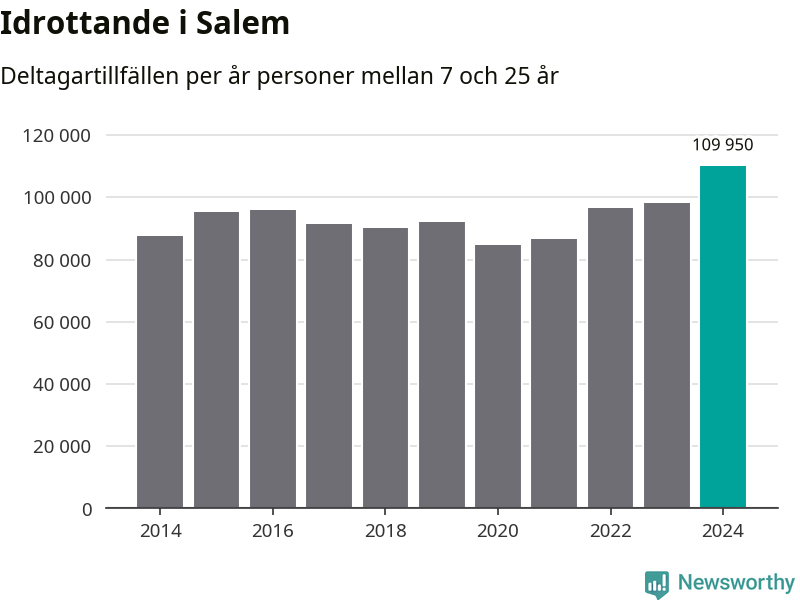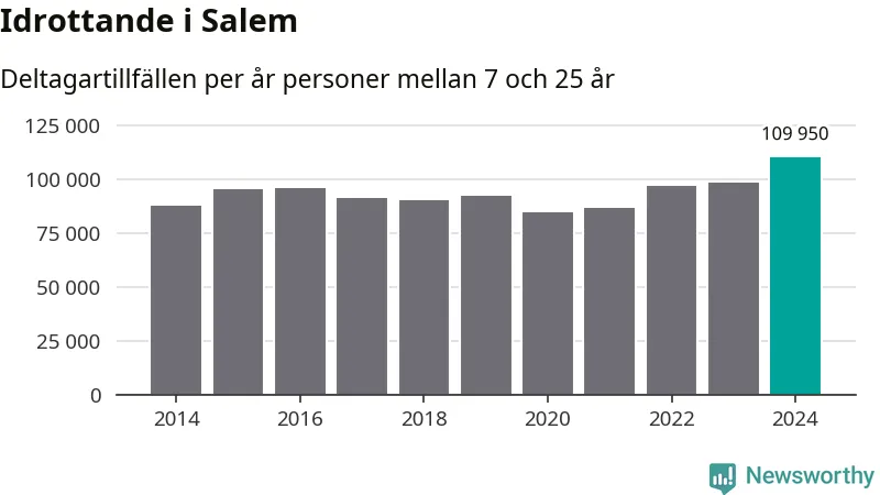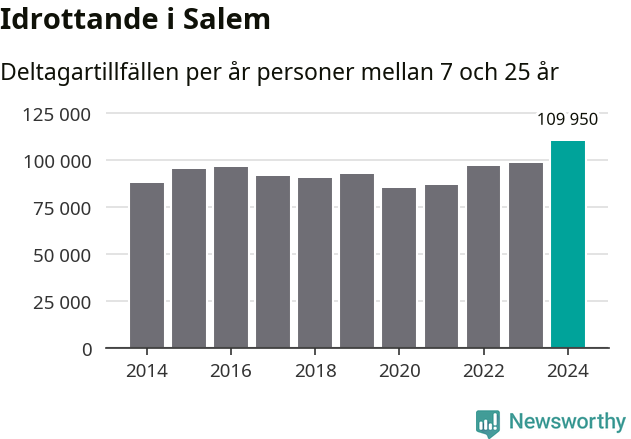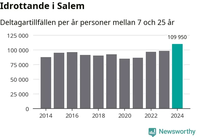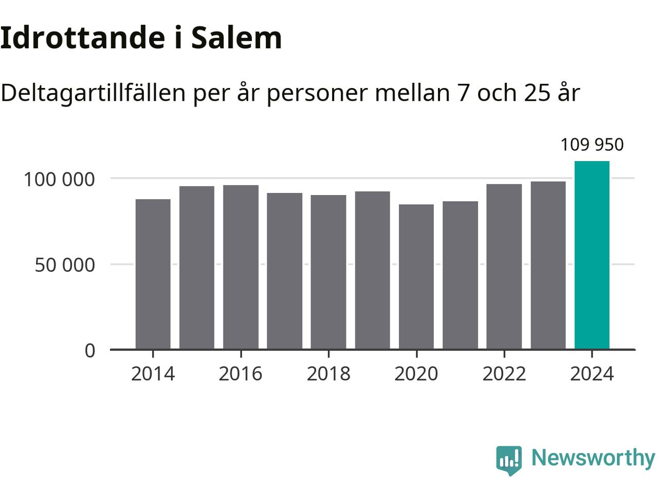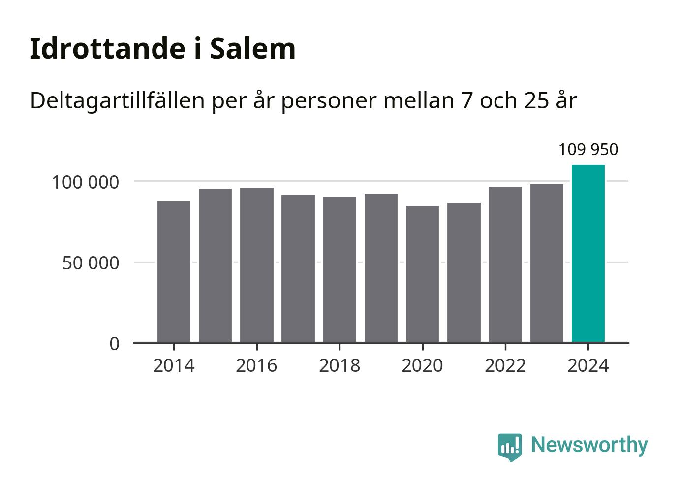Salem-ungdomarna idrottade mer under 2024. Det visar nya siffror om utbetalt Lok-stöd, som delas ut till föreningar anslutna till Riksidrottsförbundet specialidrottsförbund. Stödet riktar sig till föreningar som bedriver verksamhet för deltagare i åldern 7-25 år. Under året rapporterade föreningarna i Salem runt 110 000 deltagartillfällen, vilket är en ökning med tolv procent jämfört med 2023, och den högsta siffran i kommunen sedan åtminstone 2014. I riket som helhet ökade antalet deltagartillfällen med fem procent under 2024.