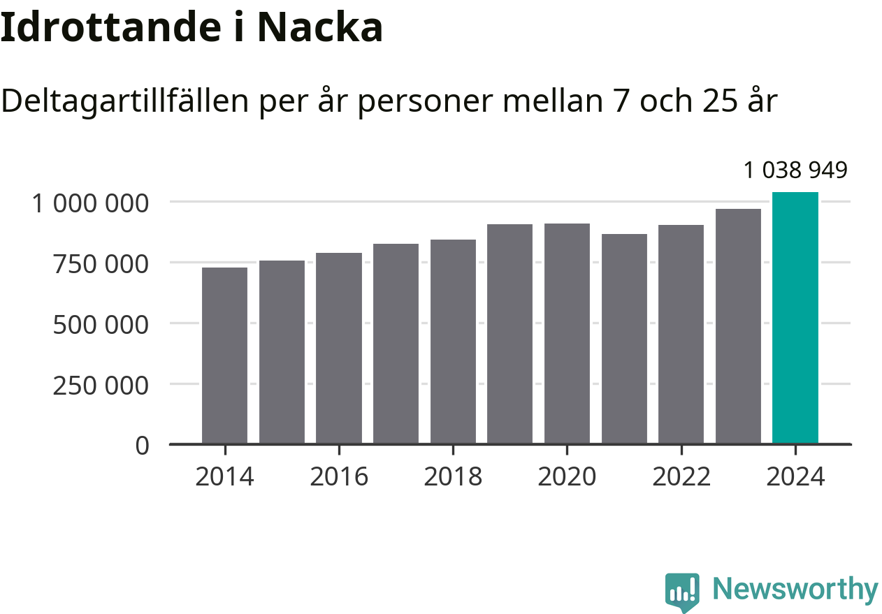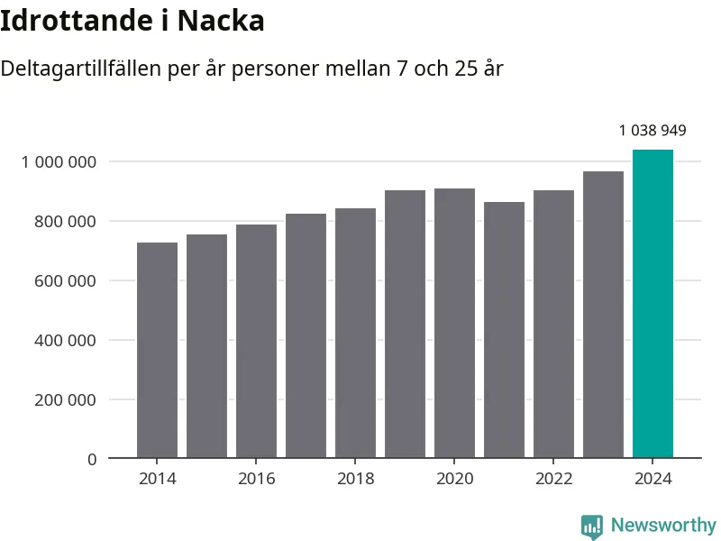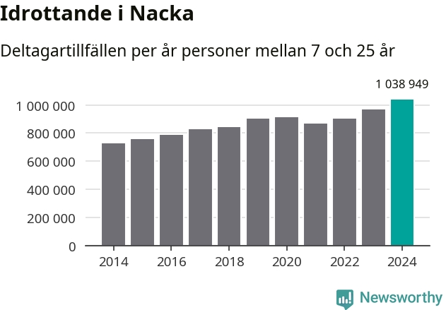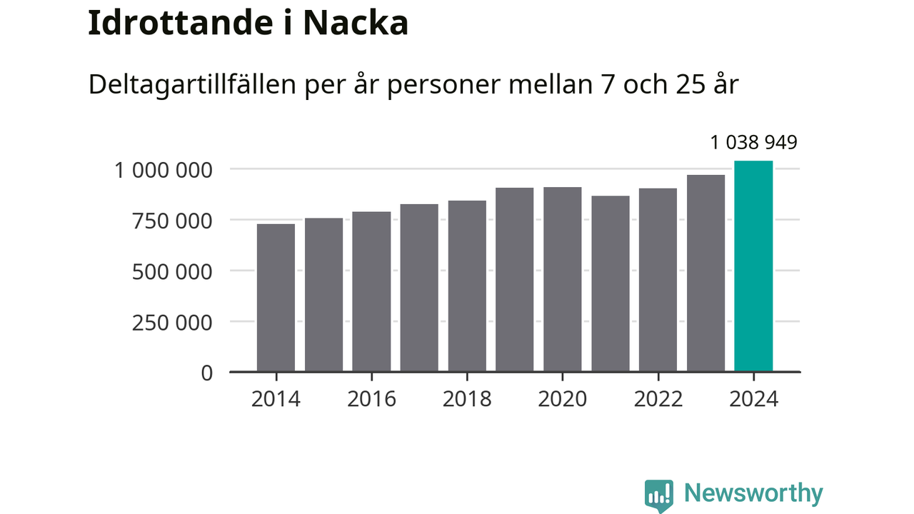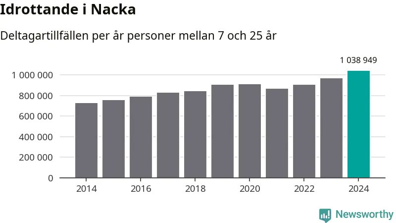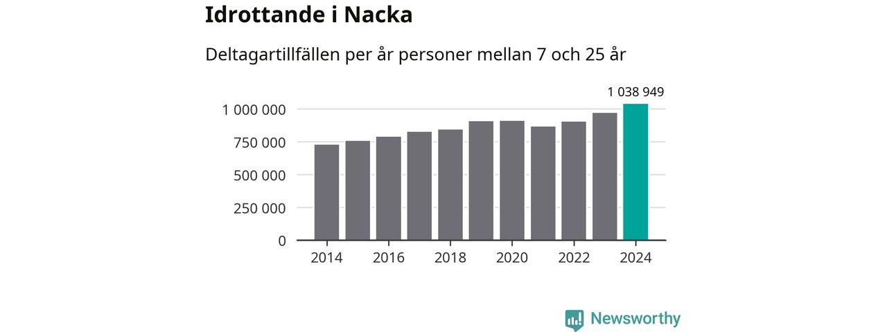 För tredje året i rad ökade aktiviteten inom ungdomsidrotten i Nacka under 2024. Det visar nya siffror om utbetalt Lok-stöd, som delas ut till föreningar anslutna till Riksidrottsförbundet specialidrottsförbund. Stödet riktar sig till föreningar som bedriver verksamhet för deltagare i åldern 7-25 år. Under året rapporterade föreningarna i Nacka runt 1 039 000 deltagartillfällen, vilket är en ökning med sju procent jämfört med 2023, och den högsta siffran i kommunen sedan åtminstone 2014. I riket som helhet ökade antalet deltagartillfällen med fem procent under 2024.