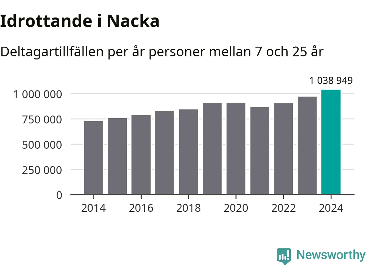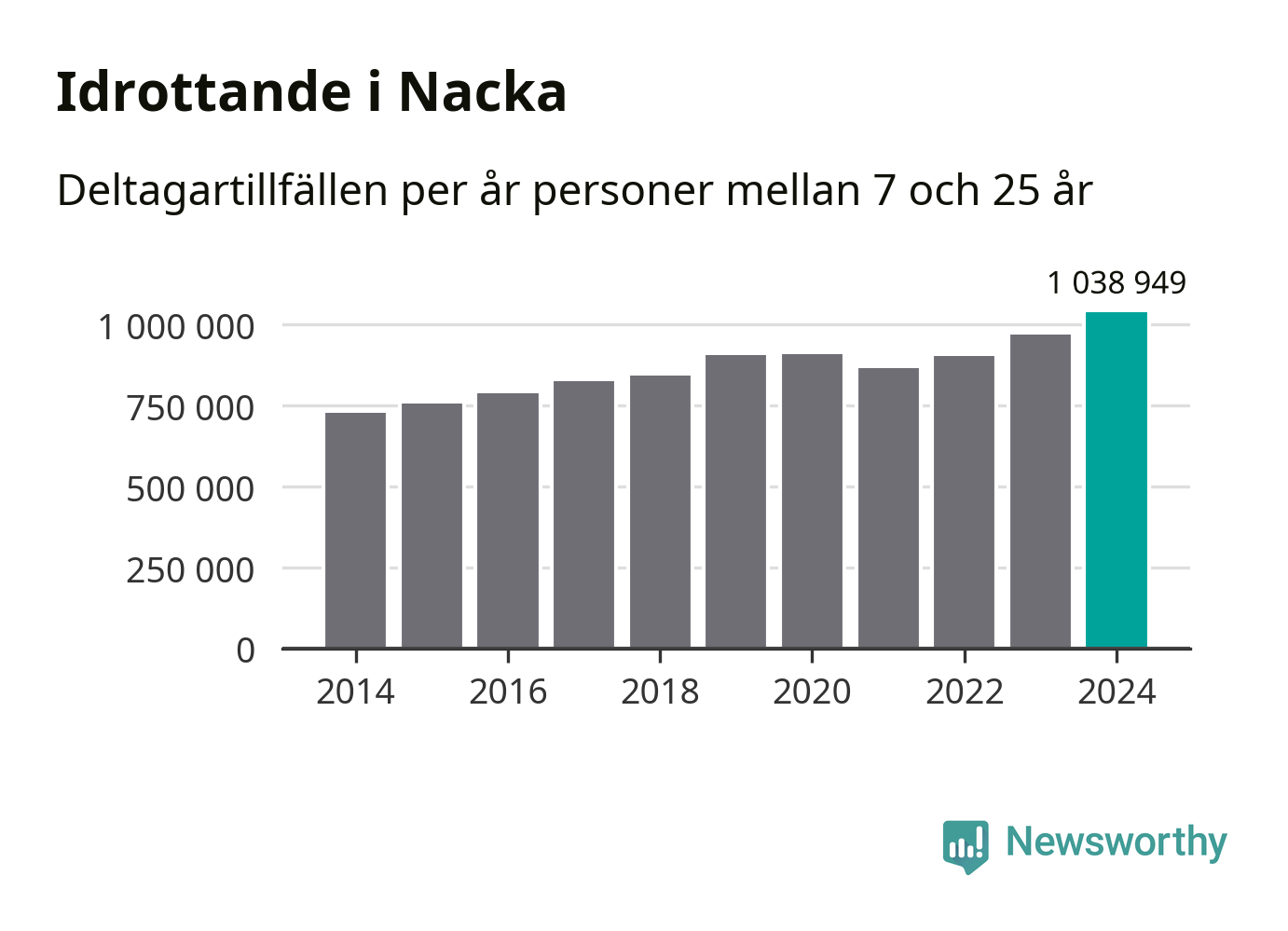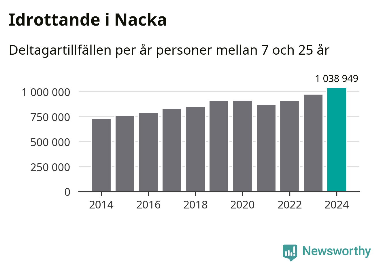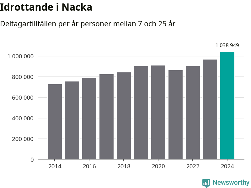 För tredje året i rad ökade aktiviteten inom ungdomsidrotten i Nacka under 2024. Det visar nya siffror om utbetalt Lok-stöd, som delas ut till föreningar anslutna till Riksidrottsförbundet specialidrottsförbund. Stödet riktar sig till föreningar som bedriver verksamhet för deltagare i åldern 7-25 år. Under året rapporterade föreningarna i Nacka runt 1 039 000 deltagartillfällen, vilket är en ökning med sju procent jämfört med 2023, och den högsta siffran i kommunen sedan åtminstone 2014. I riket som helhet ökade antalet deltagartillfällen med fem procent under 2024.
