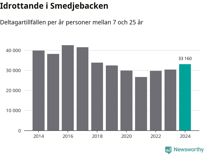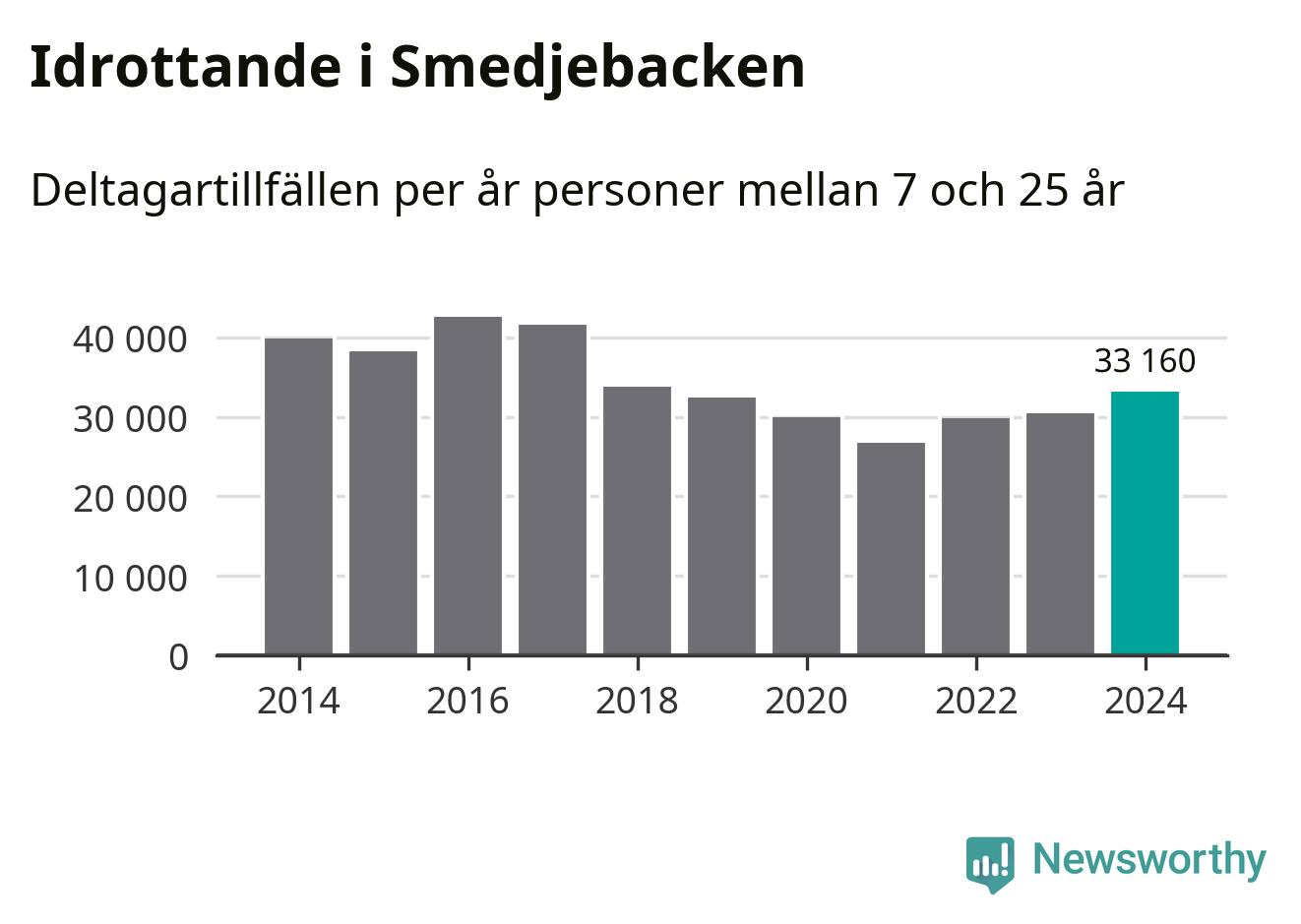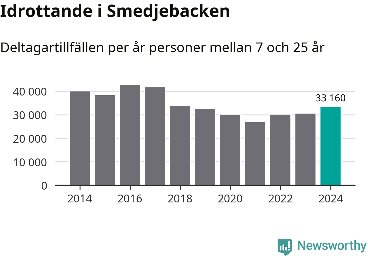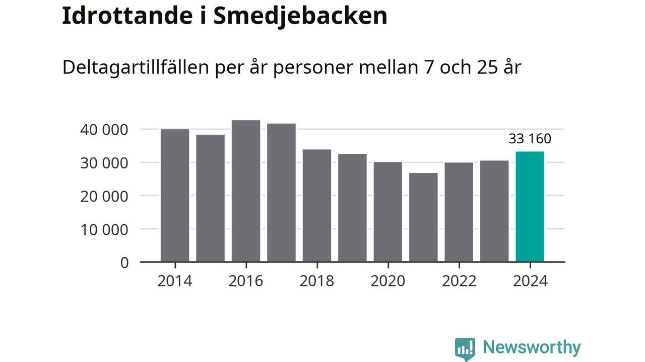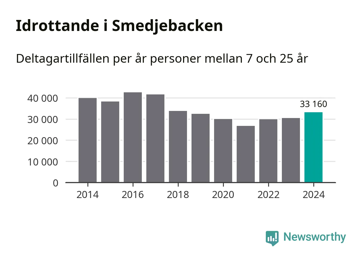 De 33 000 deltagartillfällen innebär att varje invånare i Smedjebacken mellan 7 och 25 år i snitt deltog i 17 träningar, matcher eller turneringar under 2024. Det är en relativt låg siffra, nationellt sett. Flest deltagartillfällen per invånare i Dalarna hade Leksands kommun med 32 deltagartillfällen per invånare. I andra änden av listan finns Älvdalens kommun, 16 deltagartillfällen per invånare. Värt att nämna är att deltagartillfällena räknas i den kommun föreningen finns, det kan alltså vara ungdomar från en annan kommun som deltar.