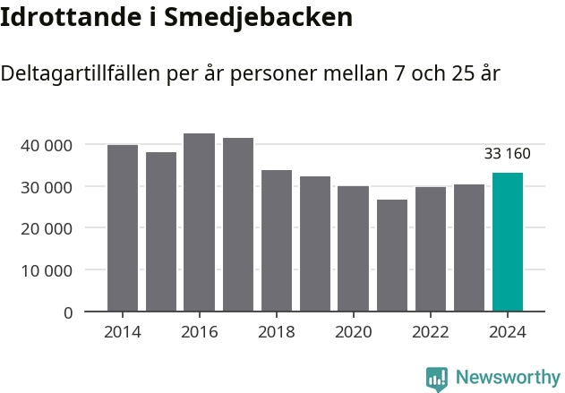Ungdomsidrotten drabbades hårt av pandemin. I Sverige minskade antalet deltagartillfällen med 13 procent och inte förrän 2023 nåddes samma nivåer som innan pandemin. Smedjebacken drabbades hårdare än riket som helhet – minskningen var 18 procent – och först under 2024 nådde man förpandeminivån igen.