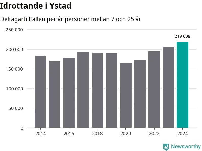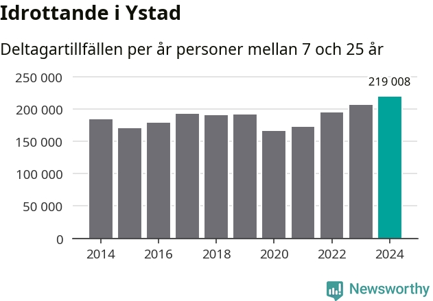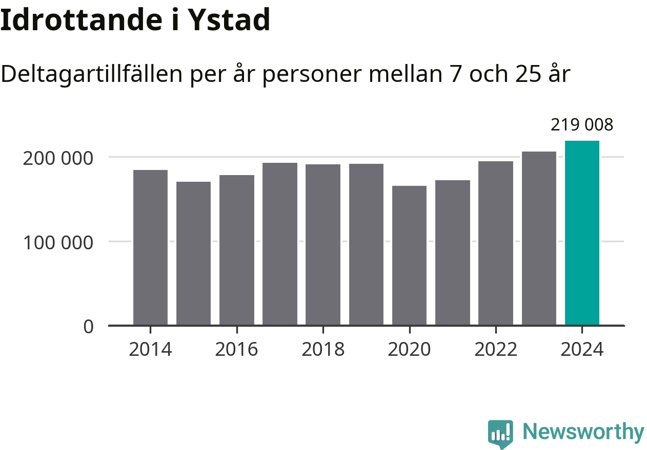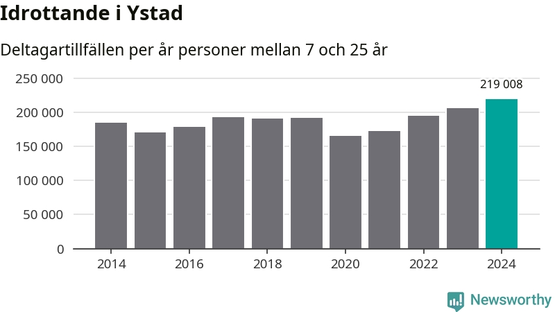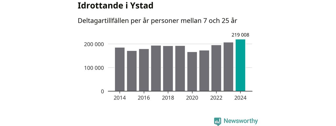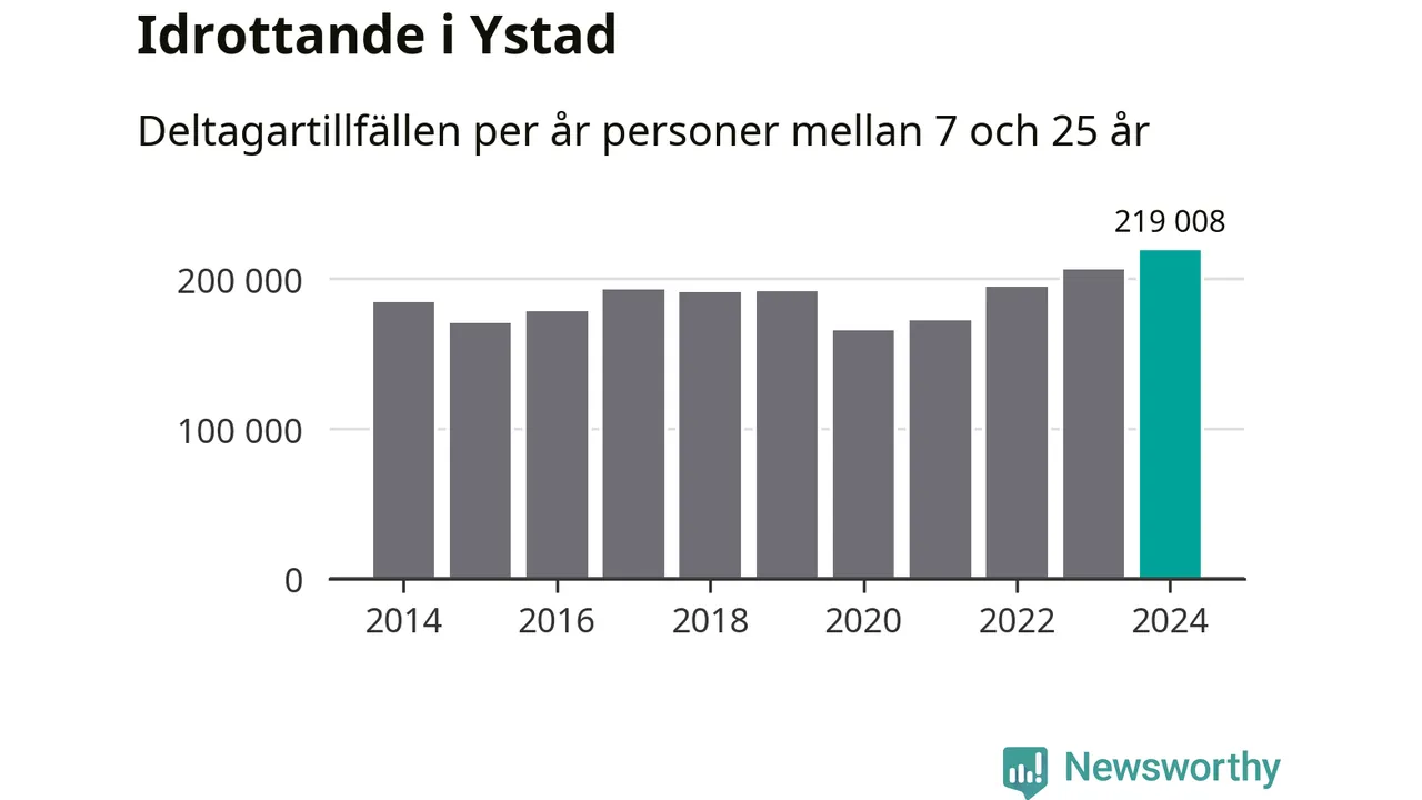 För fjärde året i rad ökade aktiviteten inom ungdomsidrotten i Ystad under 2024. Det visar nya siffror om utbetalt Lok-stöd, som delas ut till föreningar anslutna till Riksidrottsförbundet specialidrottsförbund. Stödet riktar sig till föreningar som bedriver verksamhet för deltagare i åldern 7-25 år. Under året rapporterade föreningarna i Ystad runt 219 000 deltagartillfällen, vilket är en ökning med sex procent jämfört med 2023, och den högsta siffran i kommunen sedan åtminstone 2014. I riket som helhet ökade antalet deltagartillfällen med fem procent under 2024.