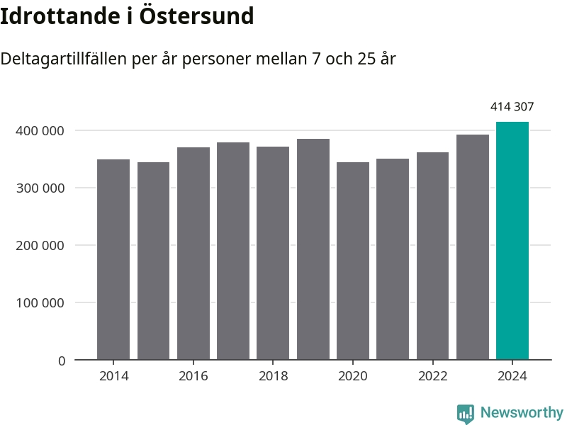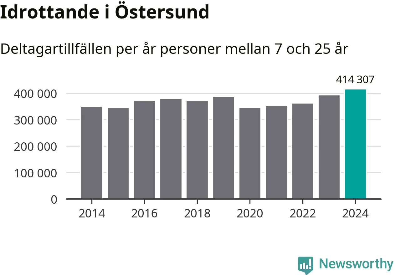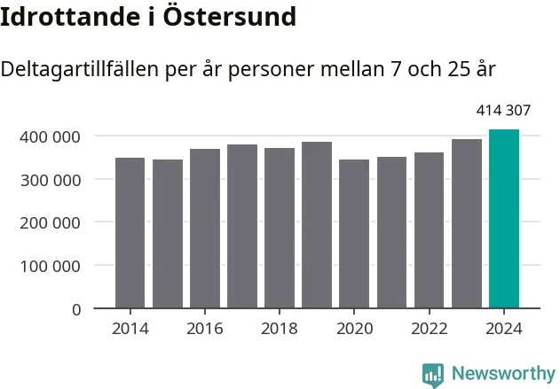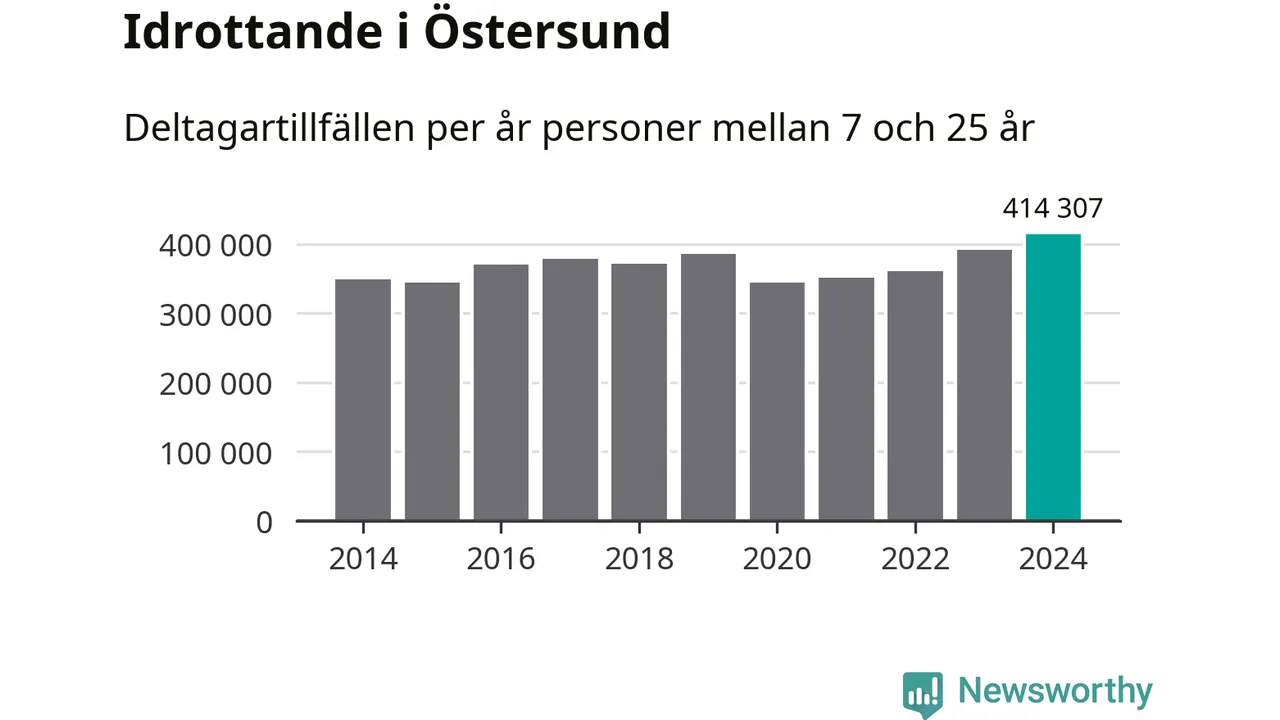 För fjärde året i rad ökade aktiviteten inom ungdomsidrotten i Östersund under 2024. Det visar nya siffror om utbetalt Lok-stöd, som delas ut till föreningar anslutna till Riksidrottsförbundet specialidrottsförbund. Stödet riktar sig till föreningar som bedriver verksamhet för deltagare i åldern 7-25 år. Under året rapporterade föreningarna i Östersund runt 414 000 deltagartillfällen, vilket är en ökning med sex procent jämfört med 2023, och den högsta siffran i kommunen sedan åtminstone 2014. I riket som helhet ökade antalet deltagartillfällen med fem procent under 2024.