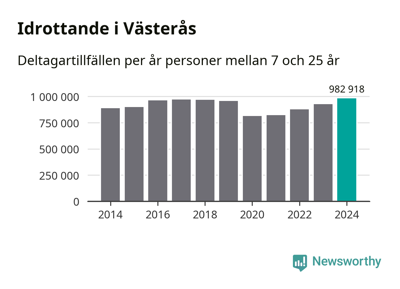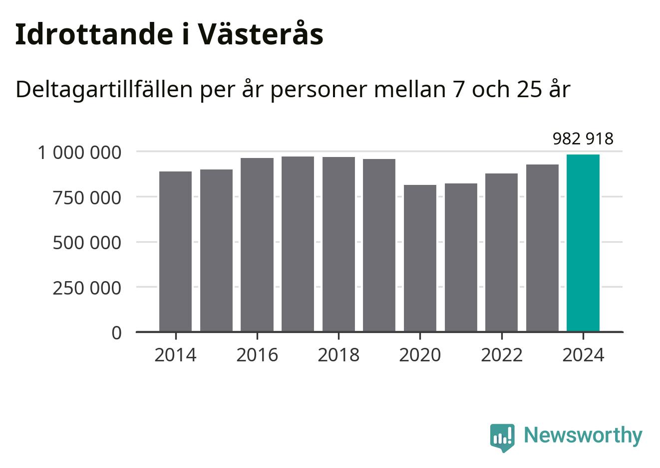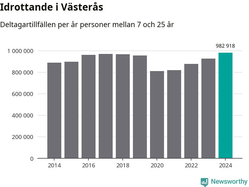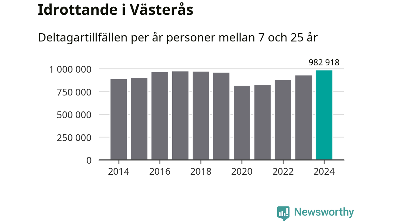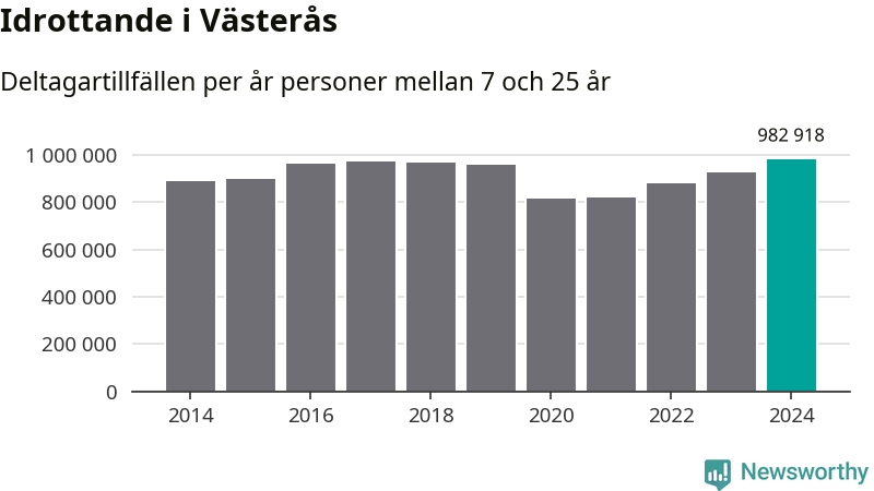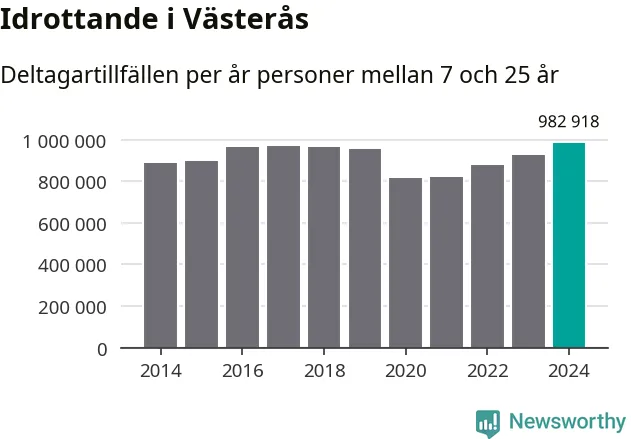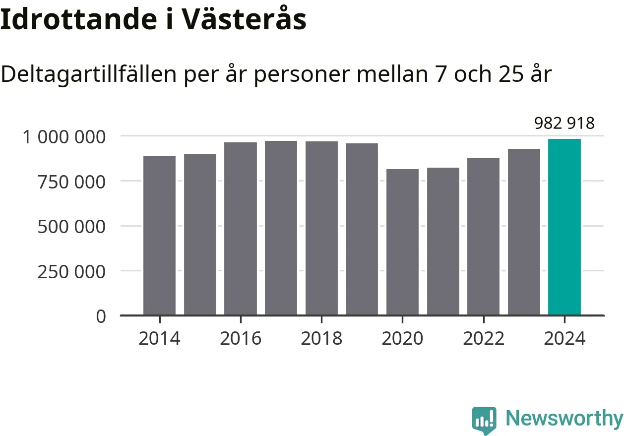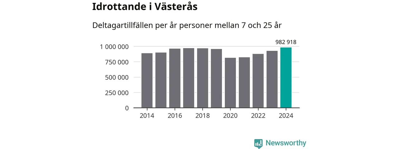 För tredje året i rad ökade aktiviteten inom ungdomsidrotten i Västerås under 2024. Det visar nya siffror om utbetalt Lok-stöd, som delas ut till föreningar anslutna till Riksidrottsförbundet specialidrottsförbund. Stödet riktar sig till föreningar som bedriver verksamhet för deltagare i åldern 7-25 år. Under året rapporterade föreningarna i Västerås runt 983 000 deltagartillfällen, vilket är en ökning med sex procent jämfört med 2023, och den högsta siffran i kommunen sedan åtminstone 2014. I riket som helhet ökade antalet deltagartillfällen med fem procent under 2024.
