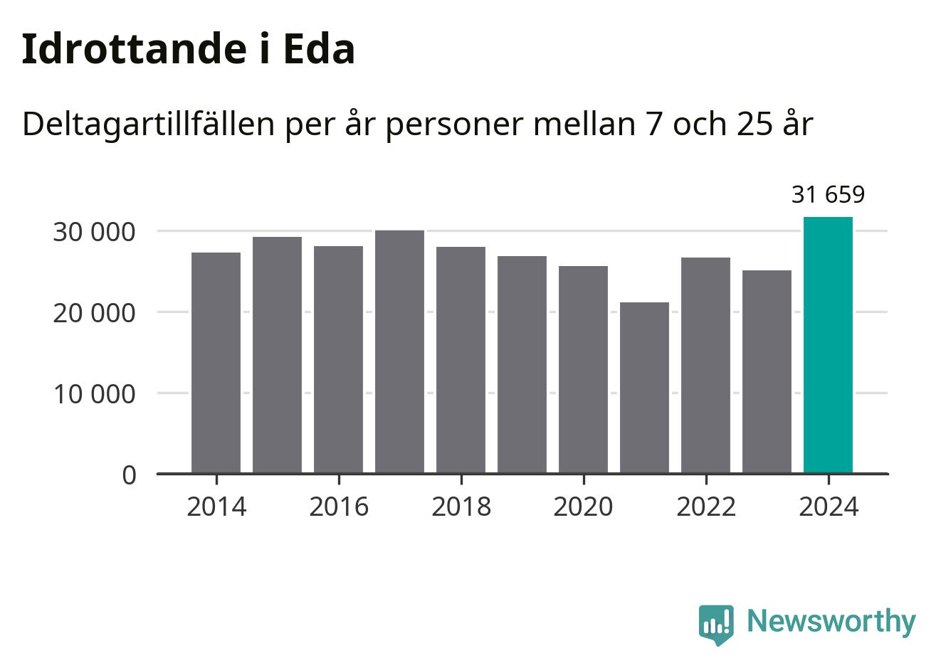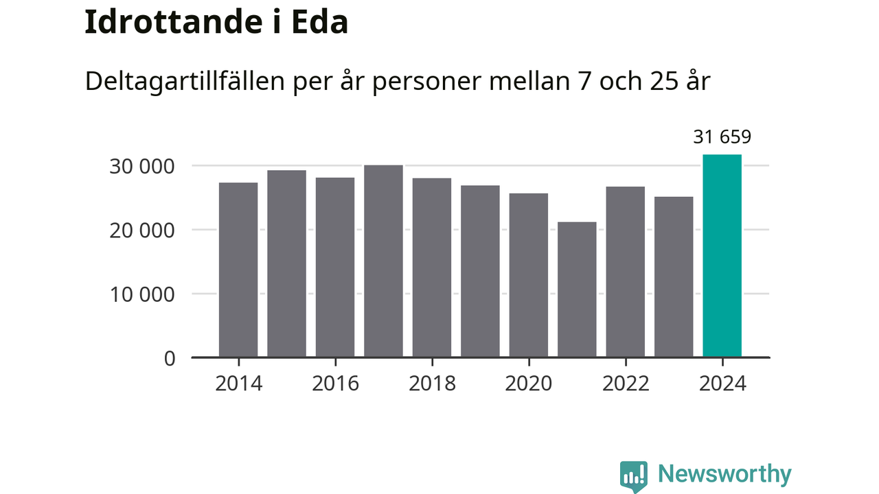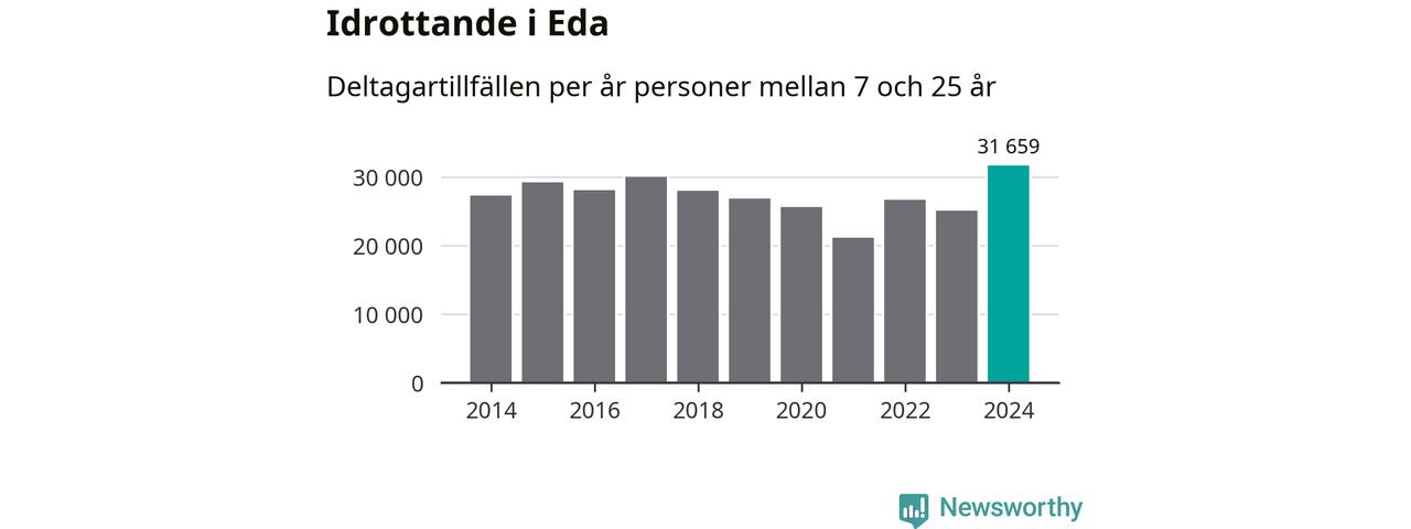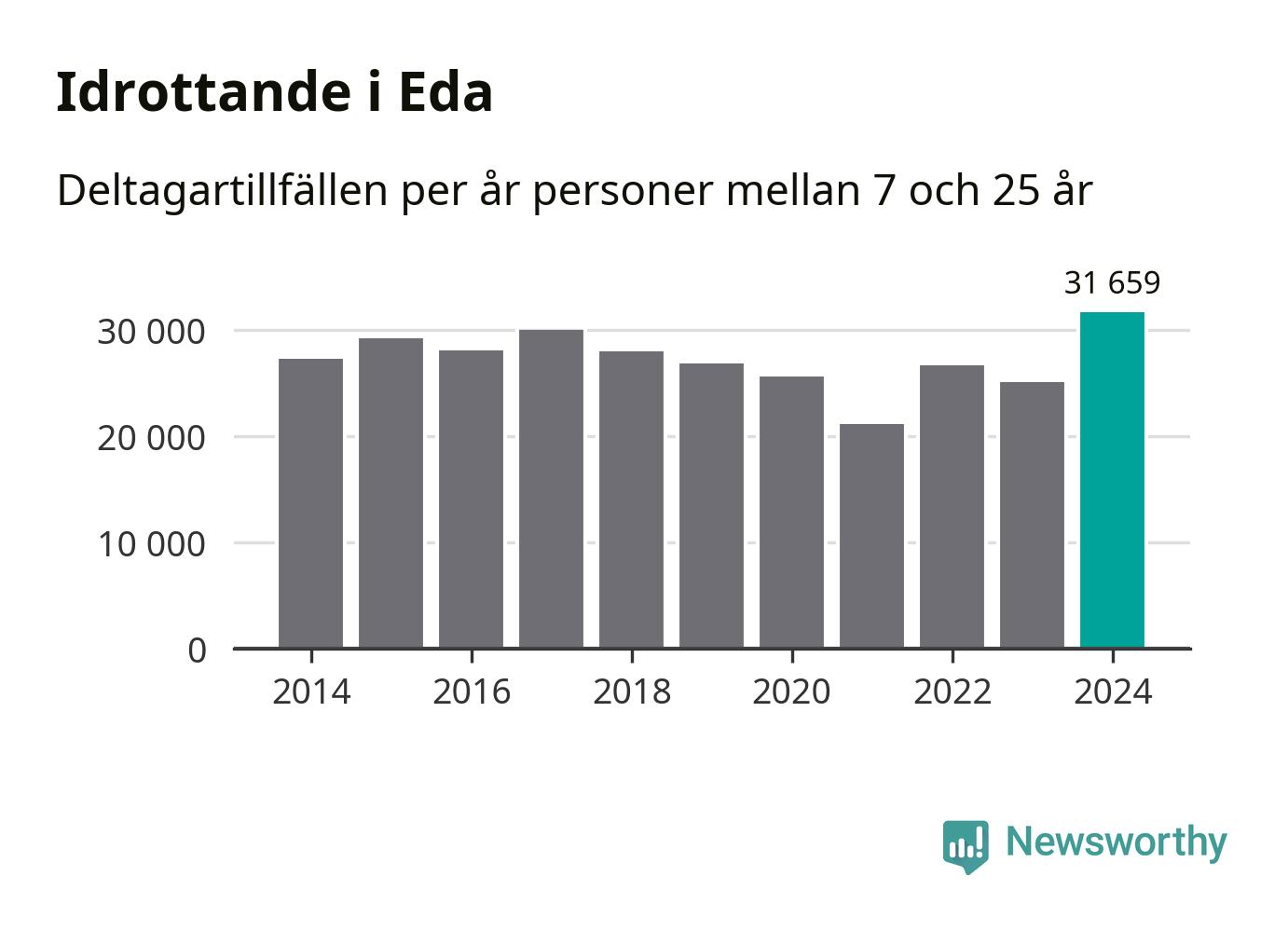 Året innan hade fotbollen omkring 10 800 deltagartillfällen i Eda. Det är alltså en ökning med 55 procent på ett årDet är en ökning med 55 procent jämfört med 2023. På riksplanet noterade bordtennisen en ökning med 23 procent, året då Truls Möregårdh spelade hem två OS-silver. I Eda finns dock inga deltagartillfällen för bordtennisen registrerade under 2024.