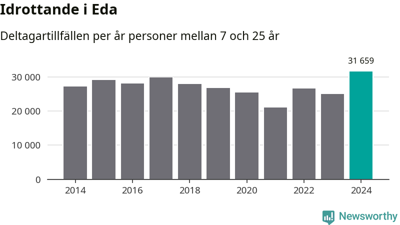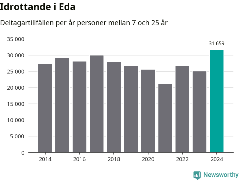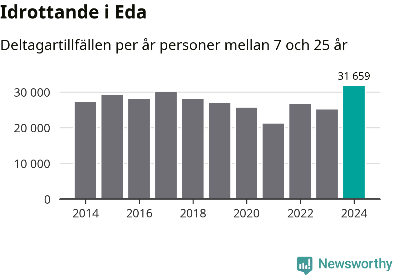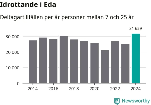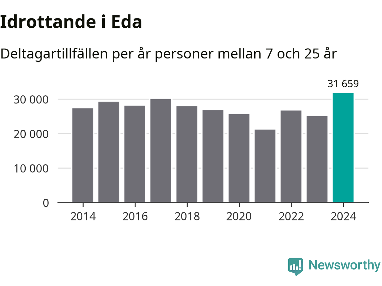 Året innan hade fotbollen omkring 10 800 deltagartillfällen i Eda. Det är alltså en ökning med 55 procent på ett årDet är en ökning med 55 procent jämfört med 2023. På riksplanet noterade bordtennisen en ökning med 23 procent, året då Truls Möregårdh spelade hem två OS-silver. I Eda finns dock inga deltagartillfällen för bordtennisen registrerade under 2024.