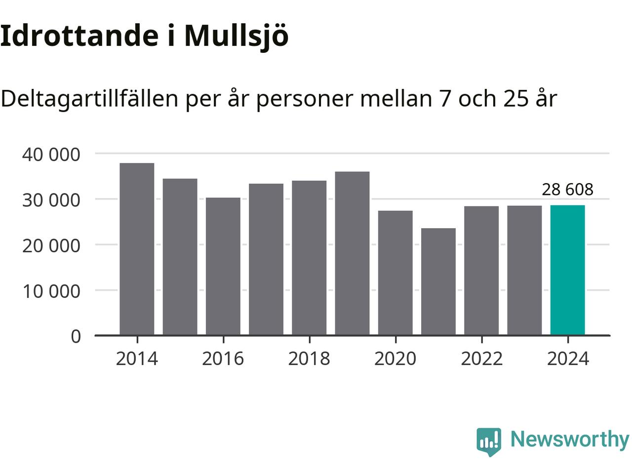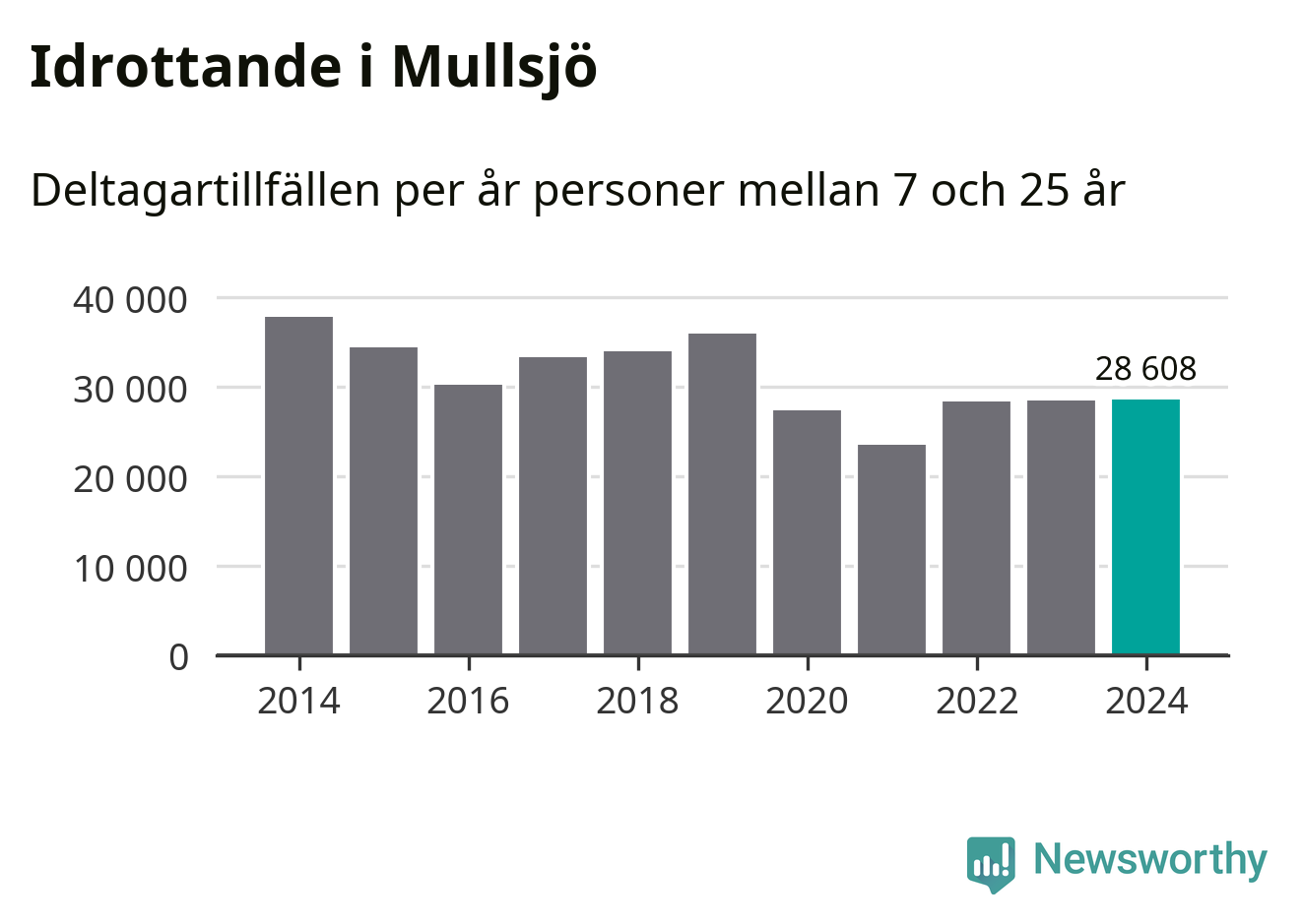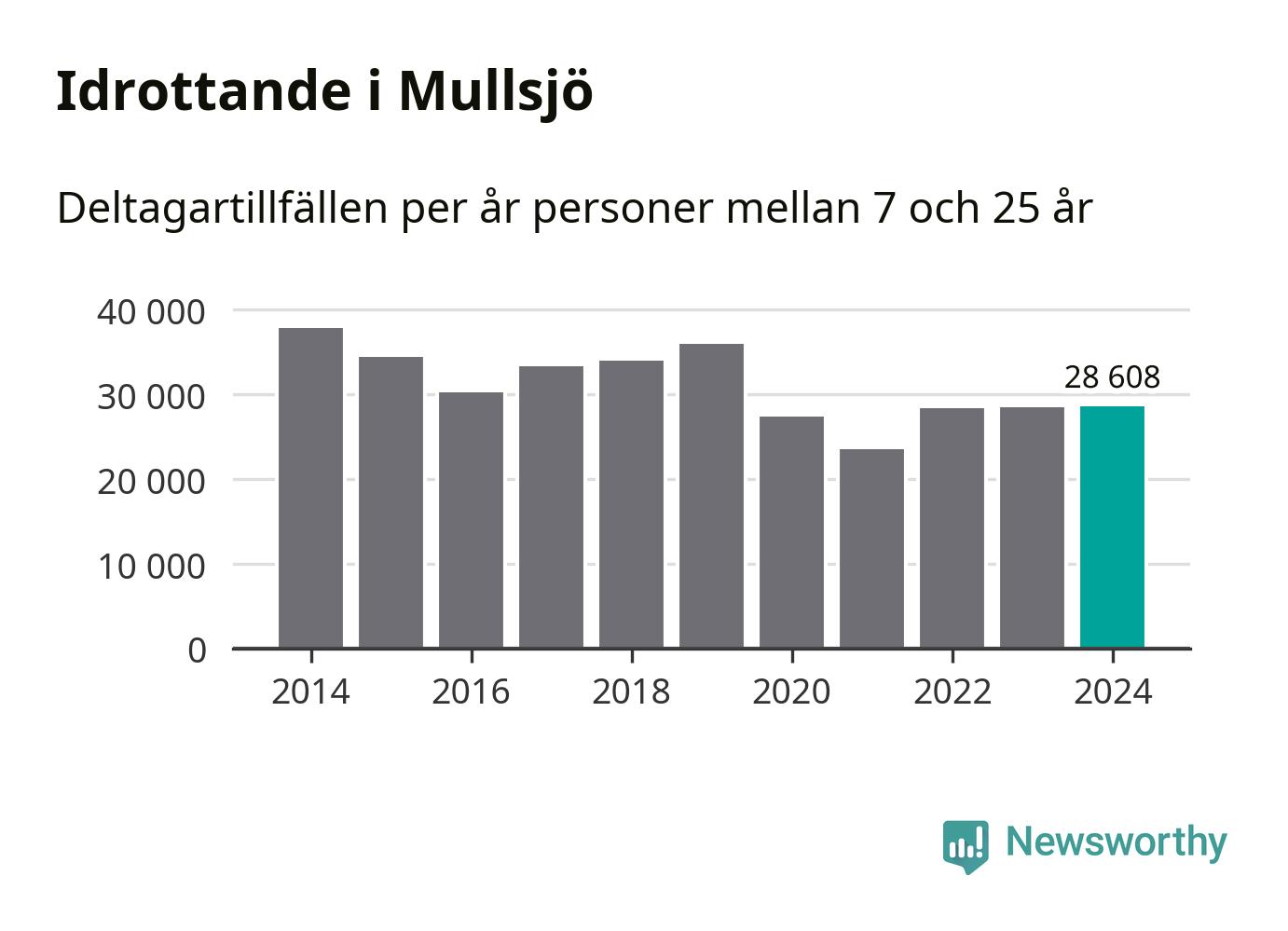 Idrottande Mullsjöungdomar registrerades för knappt 29 000 deltagartillfällen under 2024. Det är ungefär lika många som året innan. Det visar nya siffror om utbetalt Lok-stöd, som delas ut till föreningar anslutna till Riksidrottsförbundet specialidrottsförbund. Stödet riktar sig till föreningar som bedriver verksamhet för deltagare i åldern 7-25 år. I riket som helhet ökade antalet deltagartillfällen med fem procent under 2024.