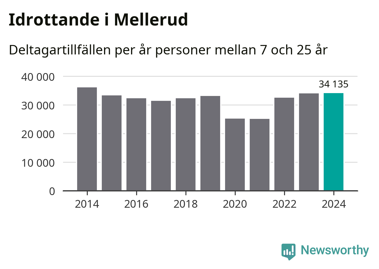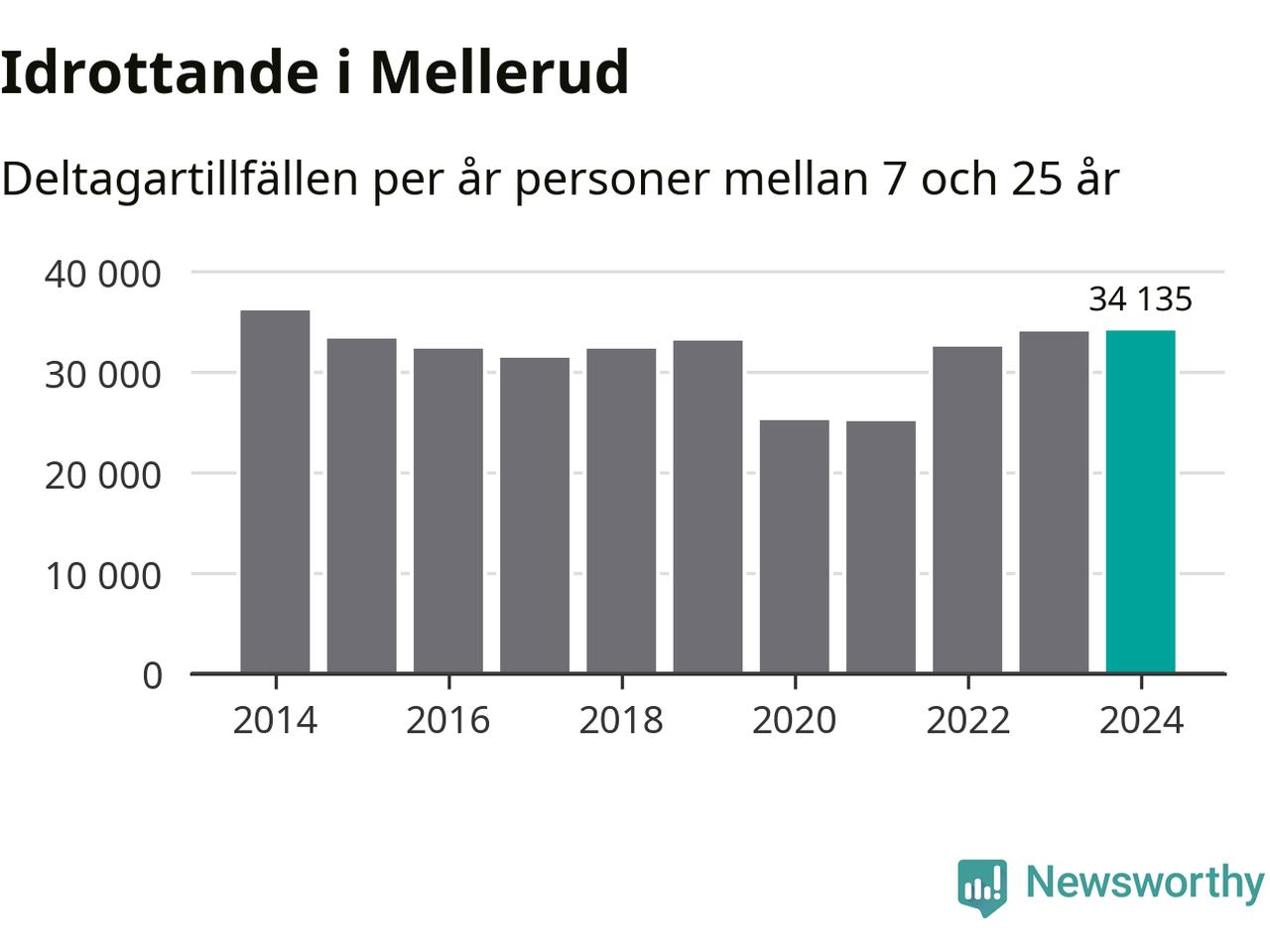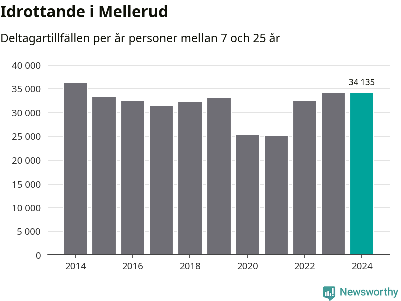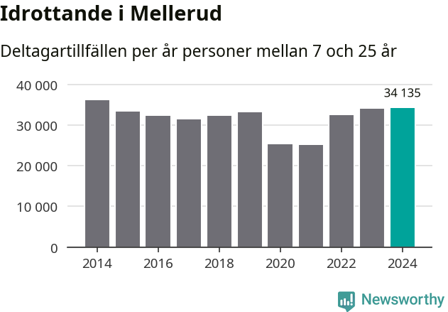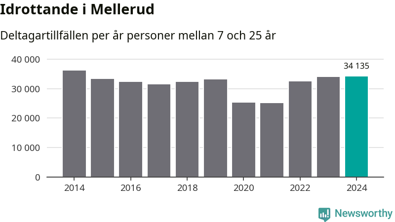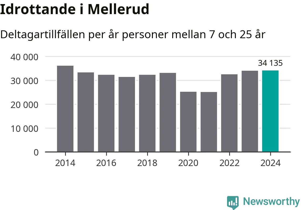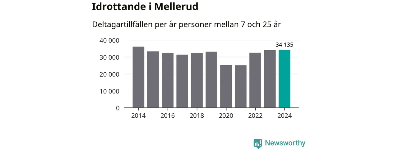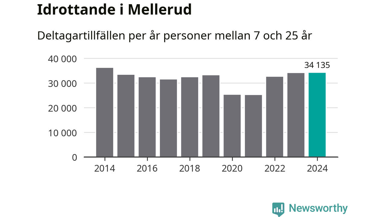 Idrottande Mellerudsungdomar registrerades för omkring 34 000 deltagartillfällen under 2024. Det är ungefär lika många som året innan och den högsta siffran i kommunen sedan 2014. Det visar nya siffror om utbetalt Lok-stöd, som delas ut till föreningar anslutna till Riksidrottsförbundet specialidrottsförbund. Stödet riktar sig till föreningar som bedriver verksamhet för deltagare i åldern 7-25 år. I riket som helhet ökade antalet deltagartillfällen med fem procent under 2024.
