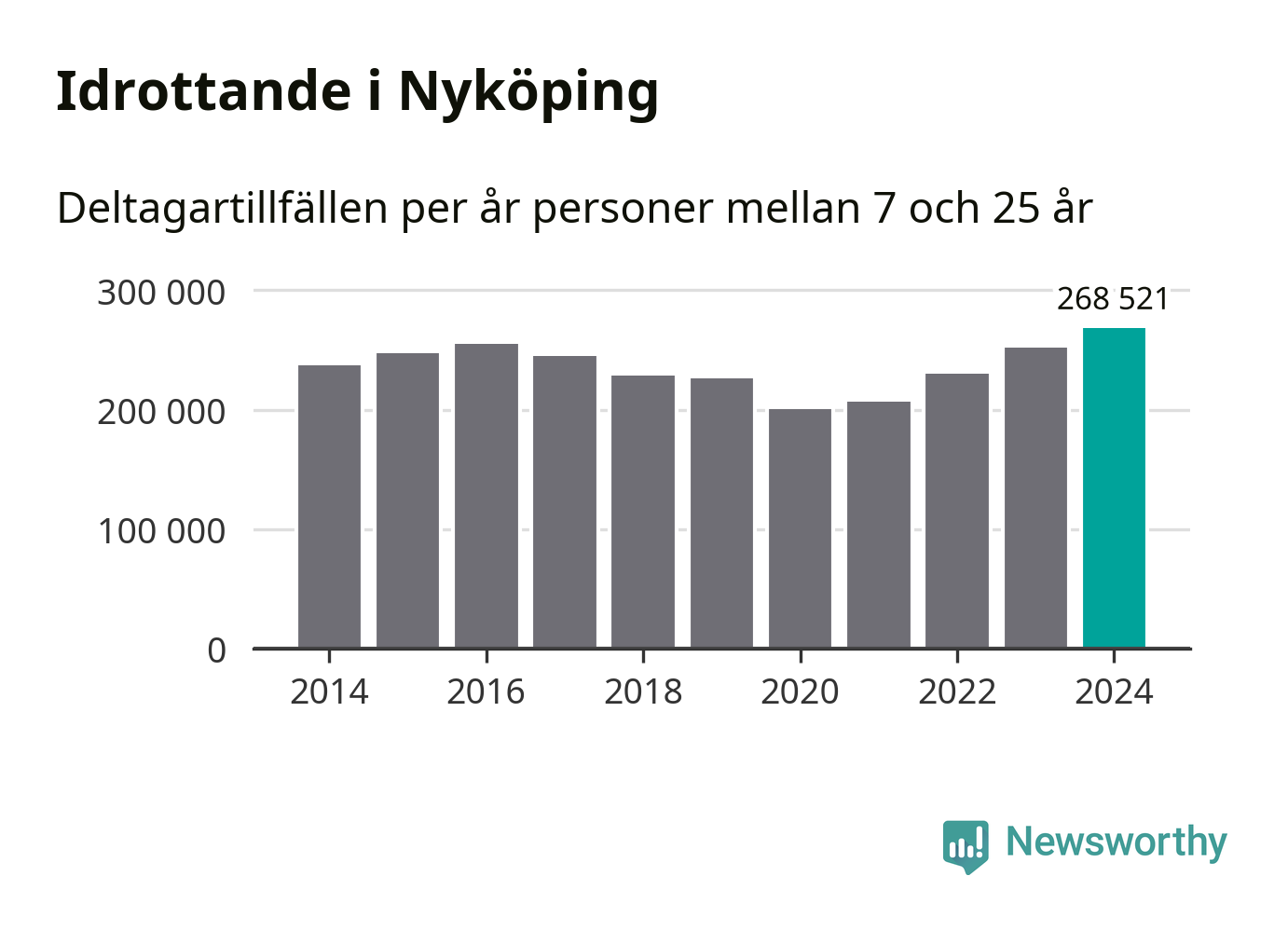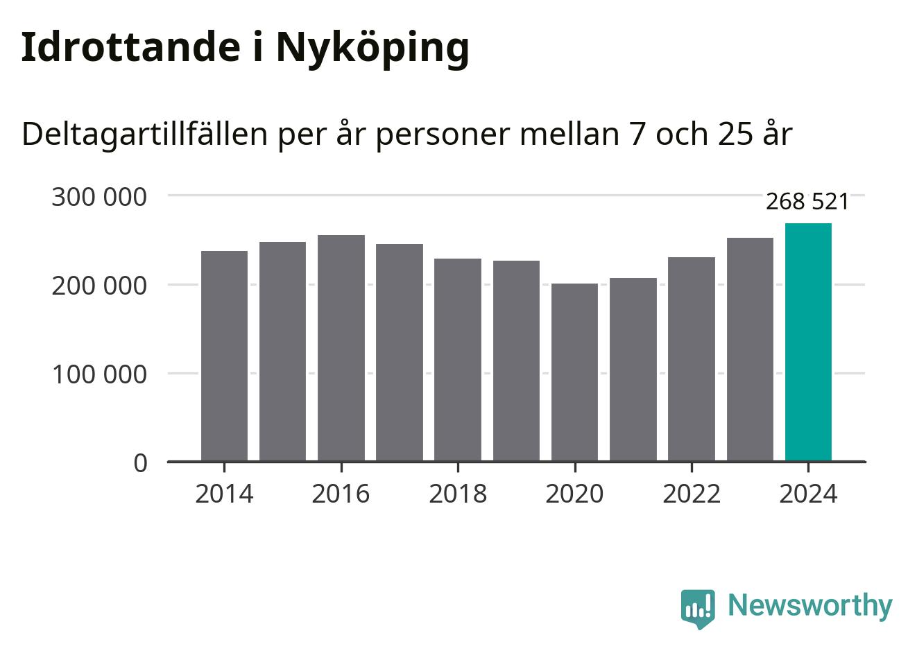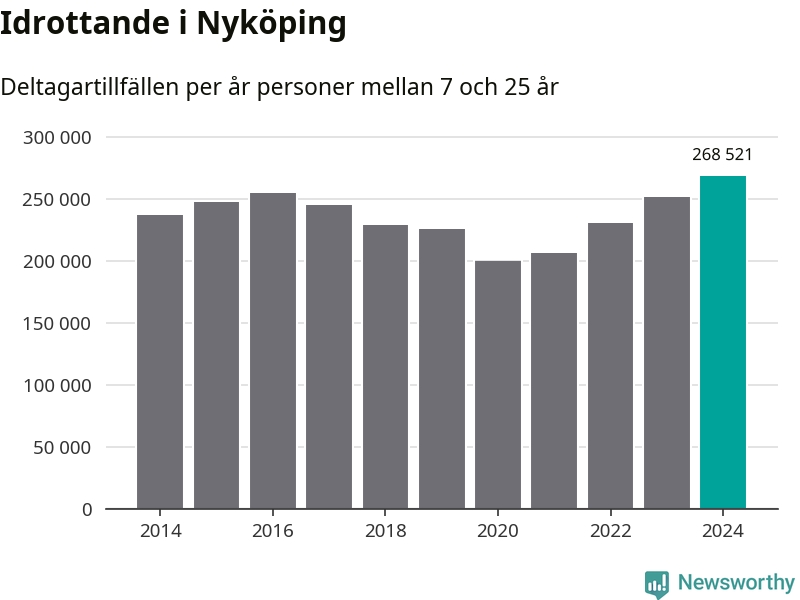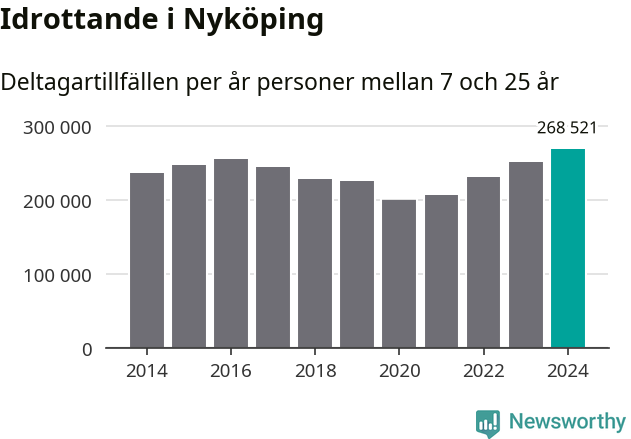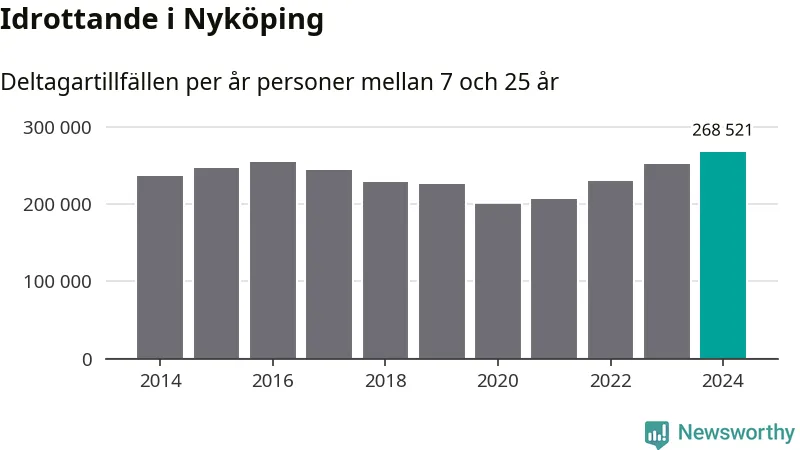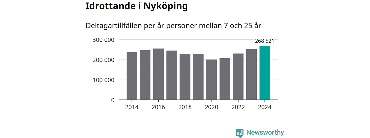 För fjärde året i rad ökade aktiviteten inom ungdomsidrotten i Nyköping under 2024. Det visar nya siffror om utbetalt Lok-stöd, som delas ut till föreningar anslutna till Riksidrottsförbundet specialidrottsförbund. Stödet riktar sig till föreningar som bedriver verksamhet för deltagare i åldern 7-25 år. Under året rapporterade föreningarna i Nyköping runt 269 000 deltagartillfällen, vilket är en ökning med sju procent jämfört med 2023, och den högsta siffran i kommunen sedan åtminstone 2014. I riket som helhet ökade antalet deltagartillfällen med fem procent under 2024.