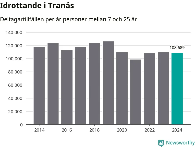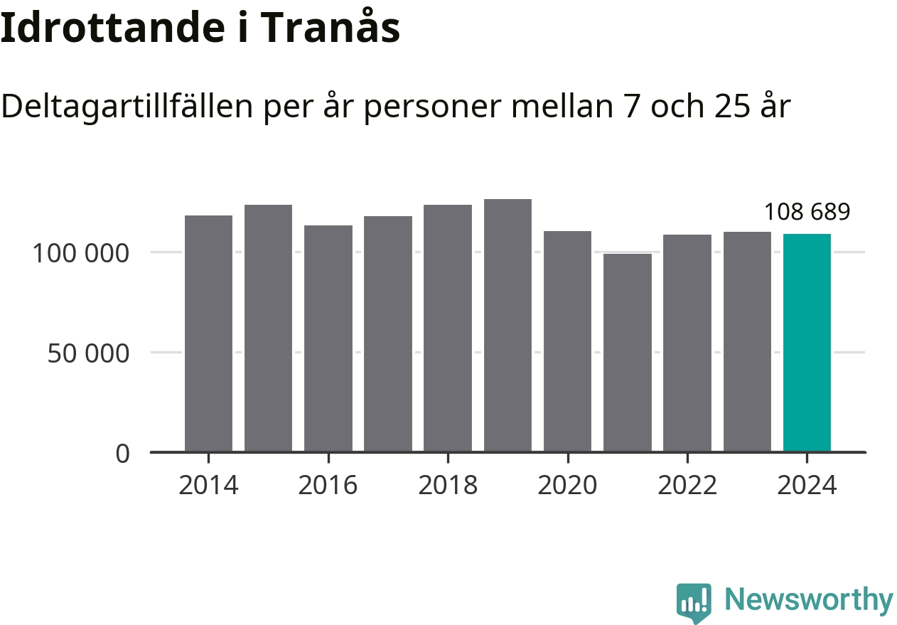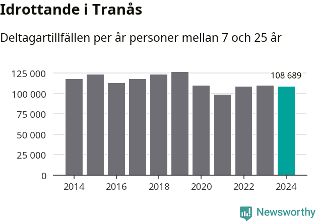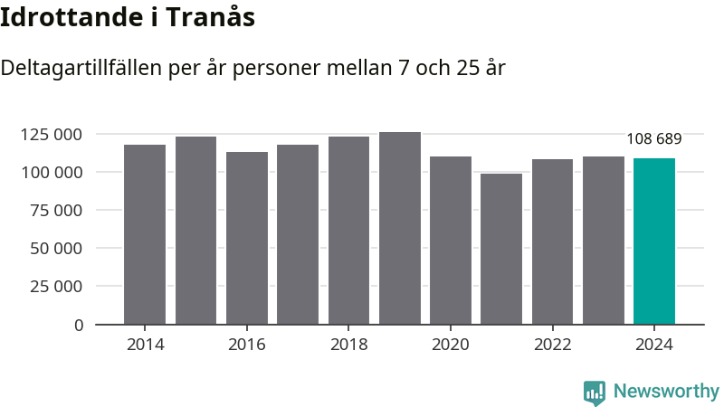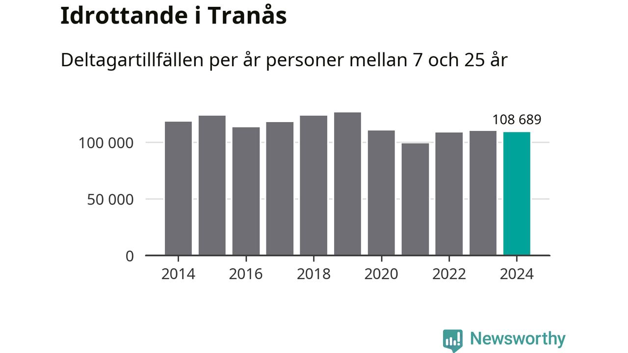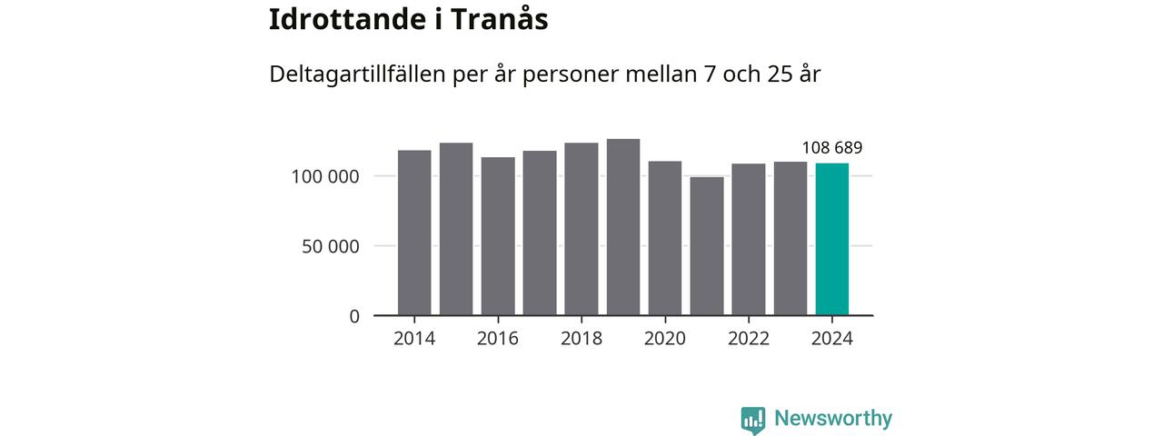 Idrottande Tranåsungdomar registrerades för omkring 109 000 deltagartillfällen under 2024. Det är något färre än året innan. Det visar nya siffror om utbetalt Lok-stöd, som delas ut till föreningar anslutna till Riksidrottsförbundet specialidrottsförbund. Stödet riktar sig till föreningar som bedriver verksamhet för deltagare i åldern 7-25 år. I riket som helhet ökade antalet deltagartillfällen med fem procent under 2024.