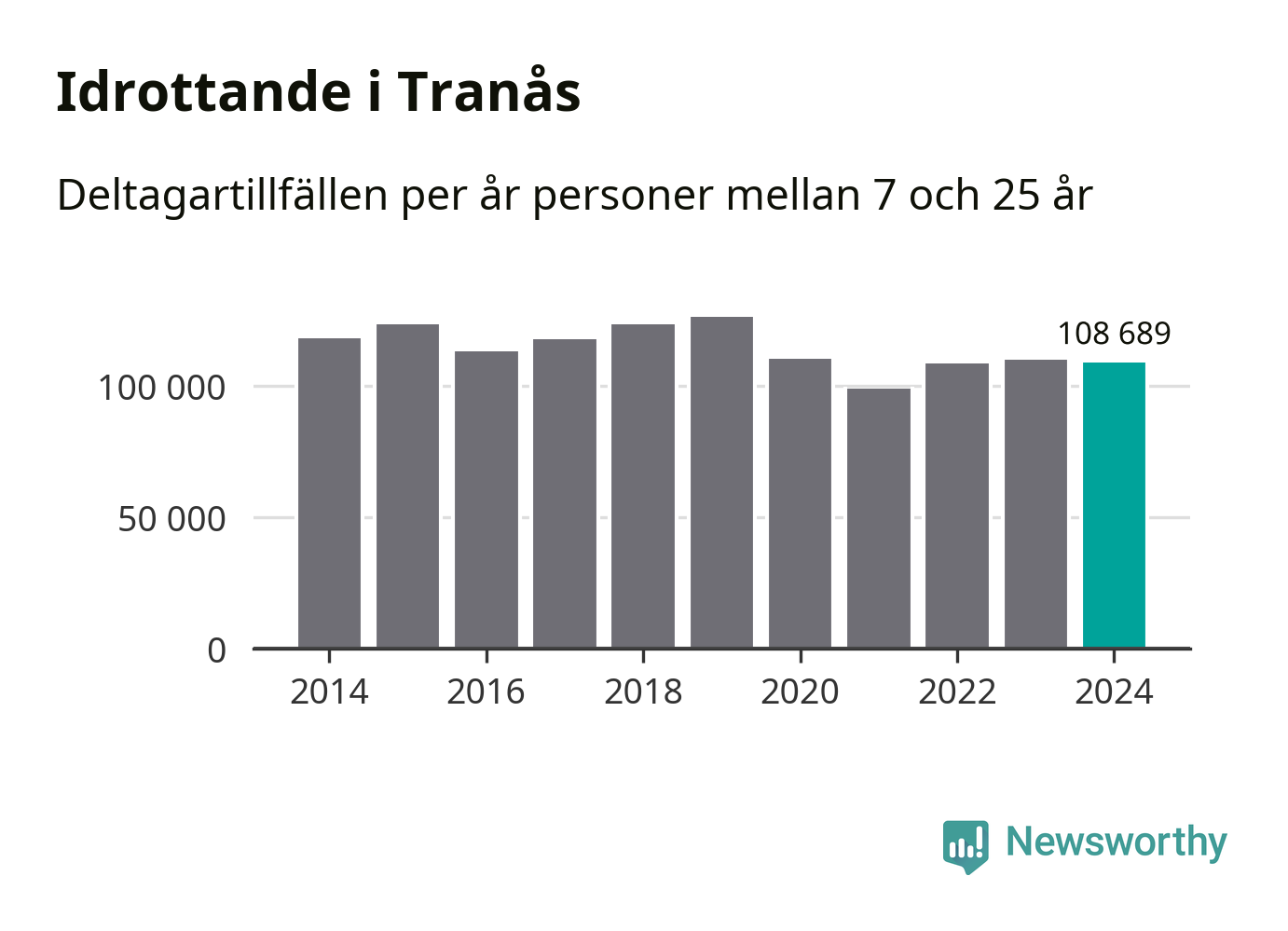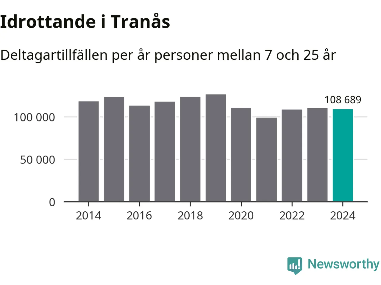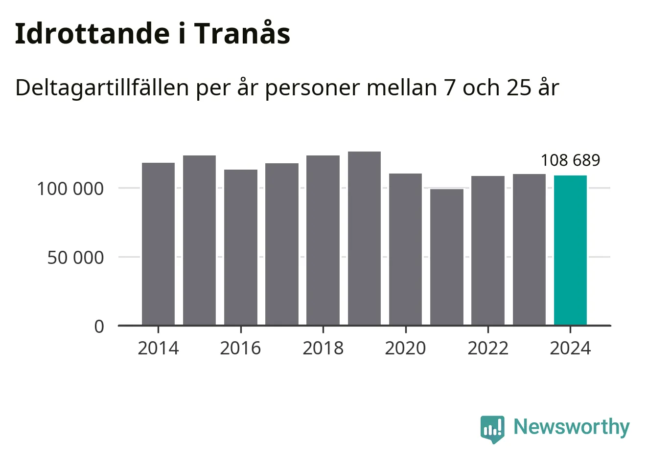 Idrottande Tranåsungdomar registrerades för omkring 109 000 deltagartillfällen under 2024. Det är något färre än året innan. Det visar nya siffror om utbetalt Lok-stöd, som delas ut till föreningar anslutna till Riksidrottsförbundet specialidrottsförbund. Stödet riktar sig till föreningar som bedriver verksamhet för deltagare i åldern 7-25 år. I riket som helhet ökade antalet deltagartillfällen med fem procent under 2024.
