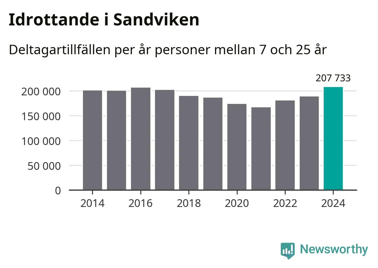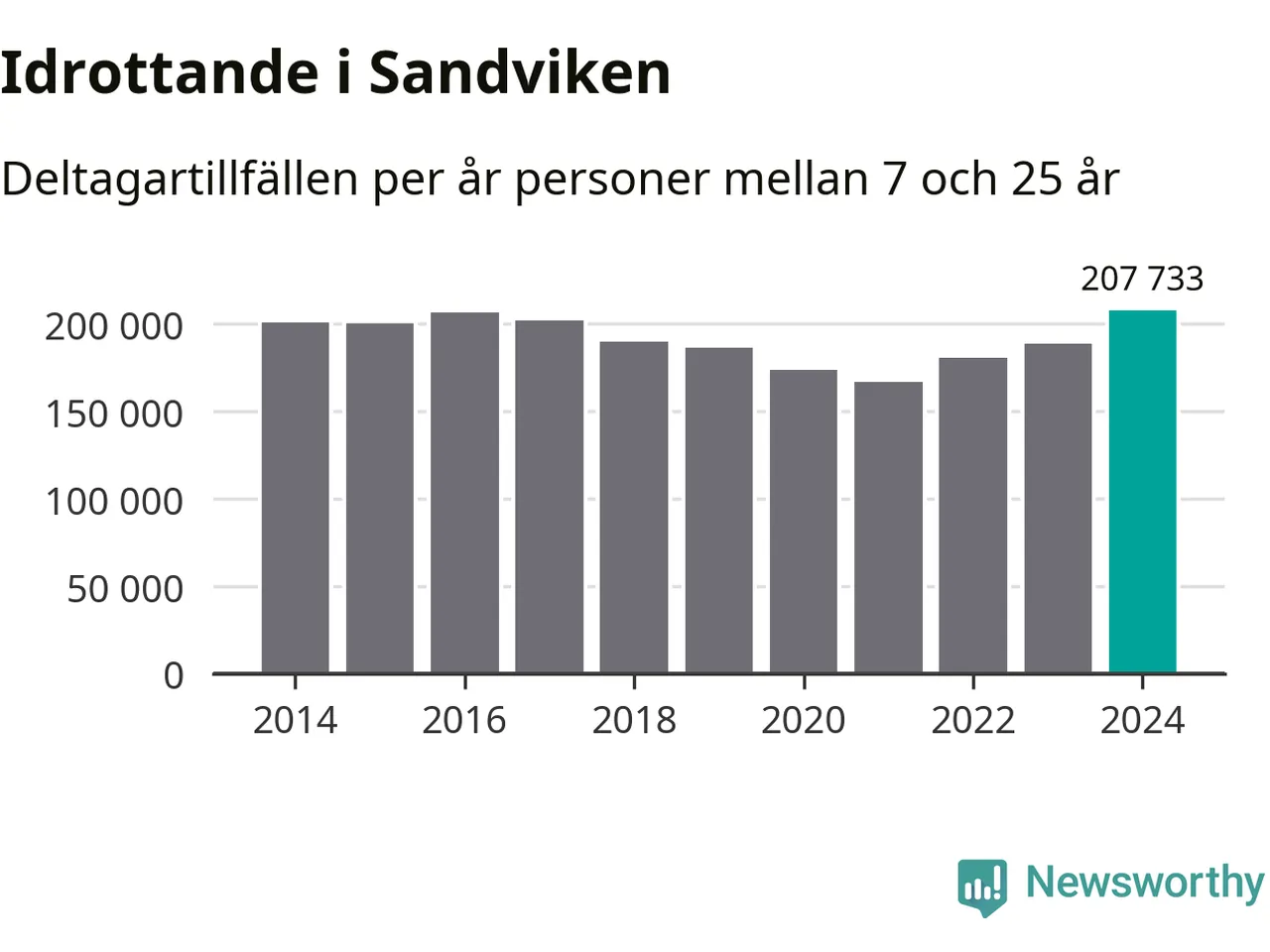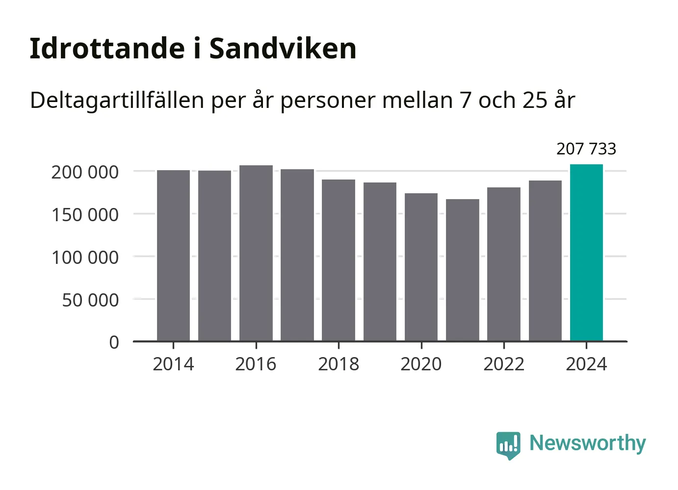 För tredje året i rad ökade aktiviteten inom ungdomsidrotten i Sandviken under 2024. Det visar nya siffror om utbetalt Lok-stöd, som delas ut till föreningar anslutna till Riksidrottsförbundet specialidrottsförbund. Stödet riktar sig till föreningar som bedriver verksamhet för deltagare i åldern 7-25 år. Under året rapporterade föreningarna i Sandviken runt 208 000 deltagartillfällen, vilket är en ökning med tio procent jämfört med 2023, och den högsta siffran i kommunen sedan åtminstone 2014. I riket som helhet ökade antalet deltagartillfällen med fem procent under 2024.