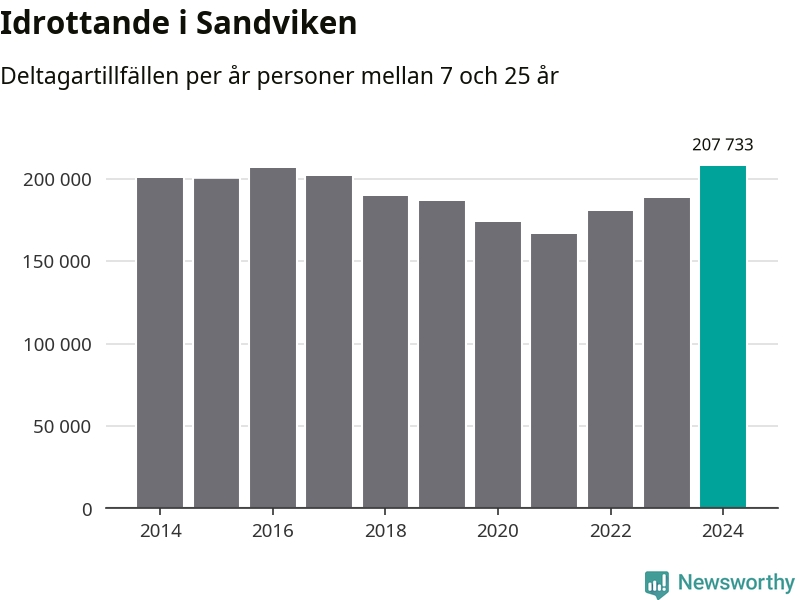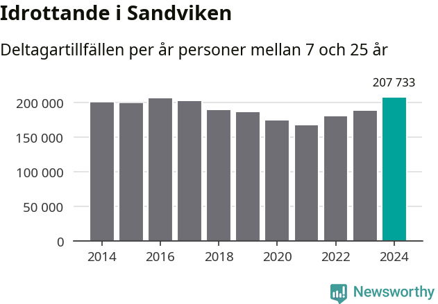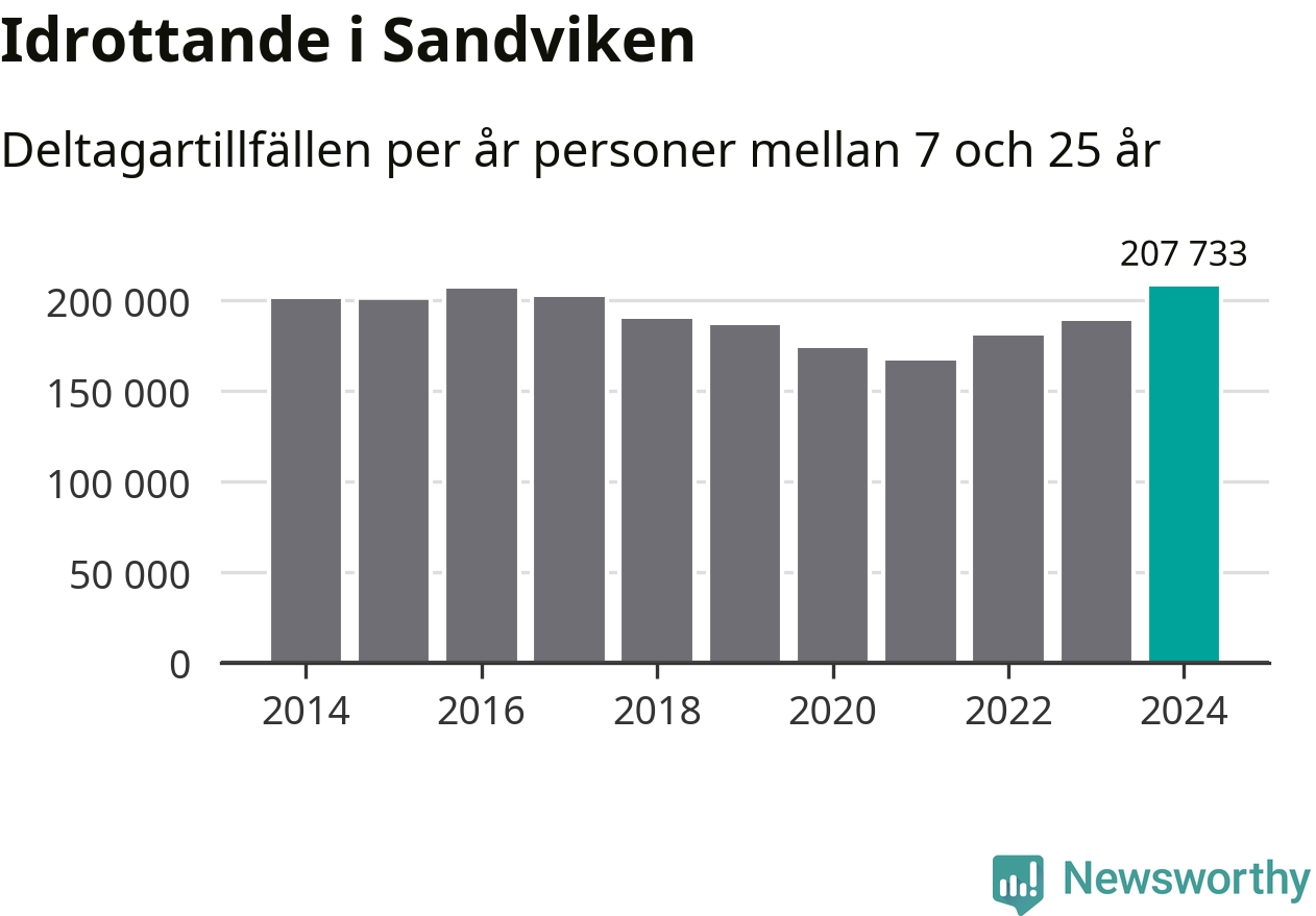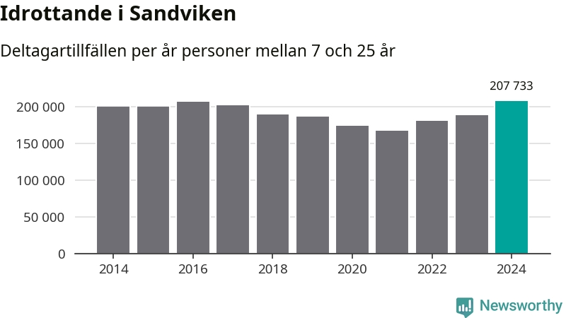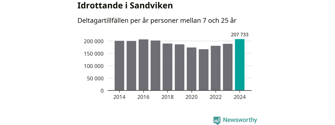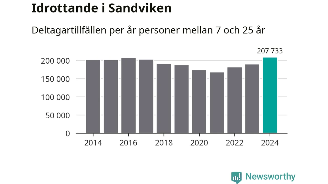 För tredje året i rad ökade aktiviteten inom ungdomsidrotten i Sandviken under 2024. Det visar nya siffror om utbetalt Lok-stöd, som delas ut till föreningar anslutna till Riksidrottsförbundet specialidrottsförbund. Stödet riktar sig till föreningar som bedriver verksamhet för deltagare i åldern 7-25 år. Under året rapporterade föreningarna i Sandviken runt 208 000 deltagartillfällen, vilket är en ökning med tio procent jämfört med 2023, och den högsta siffran i kommunen sedan åtminstone 2014. I riket som helhet ökade antalet deltagartillfällen med fem procent under 2024.