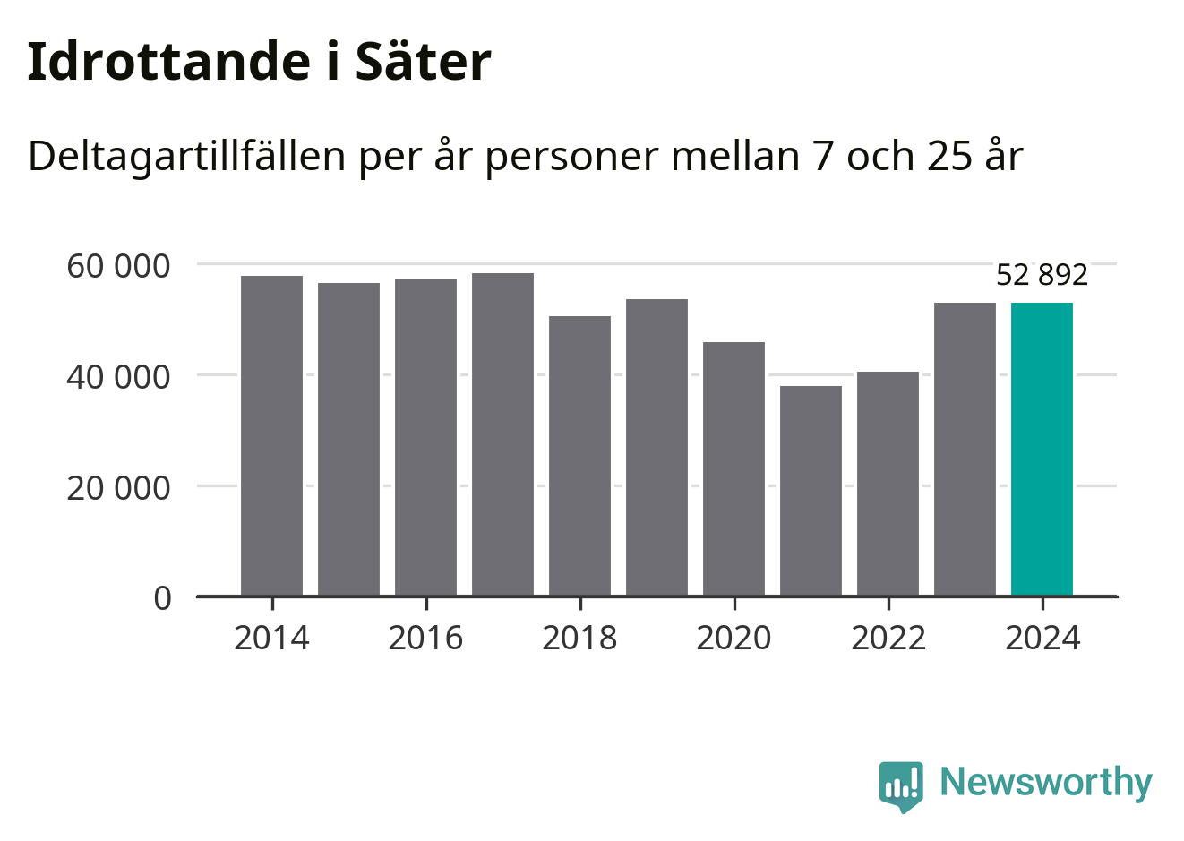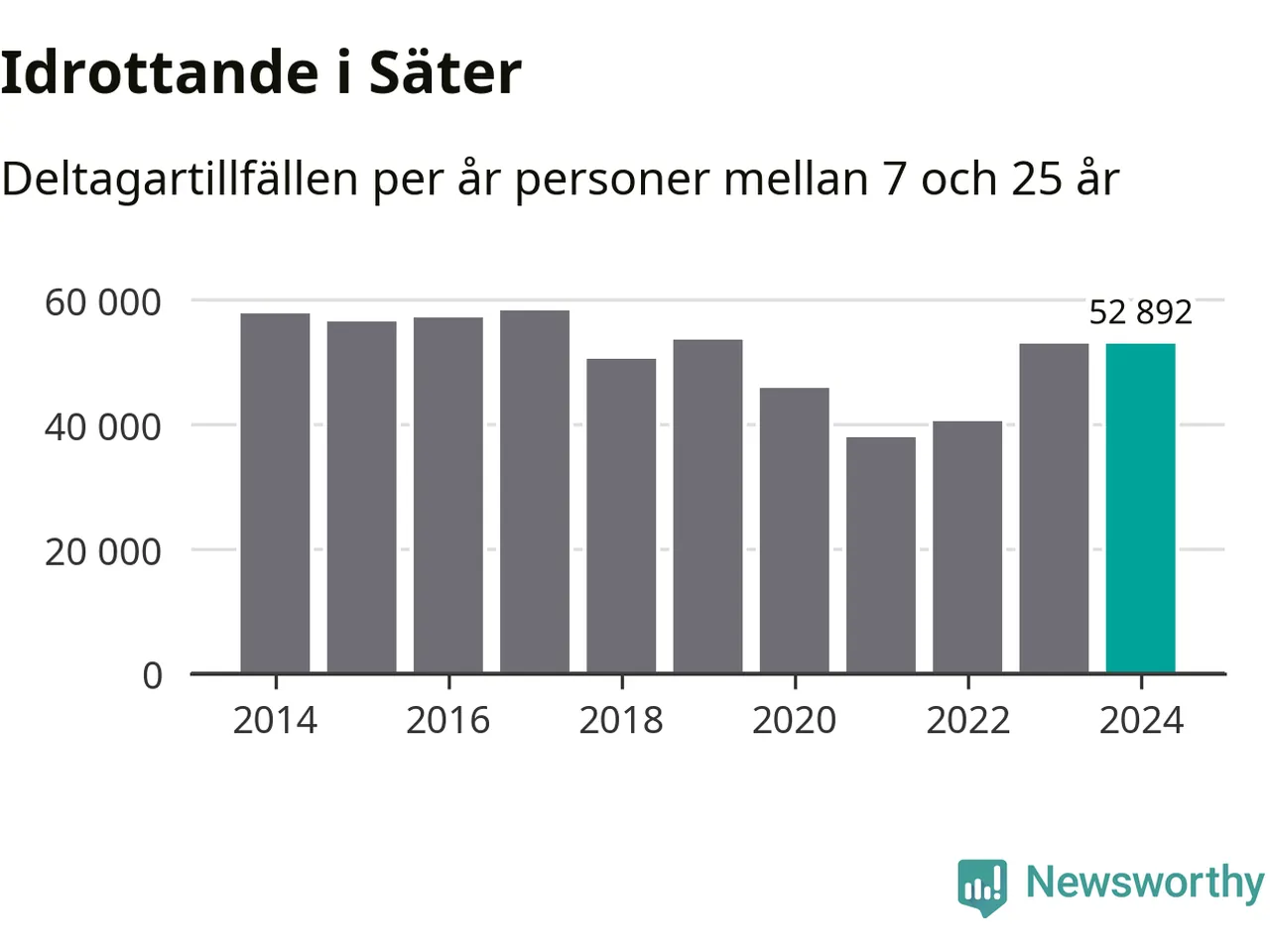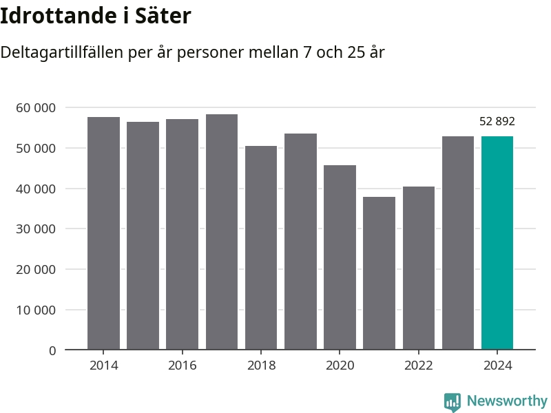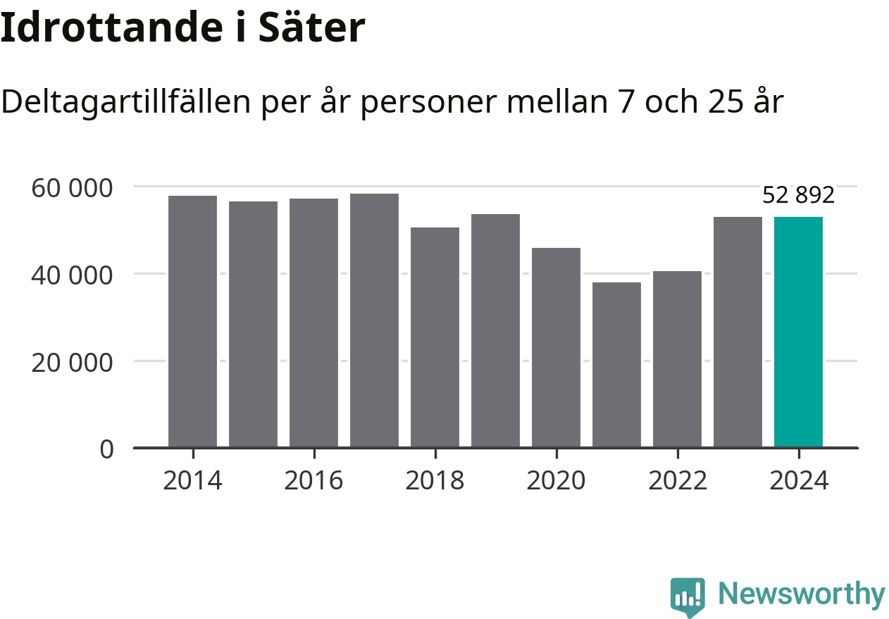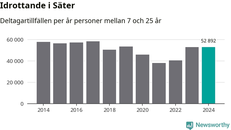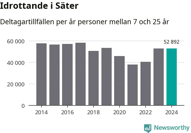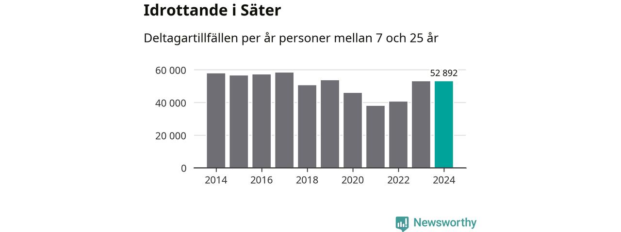 Idrottande Säterungdomar registrerades för omkring 53 000 deltagartillfällen under 2024. Det är ungefär lika många som året innan. Det visar nya siffror om utbetalt Lok-stöd, som delas ut till föreningar anslutna till Riksidrottsförbundet specialidrottsförbund. Stödet riktar sig till föreningar som bedriver verksamhet för deltagare i åldern 7-25 år. I riket som helhet ökade antalet deltagartillfällen med fem procent under 2024.