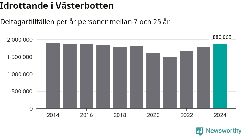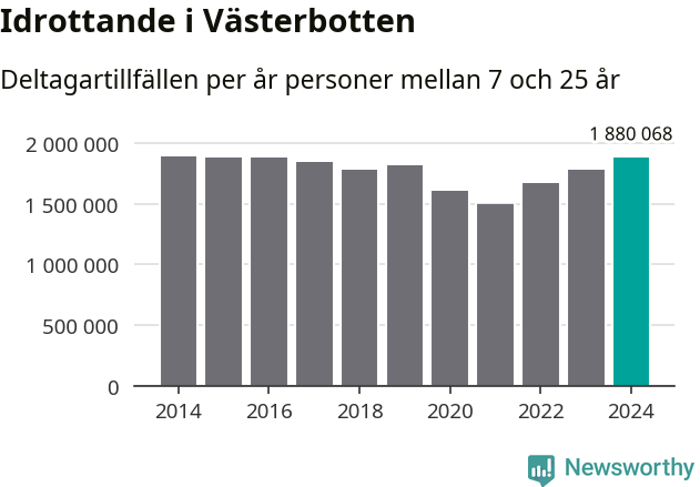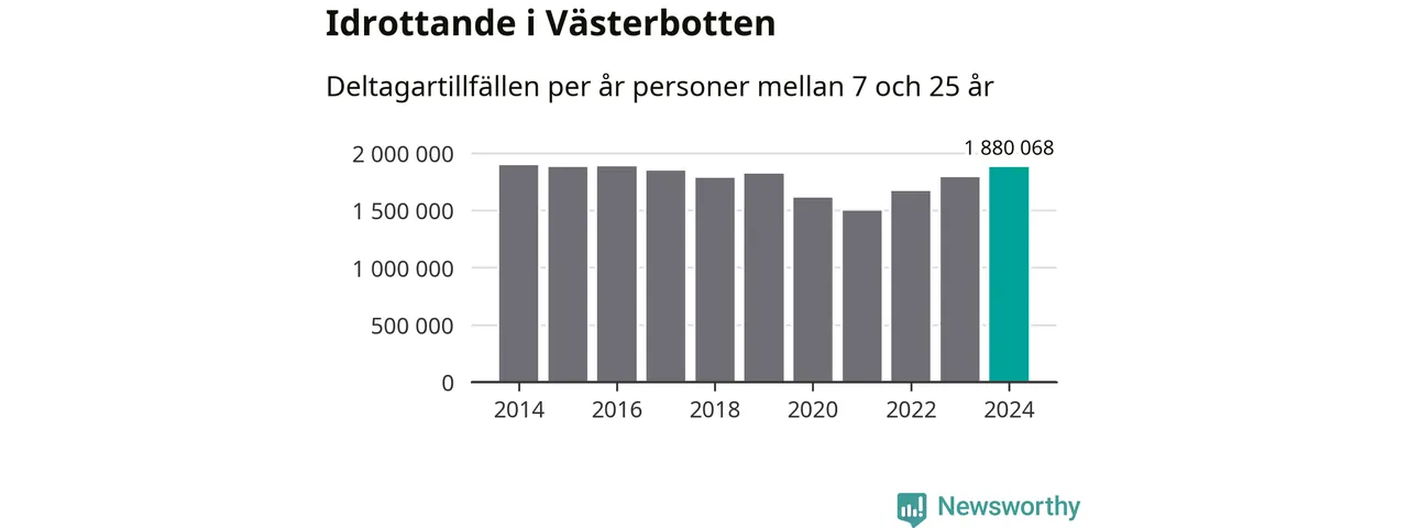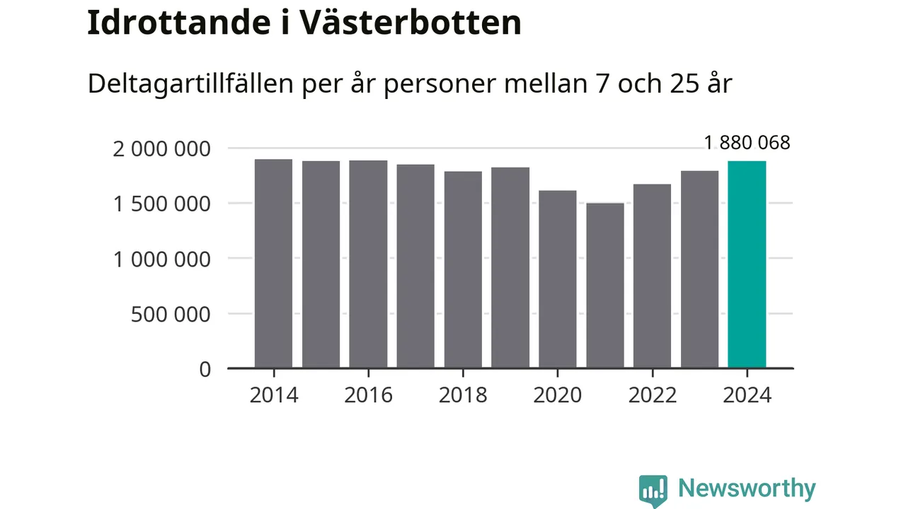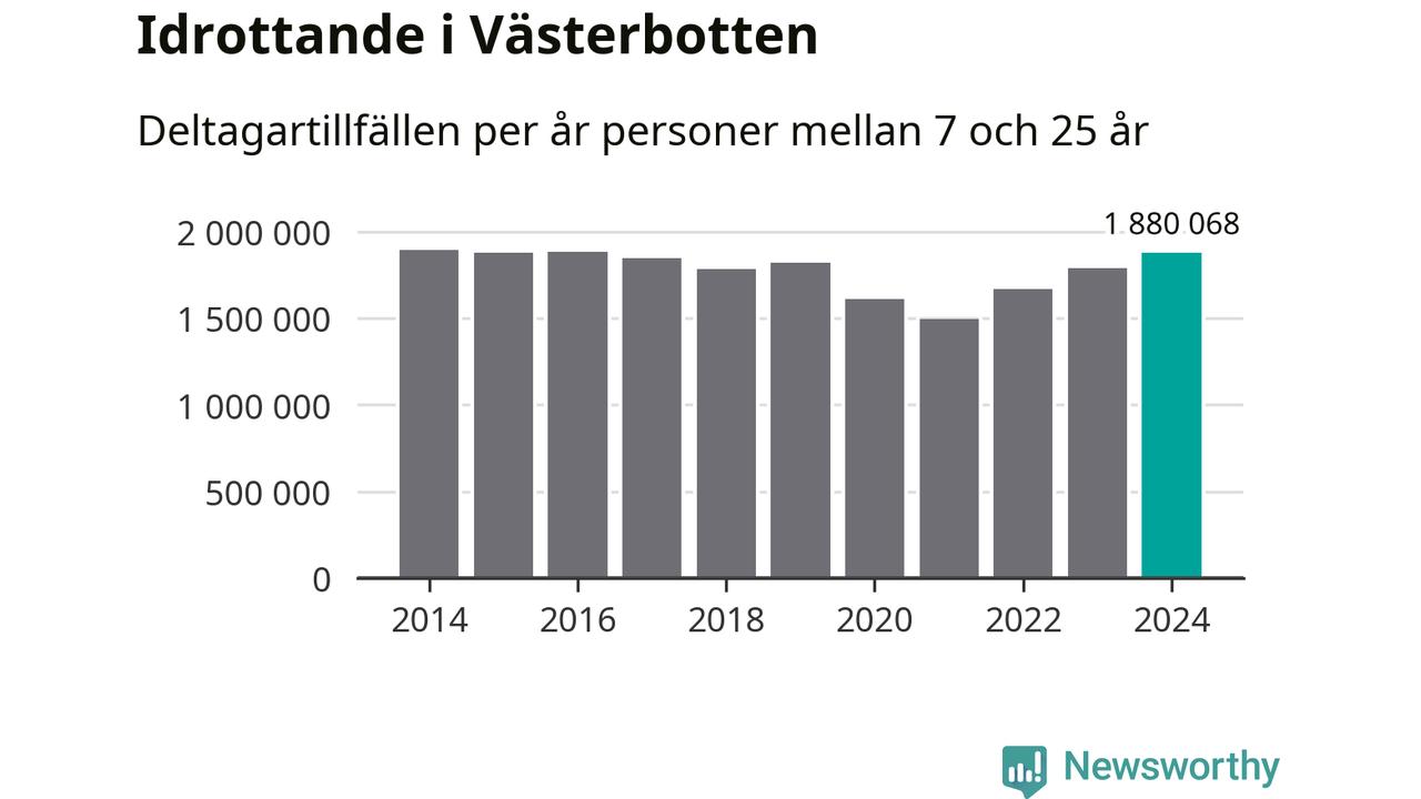 För tredje året i rad ökade aktiviteten inom ungdomsidrotten i Västerbotten under 2024. Det visar nya siffror om utbetalt Lok-stöd, som delas ut till föreningar anslutna till Riksidrottsförbundet specialidrottsförbund. Stödet riktar sig till föreningar som bedriver verksamhet för deltagare i åldern 7-25 år. Under året rapporterade föreningarna i Västerbotten runt 1 880 000 deltagartillfällen, vilket är en ökning med fem procent jämfört med 2023 och den högsta siffran i länet sedan 2016. I riket som helhet ökade antalet deltagartillfällen med fem procent under 2024.