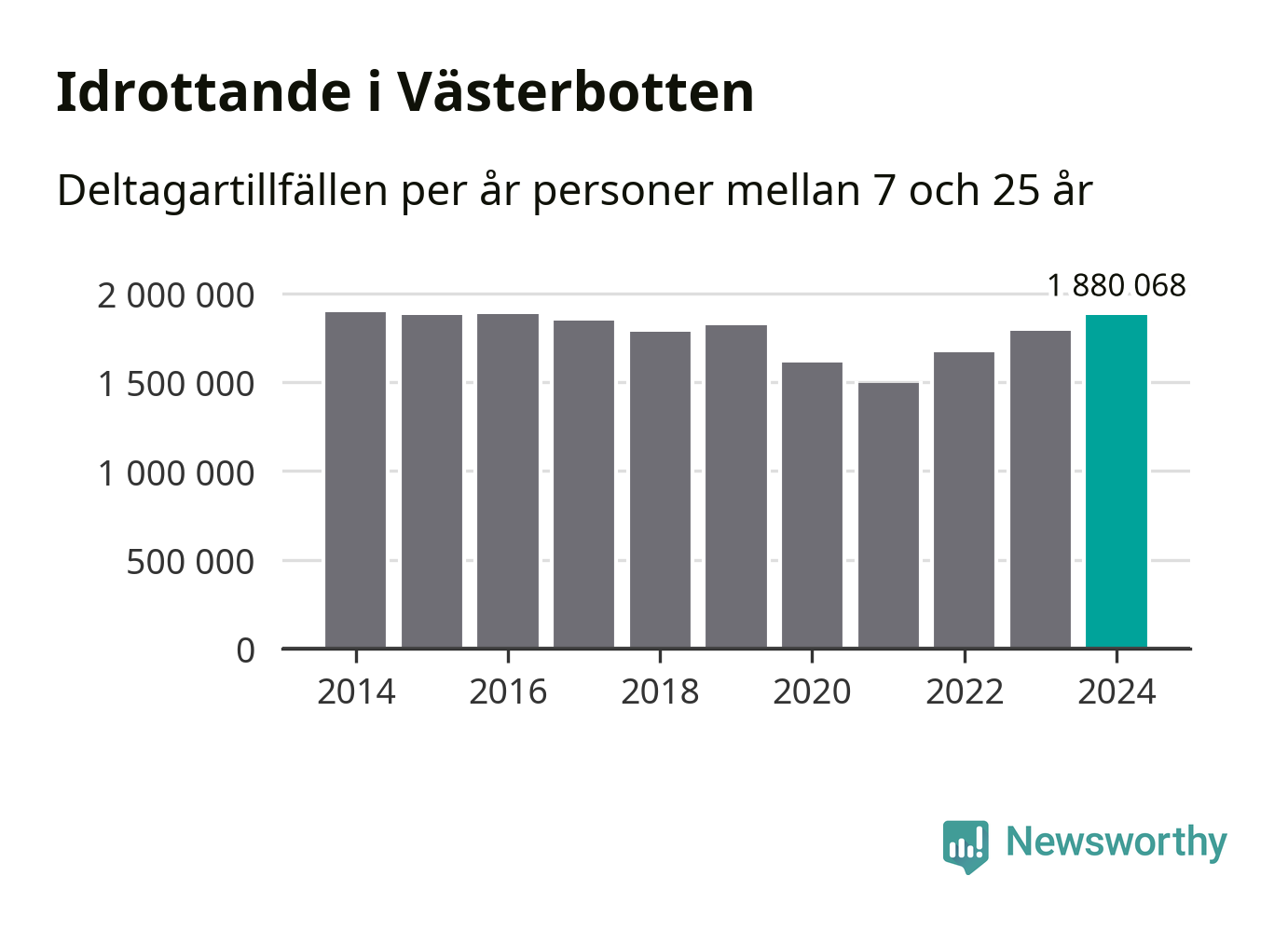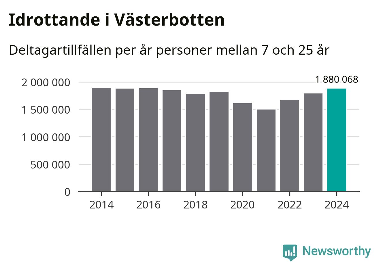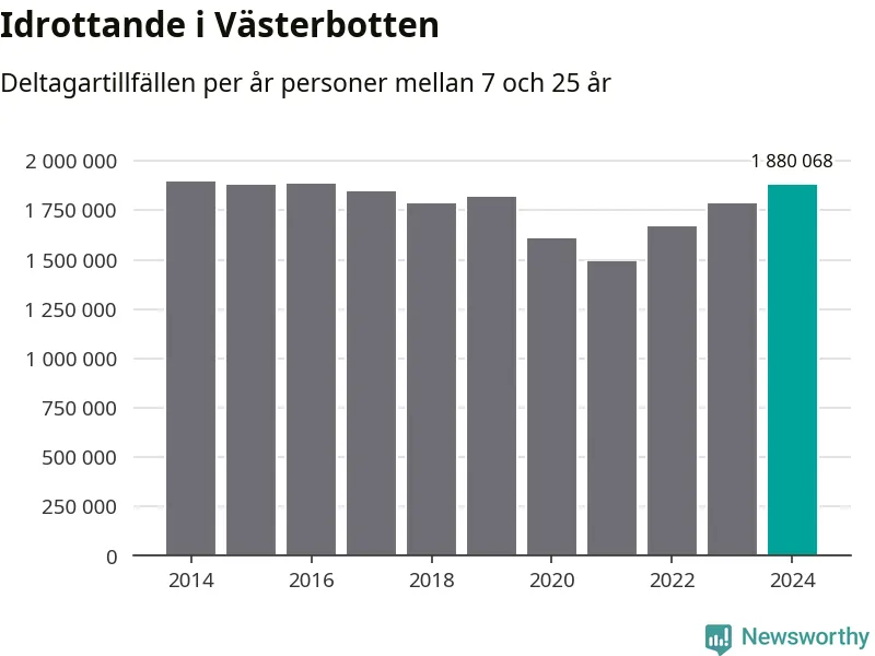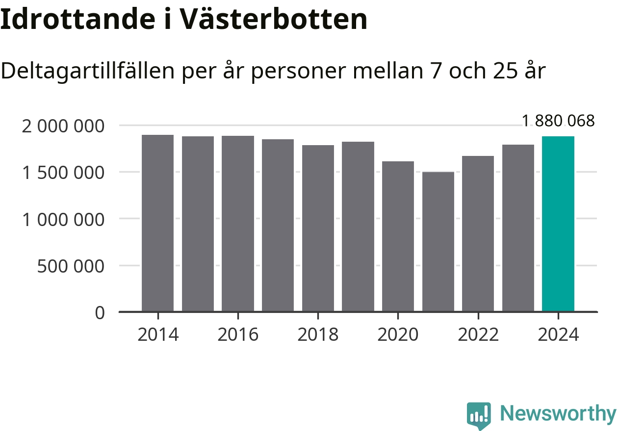 För tredje året i rad ökade aktiviteten inom ungdomsidrotten i Västerbotten under 2024. Det visar nya siffror om utbetalt Lok-stöd, som delas ut till föreningar anslutna till Riksidrottsförbundet specialidrottsförbund. Stödet riktar sig till föreningar som bedriver verksamhet för deltagare i åldern 7-25 år. Under året rapporterade föreningarna i Västerbotten runt 1 880 000 deltagartillfällen, vilket är en ökning med fem procent jämfört med 2023 och den högsta siffran i länet sedan 2016. I riket som helhet ökade antalet deltagartillfällen med fem procent under 2024.