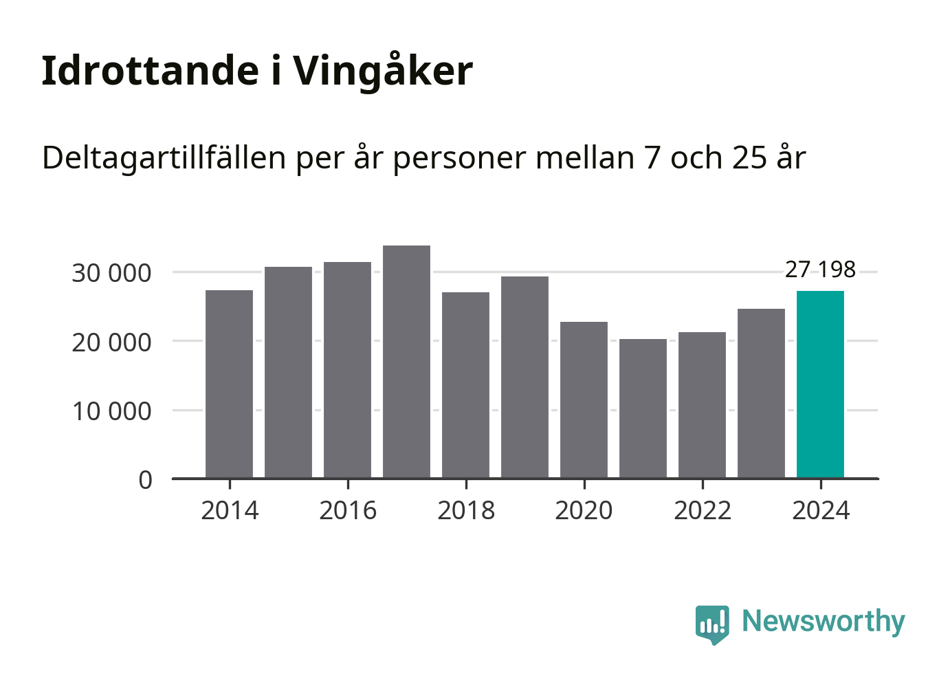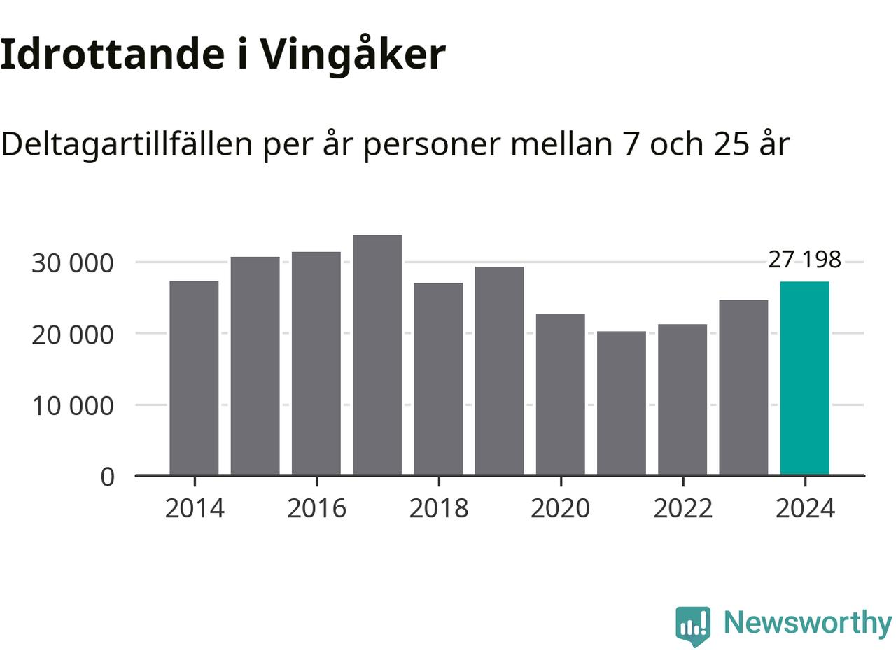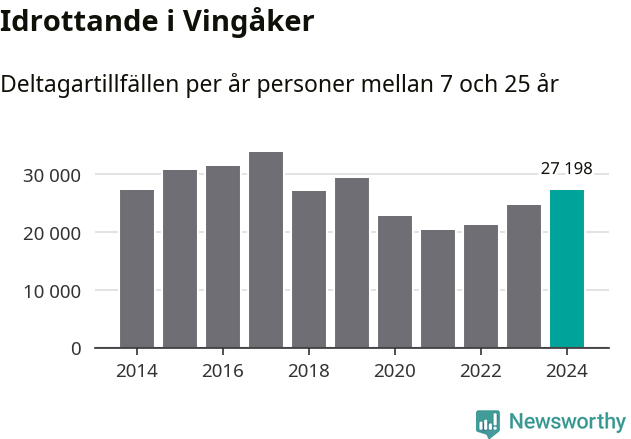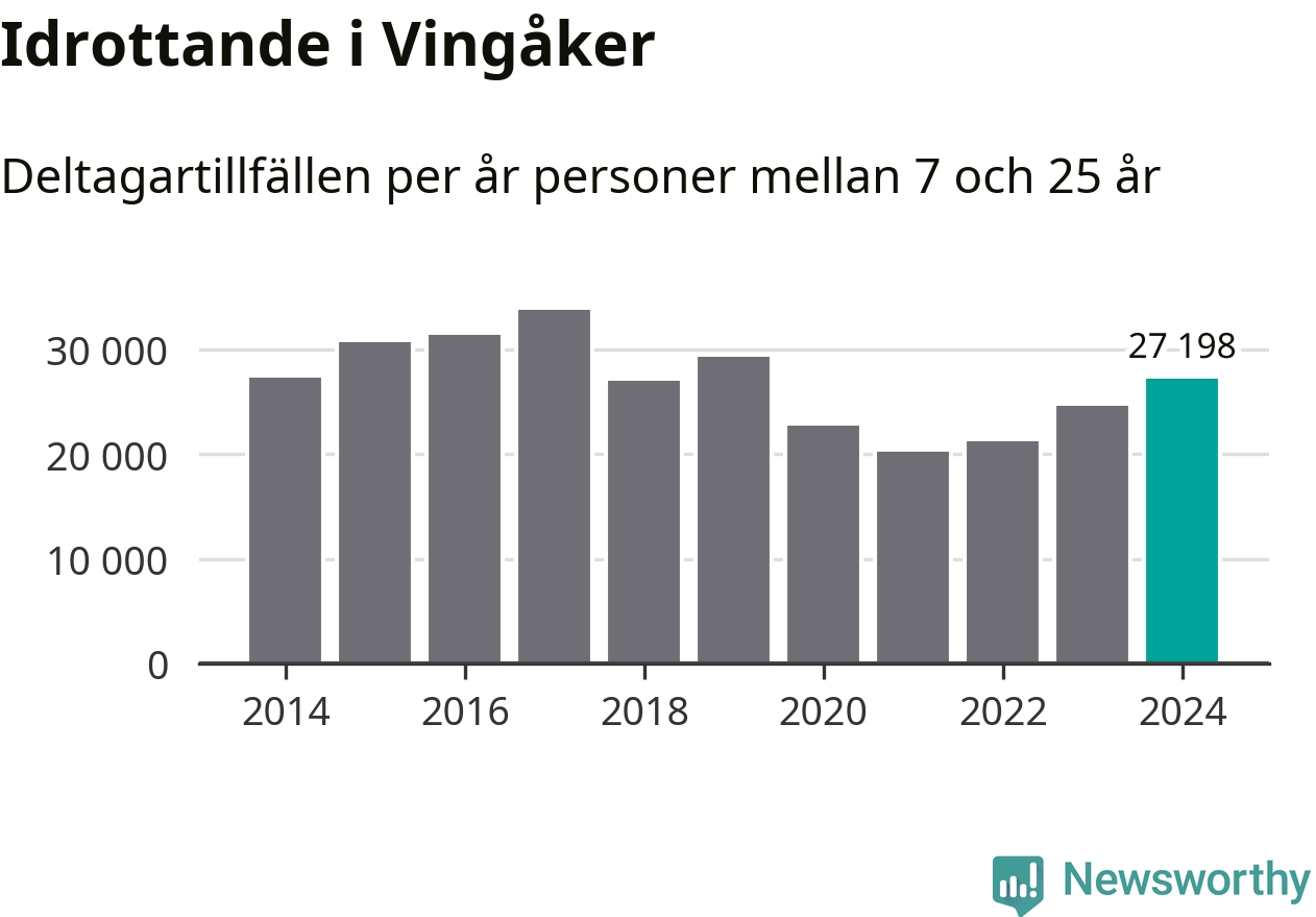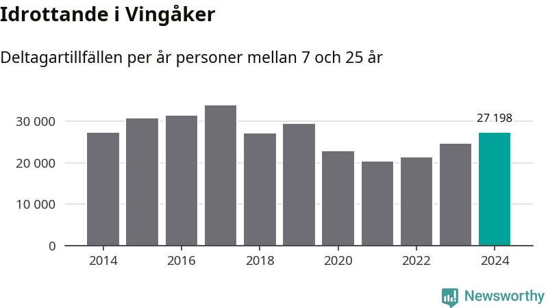 De 27 000 deltagartillfällen innebär att varje invånare i Vingåker mellan 7 och 25 år i snitt deltog i knappt 16 träningar, matcher eller turneringar under 2024. Det är en relativt låg siffra, nationellt sett. Flest deltagartillfällen per invånare i Södermanland hade Strängnäs kommun med 25 deltagartillfällen per invånare. I andra änden av listan finns Flens kommun, 14 deltagartillfällen per invånare. Värt att nämna är att deltagartillfällena räknas i den kommun föreningen finns, det kan alltså vara ungdomar från en annan kommun som deltar.