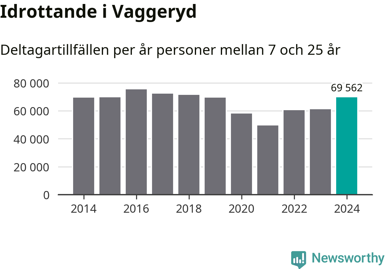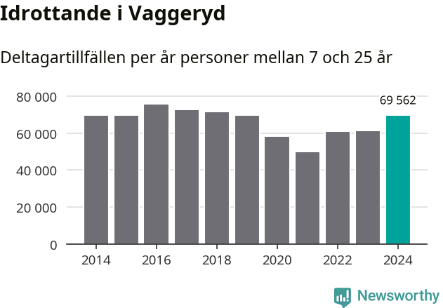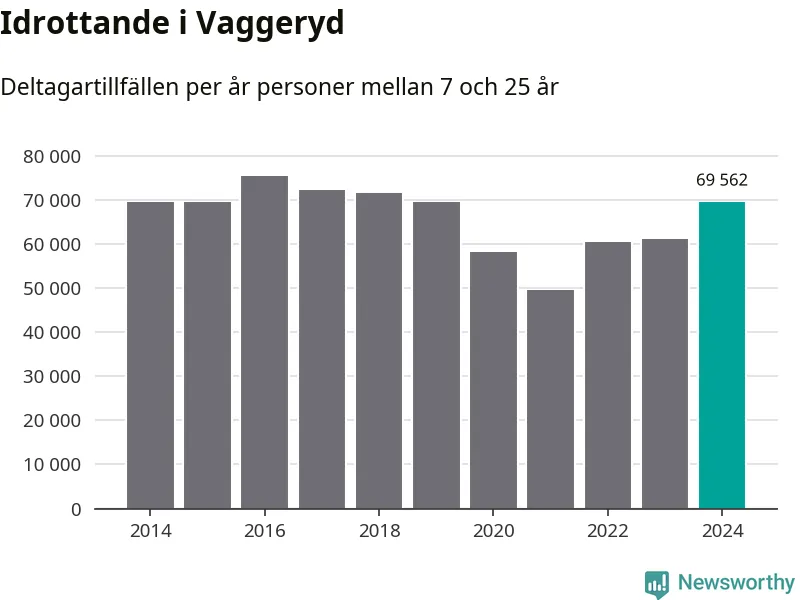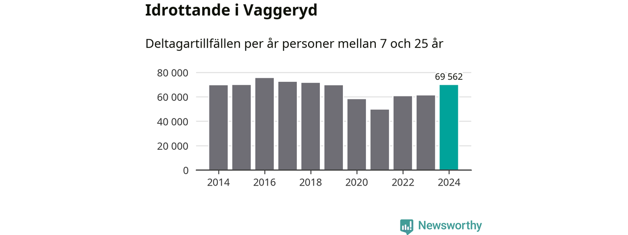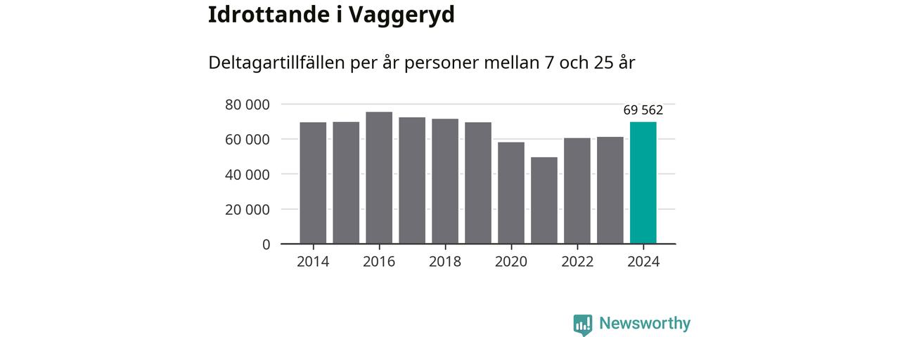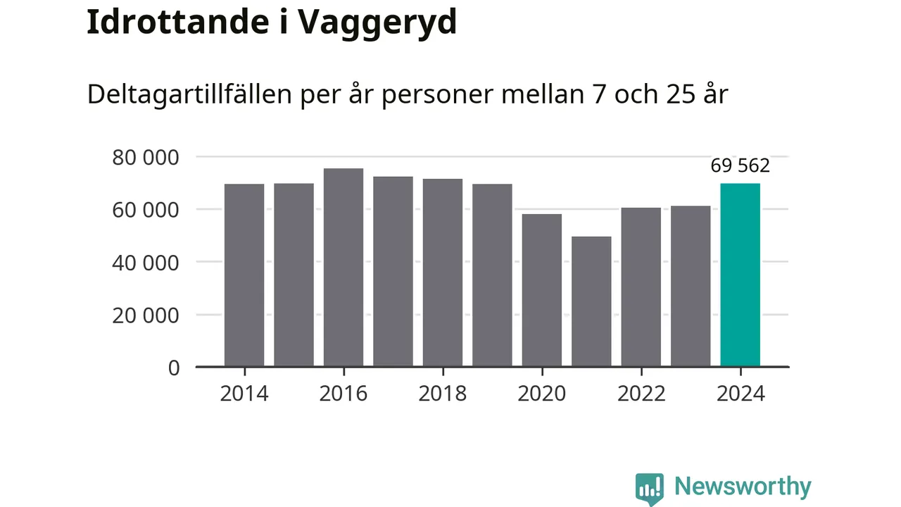 Vaggeryds-ungdomarna idrottade mer under 2024. Det visar nya siffror om utbetalt Lok-stöd, som delas ut till föreningar anslutna till Riksidrottsförbundet specialidrottsförbund. Stödet riktar sig till föreningar som bedriver verksamhet för deltagare i åldern 7-25 år. Under året rapporterade föreningarna i Vaggeryd runt 70 000 deltagartillfällen, vilket är en ökning med 14 procent jämfört med 2023. I riket som helhet ökade antalet deltagartillfällen med fem procent under 2024.