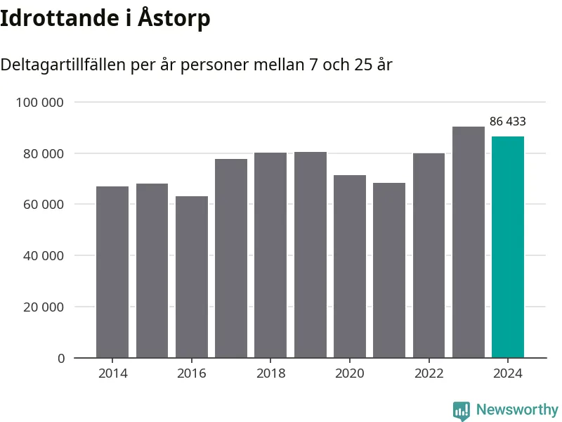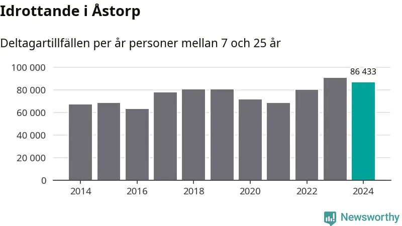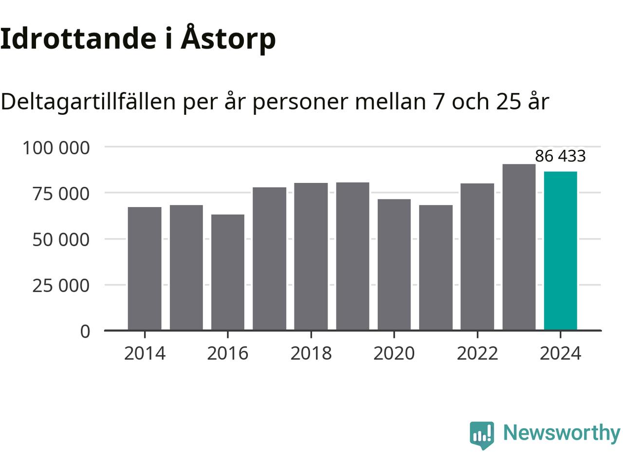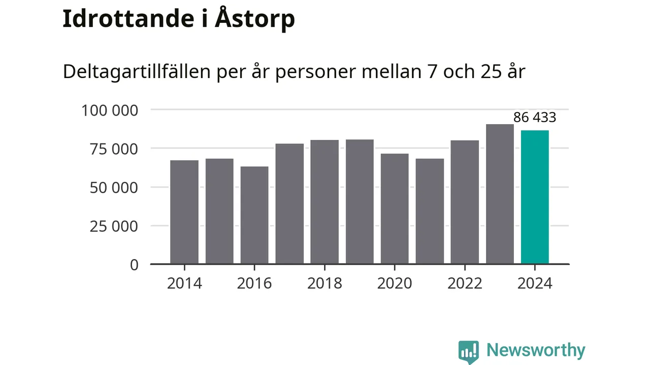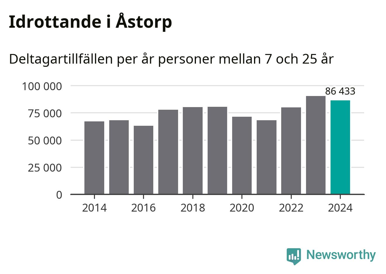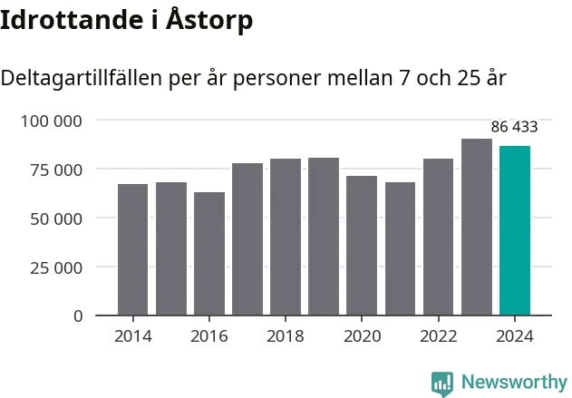 Åstorps-ungdomarna idrottade mindre under 2024. Det visar nya siffror om utbetalt Lok-stöd, som delas ut till föreningar anslutna till Riksidrottsförbundet specialidrottsförbund. Stödet riktar sig till föreningar som bedriver verksamhet för deltagare i åldern 7-25 år. Under året rapporterade föreningarna i Åstorp runt 86 000 deltagartillfällen, vilket är en minskning med fyra procent jämfört med 2023. I riket som helhet ökade antalet deltagartillfällen med fem procent under 2024.
