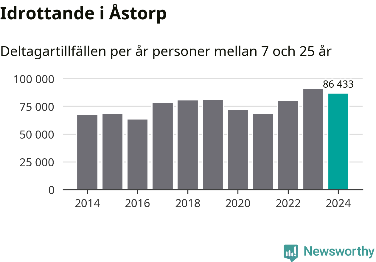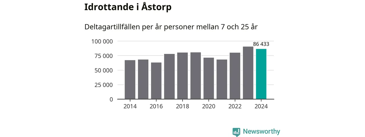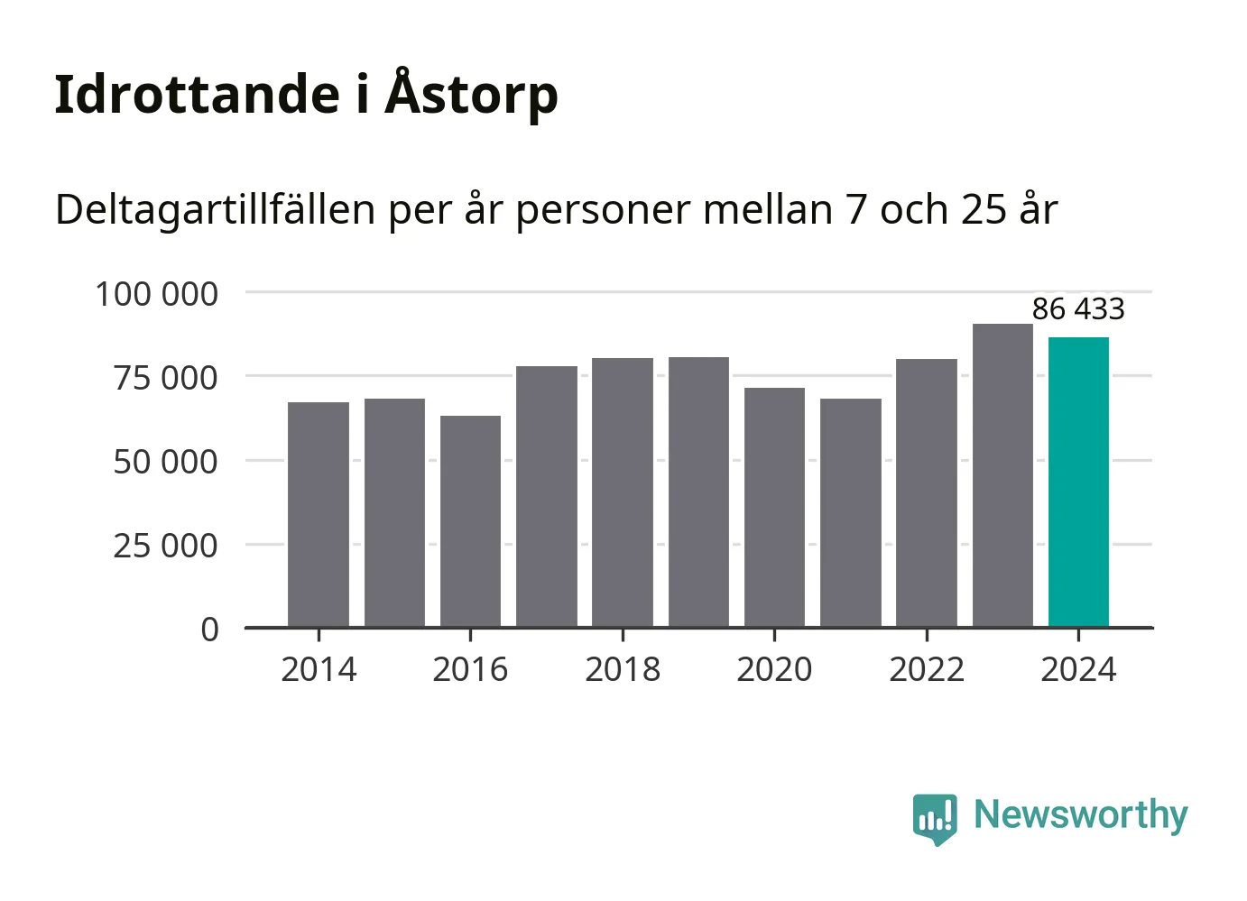 De 86 000 deltagartillfällen innebär att varje invånare i Åstorp mellan 7 och 25 år i snitt deltog i 22 träningar, matcher eller turneringar under 2024. Flest deltagartillfällen per invånare i Skåne hade Lomma kommun med 46 deltagartillfällen per invånare. I andra änden av listan finns Perstorps kommun, 12 deltagartillfällen per invånare. Värt att nämna är att deltagartillfällena räknas i den kommun föreningen finns, det kan alltså vara ungdomar från en annan kommun som deltar.