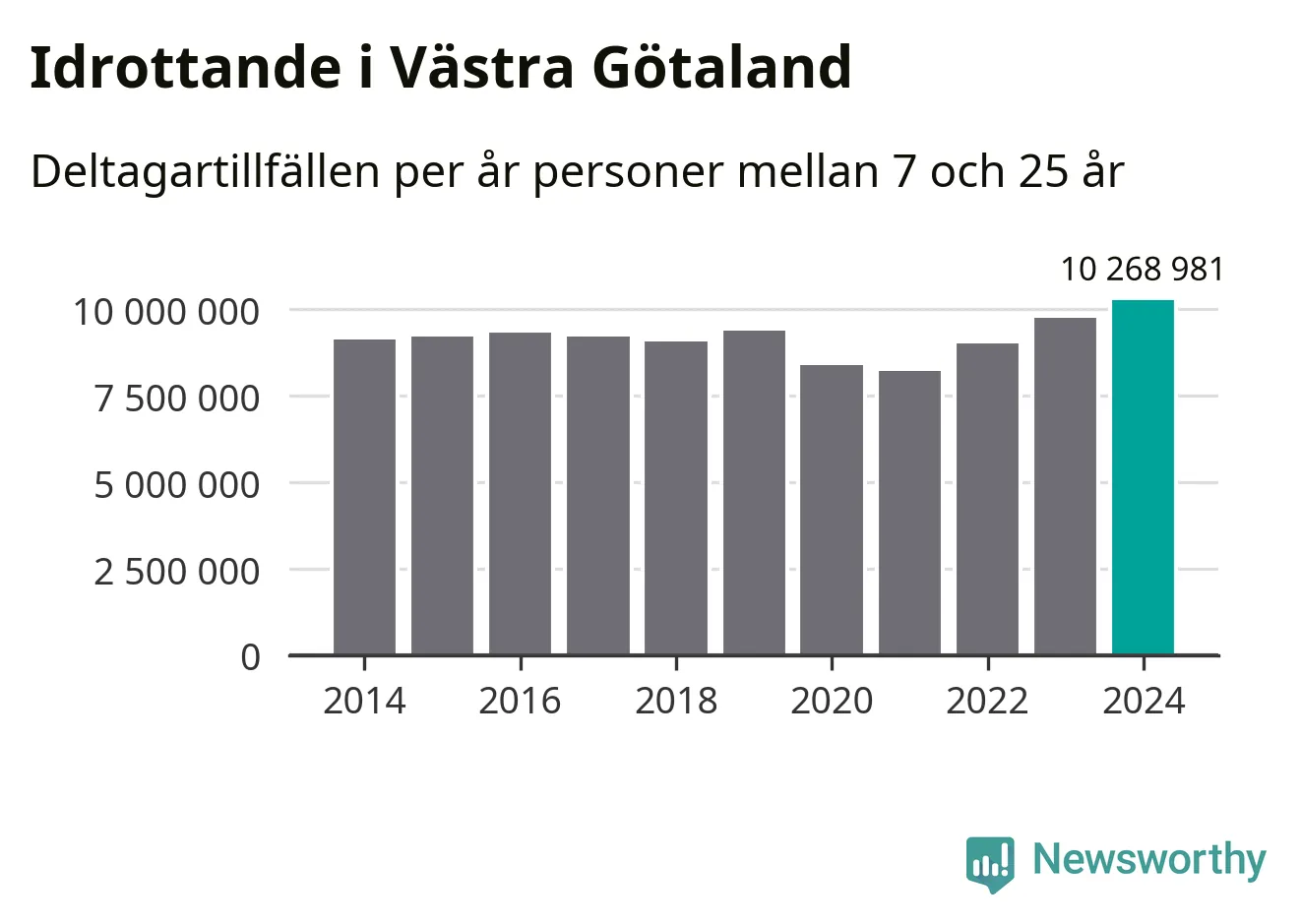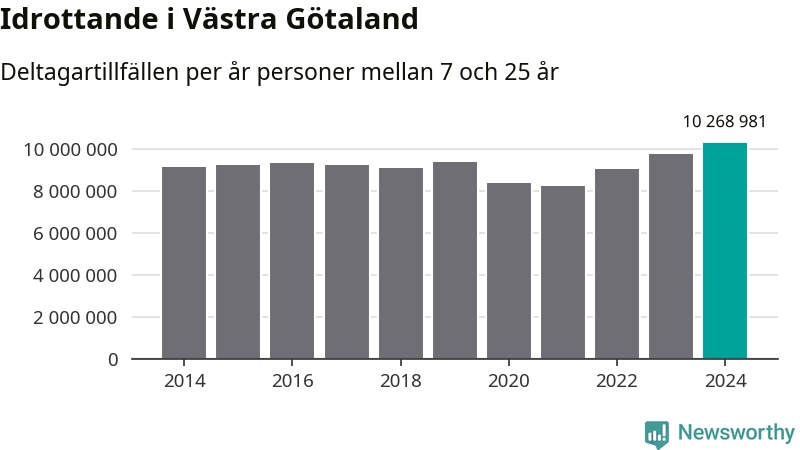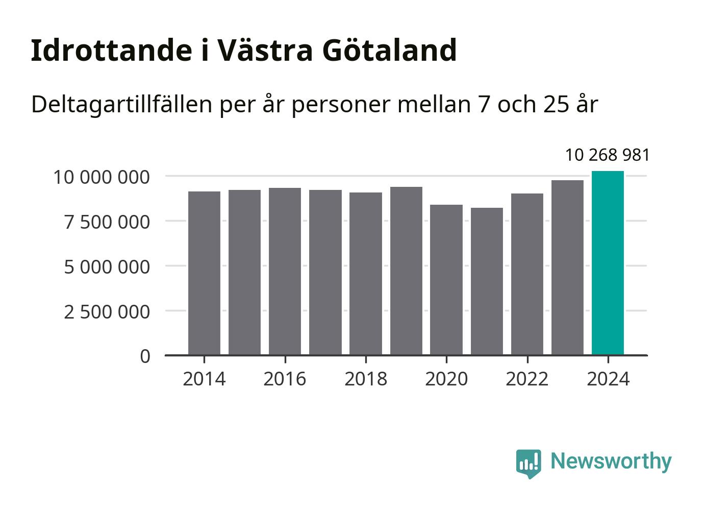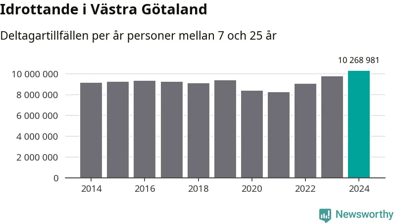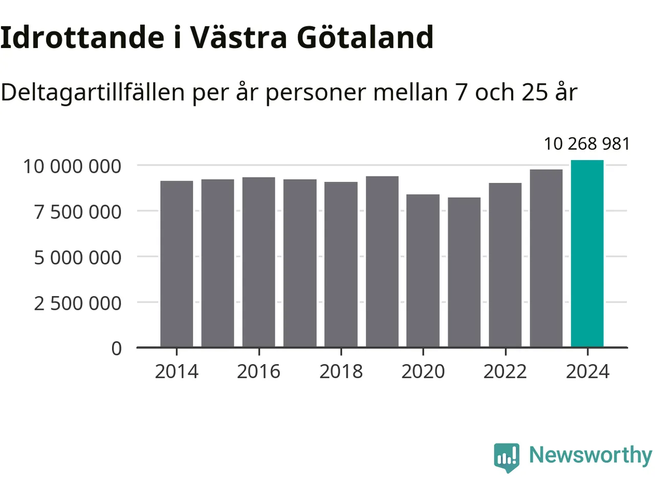 För tredje året i rad ökade aktiviteten inom ungdomsidrotten i Västra Götaland under 2024. Det visar nya siffror om utbetalt Lok-stöd, som delas ut till föreningar anslutna till Riksidrottsförbundet specialidrottsförbund. Stödet riktar sig till föreningar som bedriver verksamhet för deltagare i åldern 7-25 år. Under året rapporterade föreningarna i Västra Götaland runt 10 269 000 deltagartillfällen, vilket är en ökning med fem procent jämfört med 2023, och den högsta siffran i länet sedan åtminstone 2014. I riket som helhet ökade antalet deltagartillfällen med fem procent under 2024.