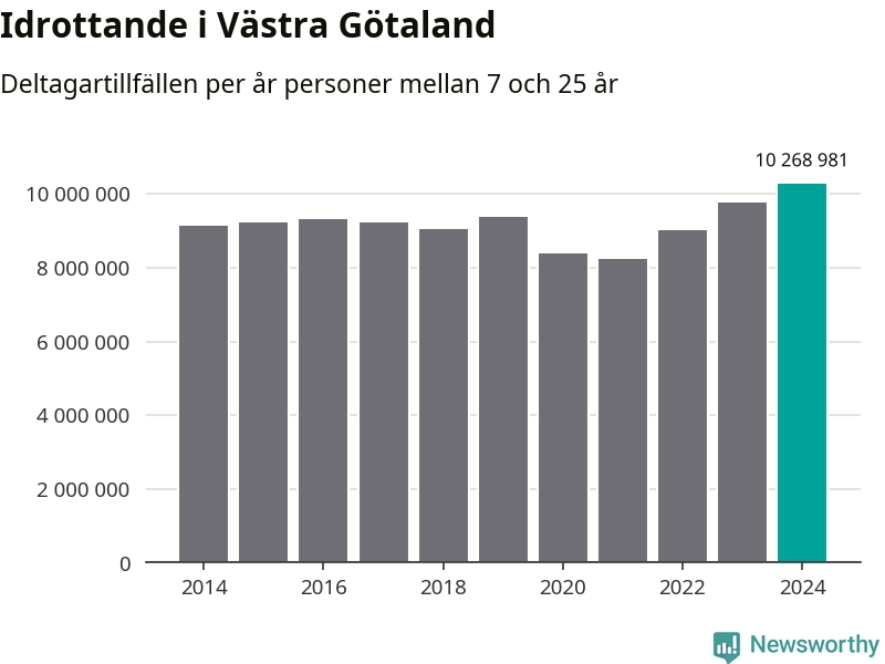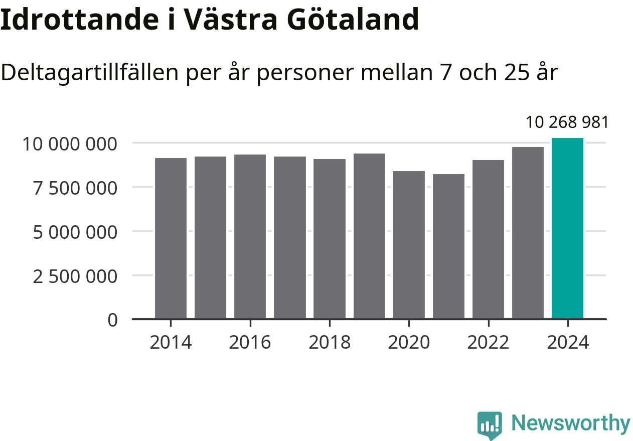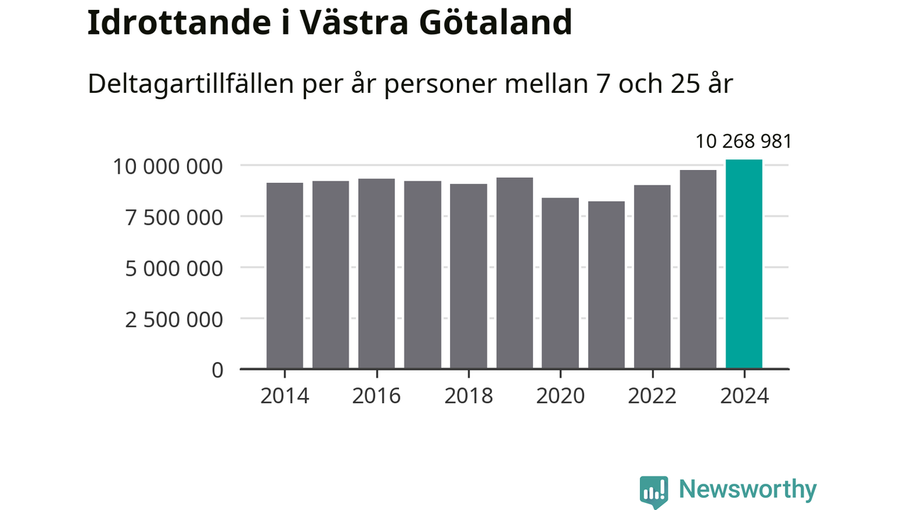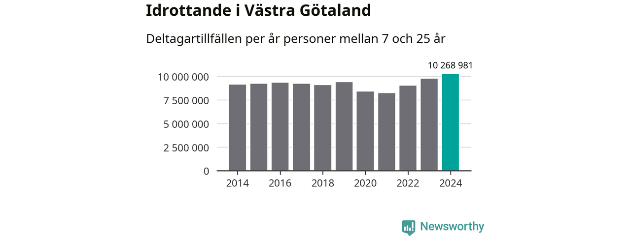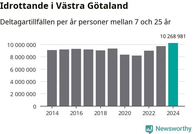 För tredje året i rad ökade aktiviteten inom ungdomsidrotten i Västra Götaland under 2024. Det visar nya siffror om utbetalt Lok-stöd, som delas ut till föreningar anslutna till Riksidrottsförbundet specialidrottsförbund. Stödet riktar sig till föreningar som bedriver verksamhet för deltagare i åldern 7-25 år. Under året rapporterade föreningarna i Västra Götaland runt 10 269 000 deltagartillfällen, vilket är en ökning med fem procent jämfört med 2023, och den högsta siffran i länet sedan åtminstone 2014. I riket som helhet ökade antalet deltagartillfällen med fem procent under 2024.