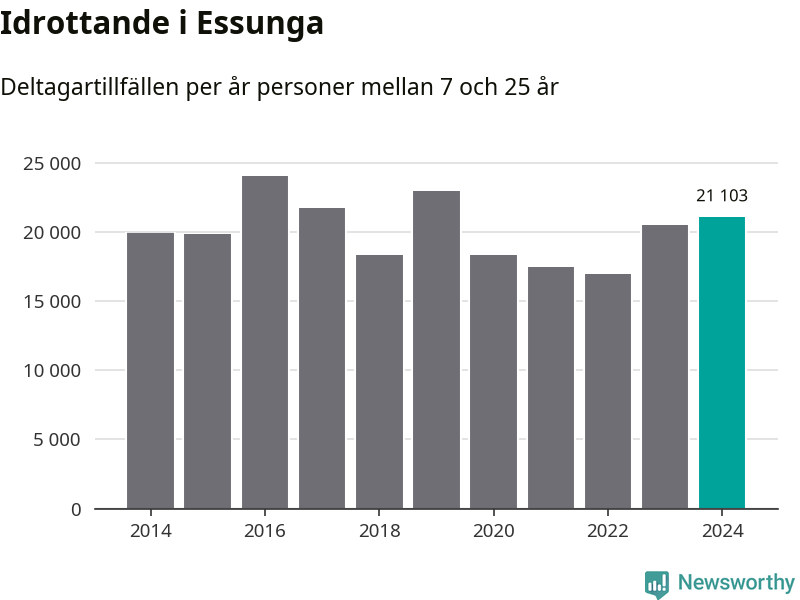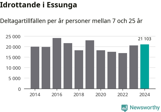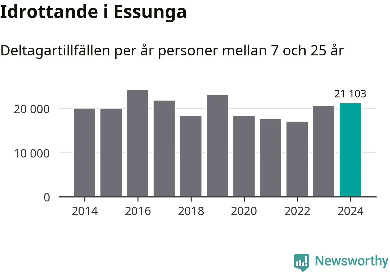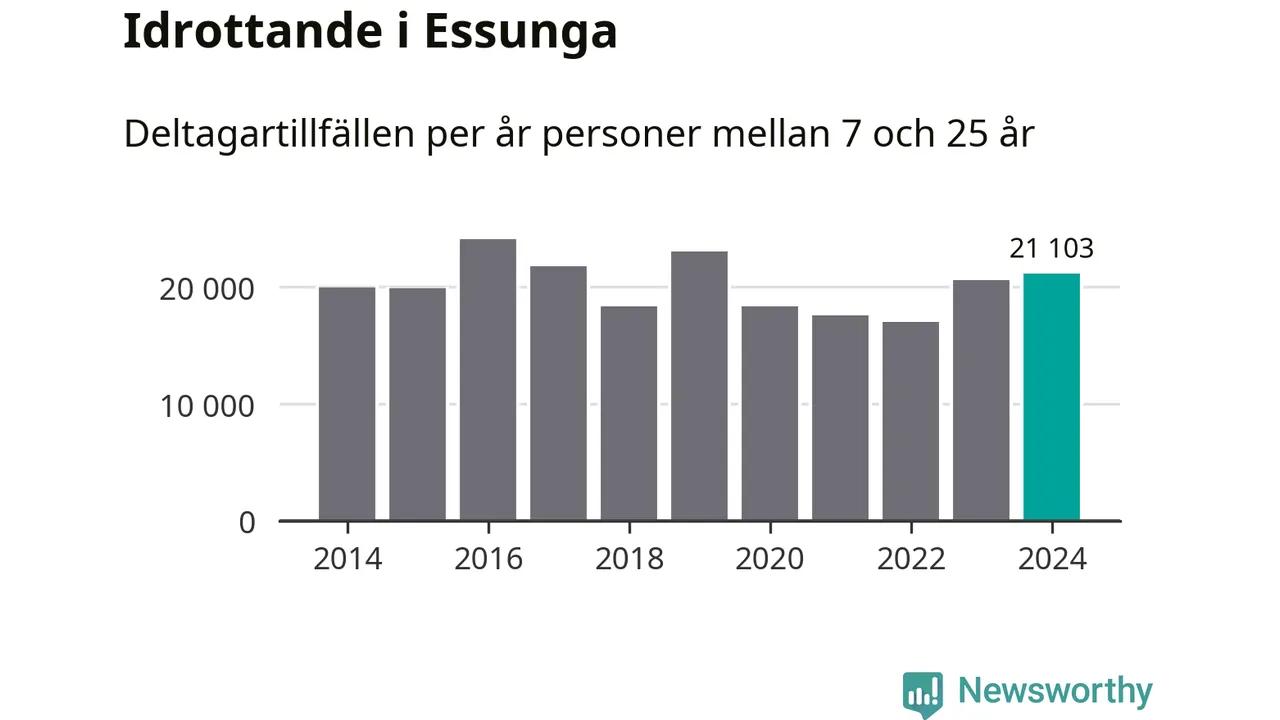 För andra året i rad ökade aktiviteten inom ungdomsidrotten i Essunga under 2024. Det visar nya siffror om utbetalt Lok-stöd, som delas ut till föreningar anslutna till Riksidrottsförbundet specialidrottsförbund. Stödet riktar sig till föreningar som bedriver verksamhet för deltagare i åldern 7-25 år. Under året rapporterade föreningarna i Essunga runt 21 000 deltagartillfällen, vilket är en ökning med tre procent jämfört med 2023. I riket som helhet ökade antalet deltagartillfällen med fem procent under 2024.