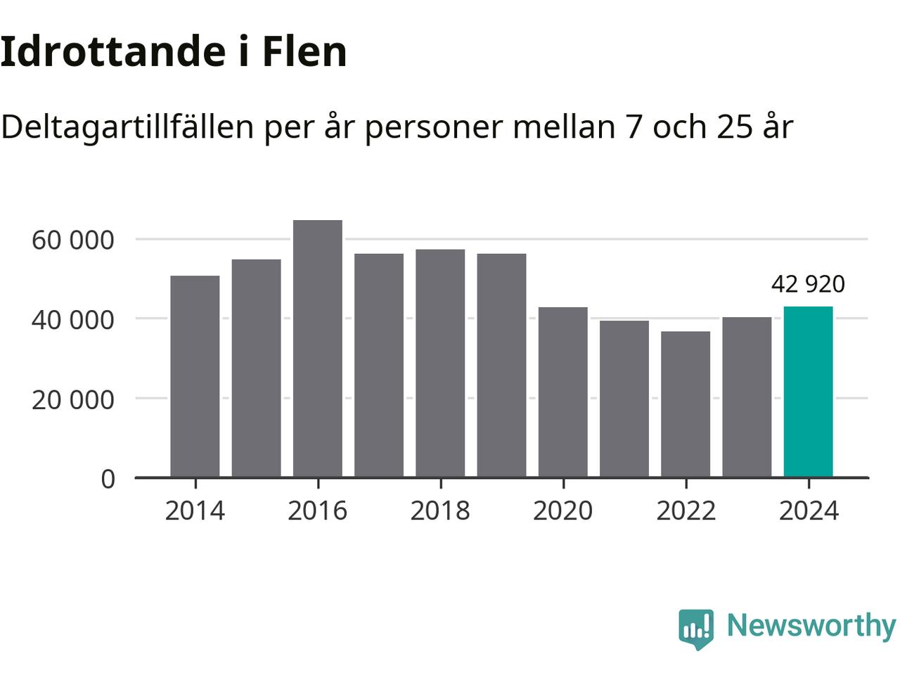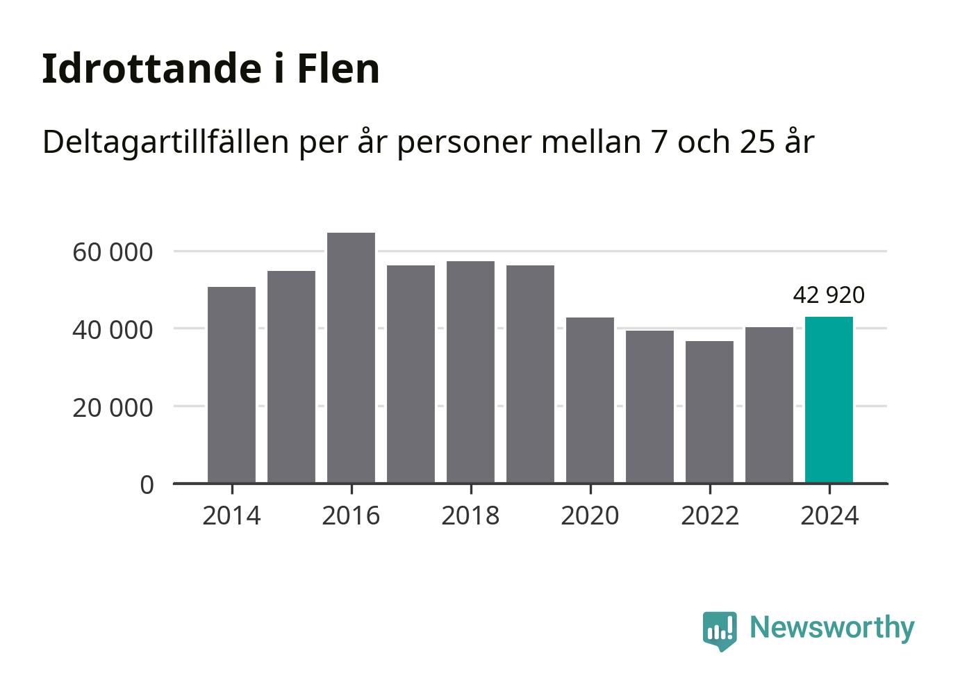 De 43 000 deltagartillfällen innebär att varje invånare i Flen mellan 7 och 25 år i snitt deltog i 14 träningar, matcher eller turneringar under 2024. Det är den lägsta siffran i Södermanland. Flest deltagartillfällen per invånare i länet hade Strängnäs kommun med 25 deltagartillfällen per invånare. Värt att nämna är att deltagartillfällena räknas i den kommun föreningen finns, det kan alltså vara ungdomar från en annan kommun som deltar.