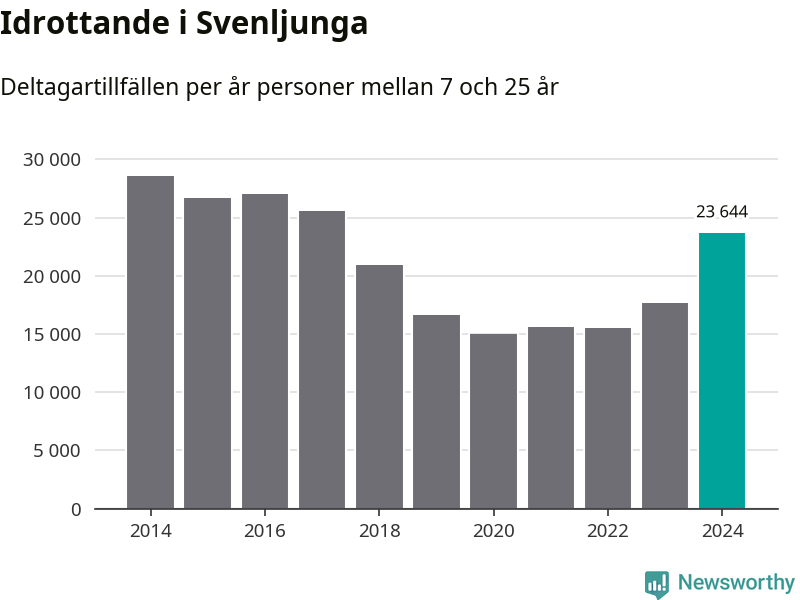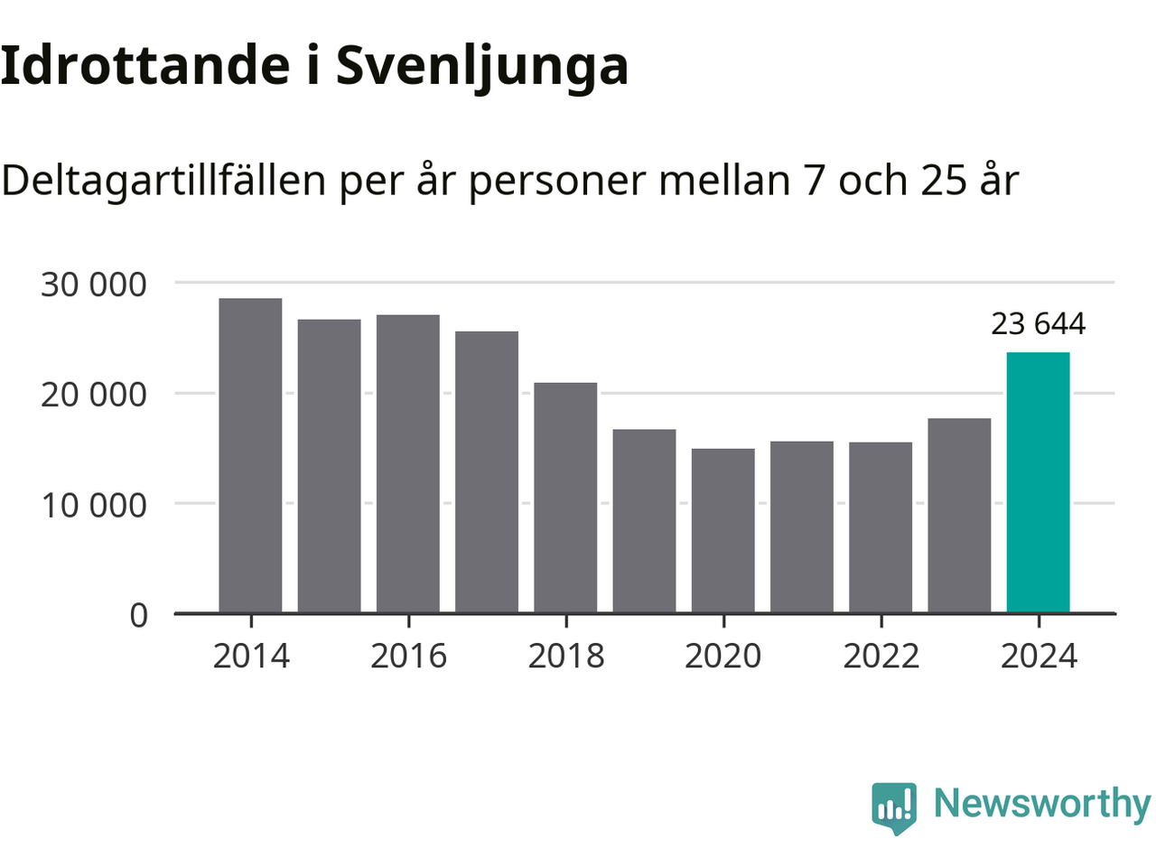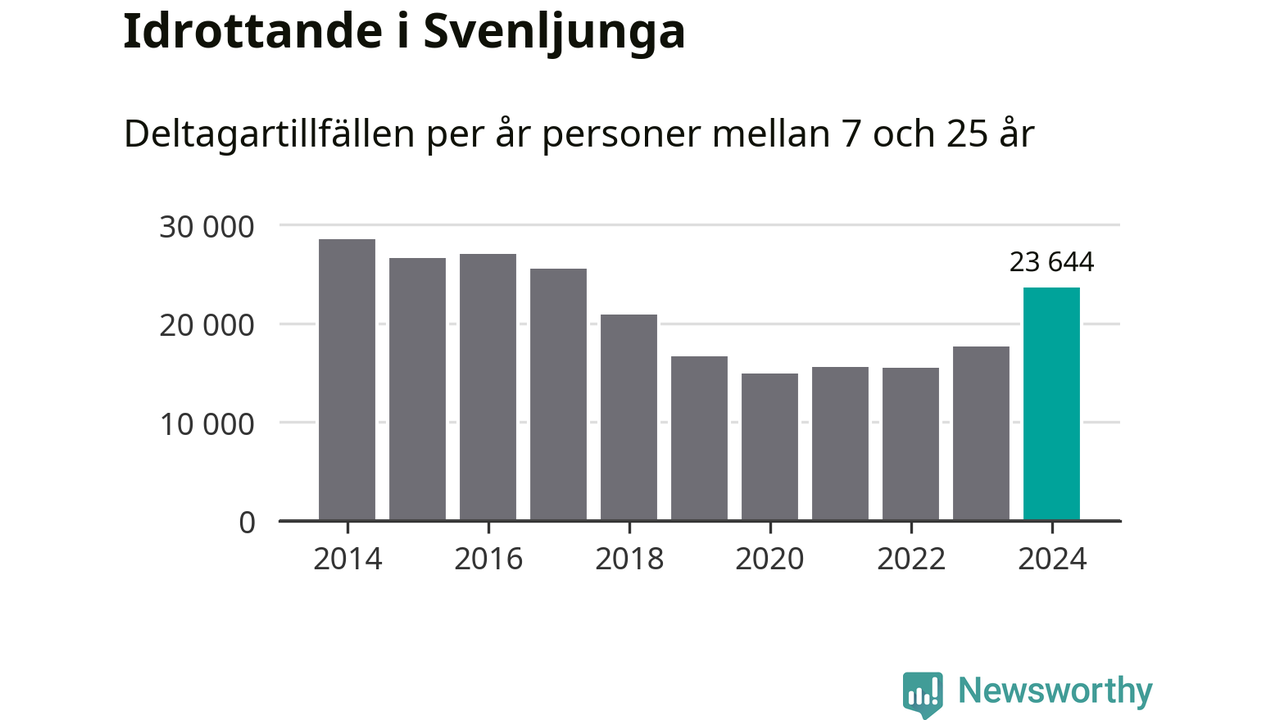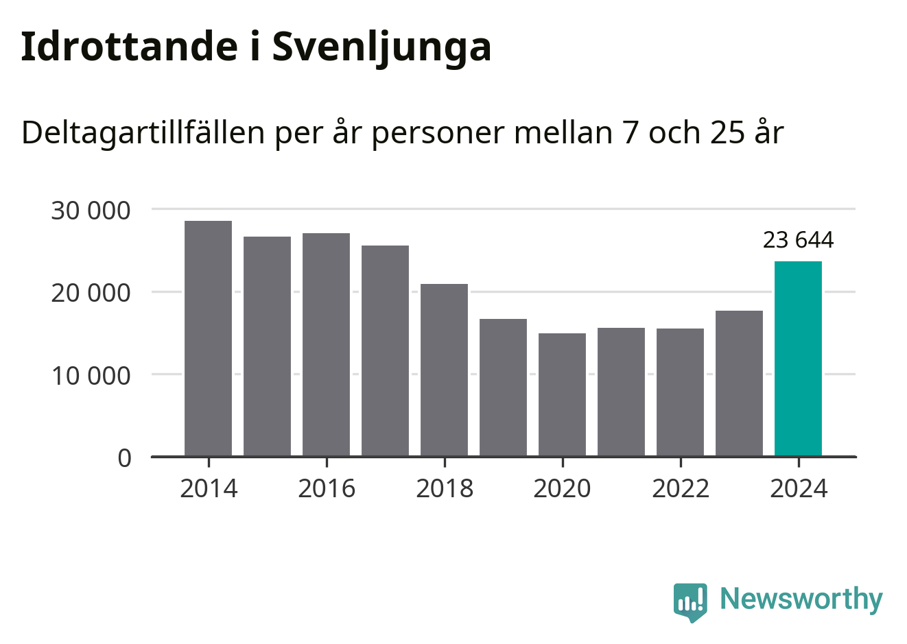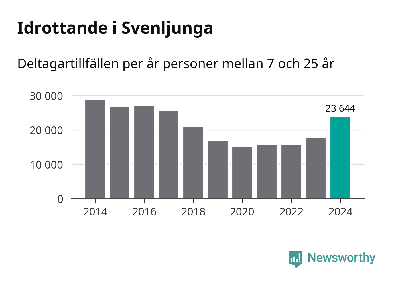 De knappt 24 000 deltagartillfällen innebär att varje invånare i Svenljunga mellan 7 och 25 år i snitt deltog i 11 träningar, matcher eller turneringar under 2024. Det är den lägsta siffran i Västra Götaland. Flest deltagartillfällen per invånare i länet hade Partille kommun med 39 deltagartillfällen per invånare. Värt att nämna är att deltagartillfällena räknas i den kommun föreningen finns, det kan alltså vara ungdomar från en annan kommun som deltar.