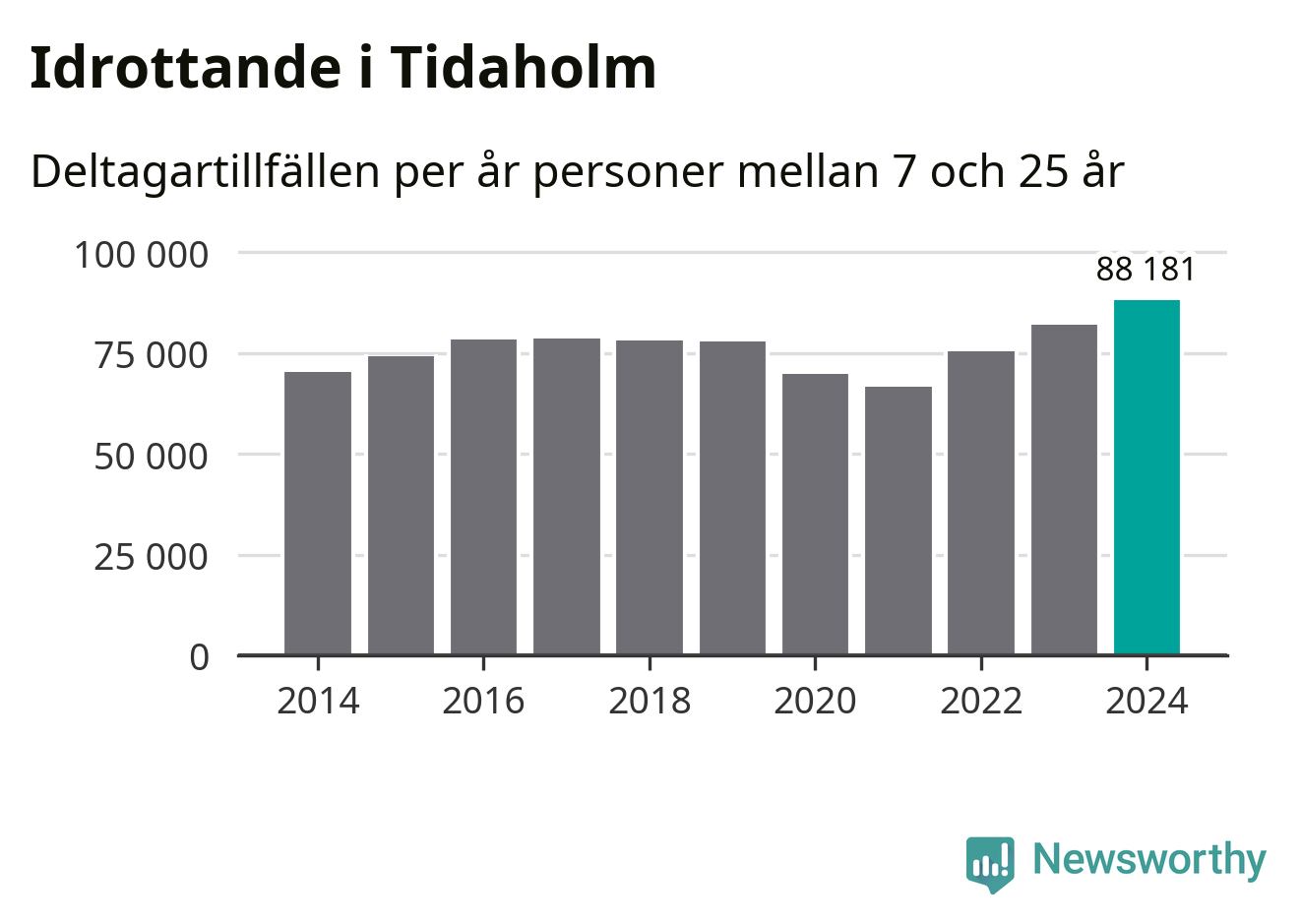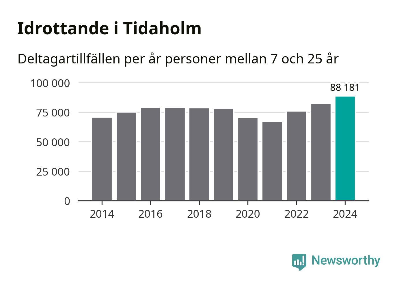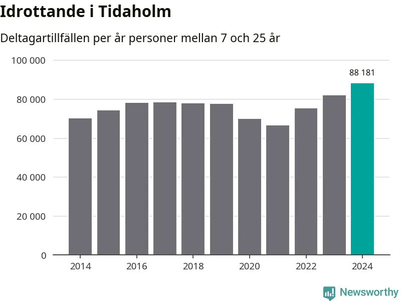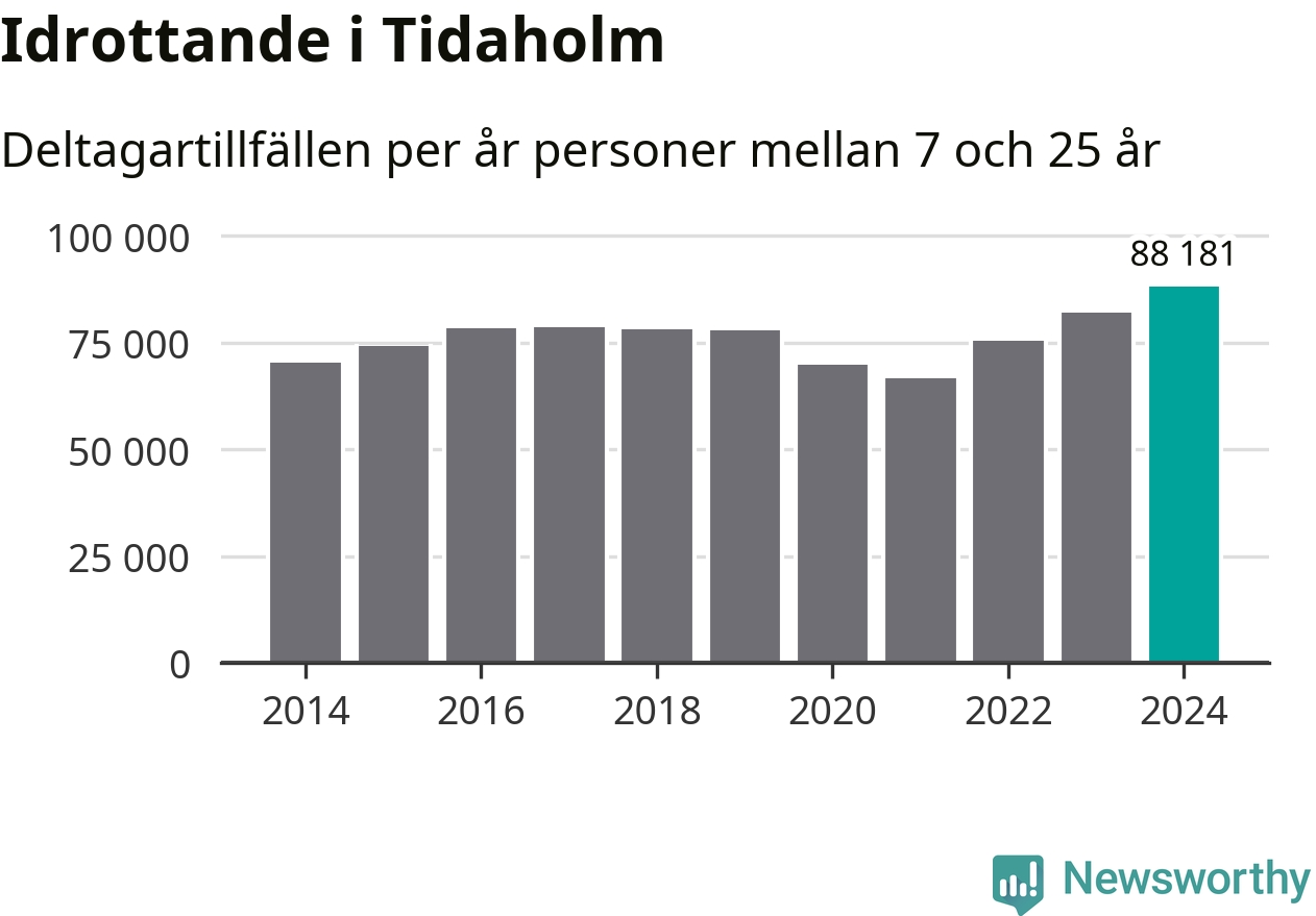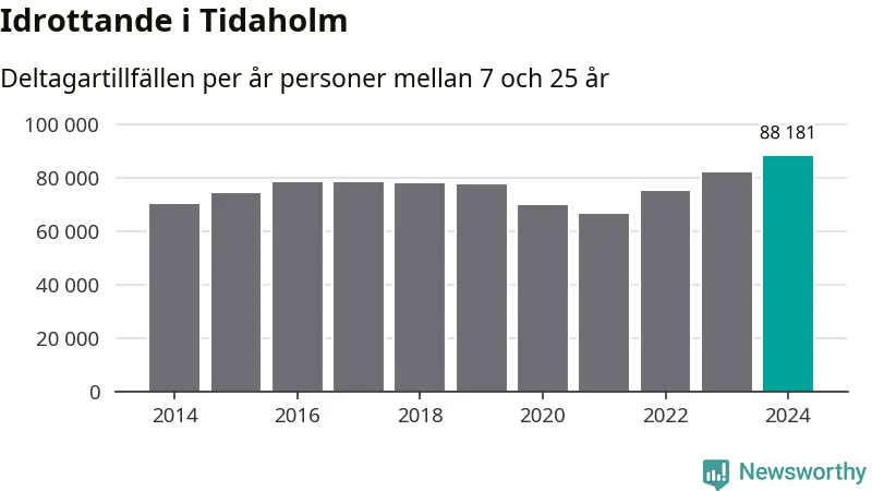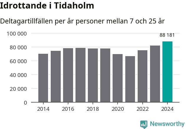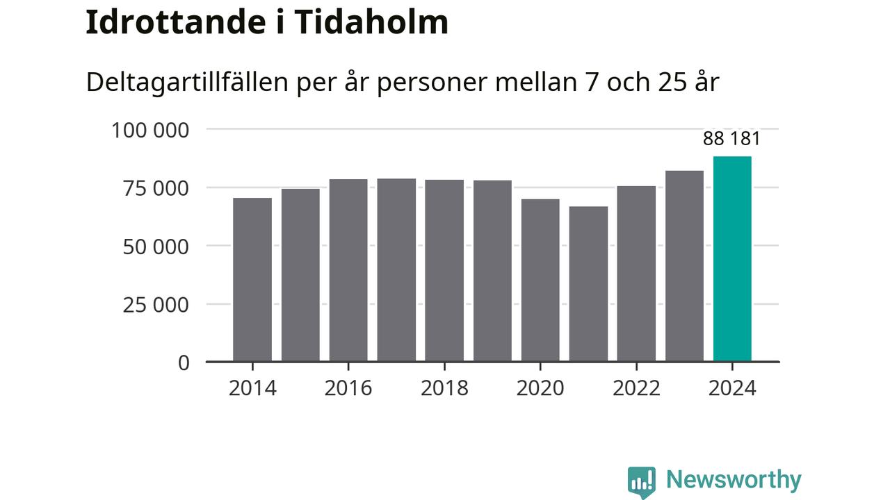 För tredje året i rad ökade aktiviteten inom ungdomsidrotten i Tidaholm under 2024. Det visar nya siffror om utbetalt Lok-stöd, som delas ut till föreningar anslutna till Riksidrottsförbundet specialidrottsförbund. Stödet riktar sig till föreningar som bedriver verksamhet för deltagare i åldern 7-25 år. Under året rapporterade föreningarna i Tidaholm runt 88 000 deltagartillfällen, vilket är en ökning med sju procent jämfört med 2023, och den högsta siffran i kommunen sedan åtminstone 2014. I riket som helhet ökade antalet deltagartillfällen med fem procent under 2024.
