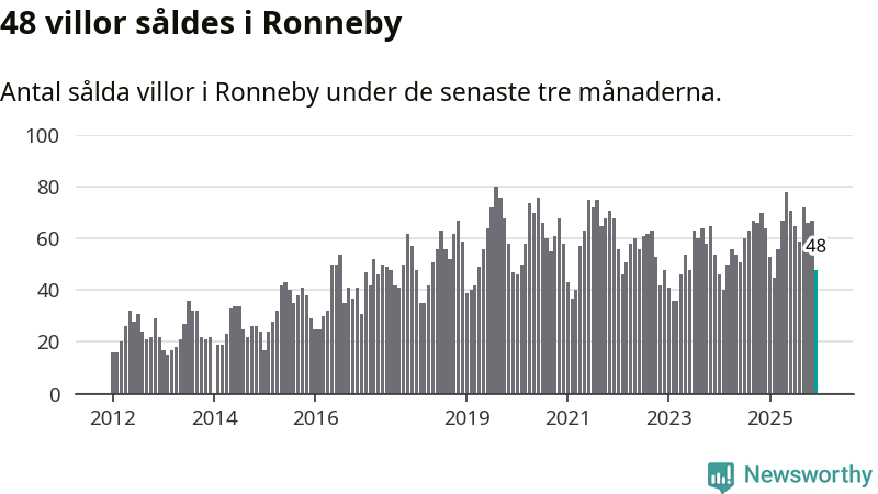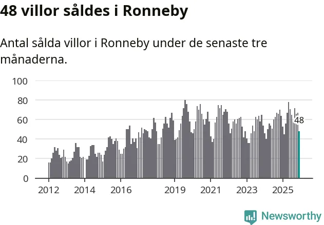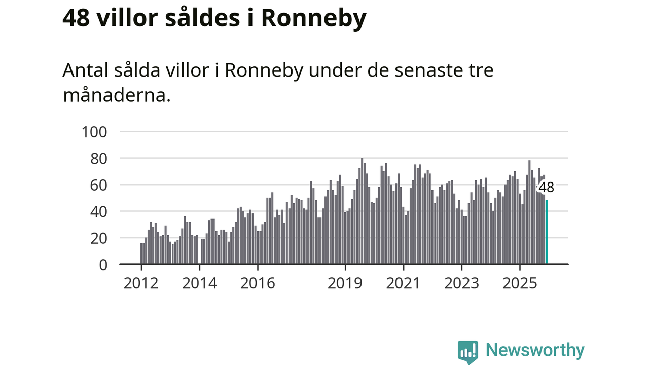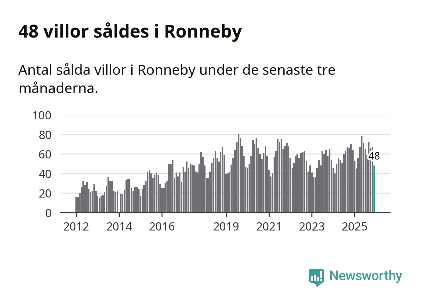 Mellan oktober och december såldes 48 villor i Ronneby kommun. Det är relativt få sett till aktiviteten på bostadsmarknaden i kommunen under de senaste tolv månaderna, samt det historiska snittet för den här tiden på året.