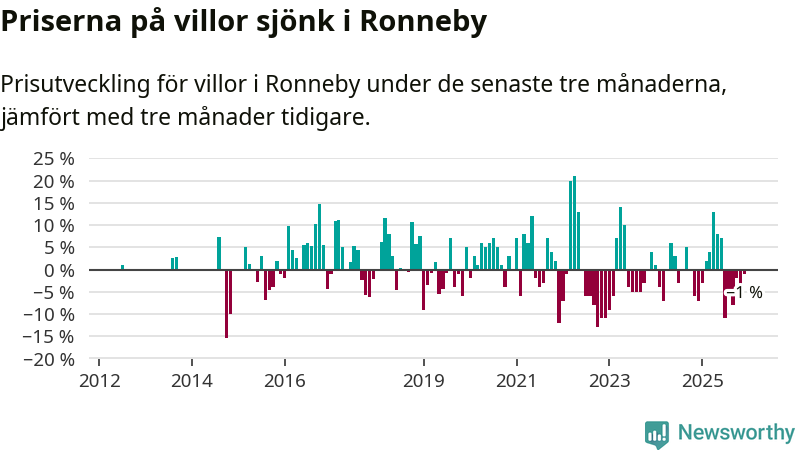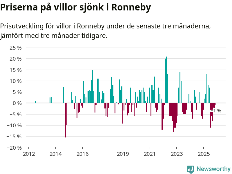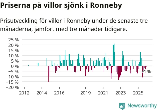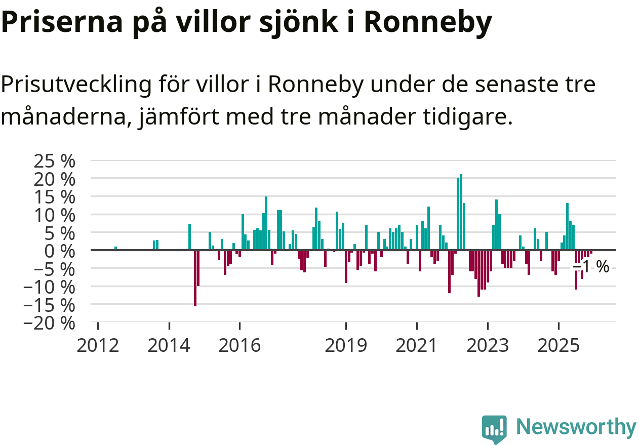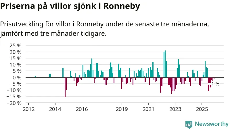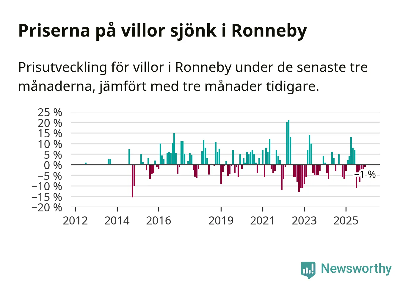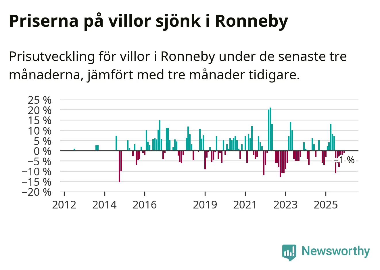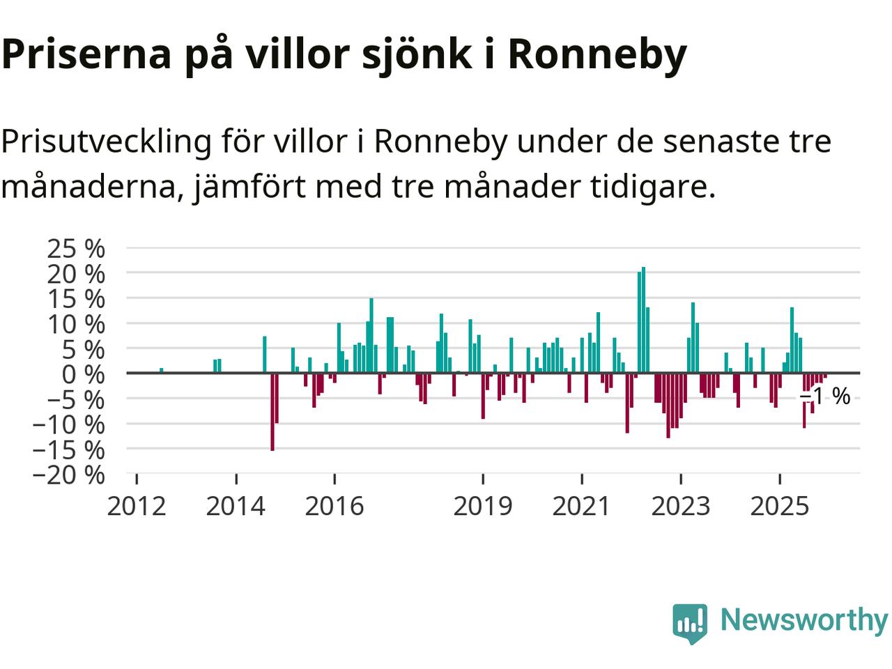 Statistiken visar även på en prisnedgång i Ronneby kommun. Medelpriset på försäljningarna av villor i kommunen var 1 procent lägre än för tre månader sedan. Även i hela Blekinge sjunker villapriserna. I hela länet noterades en prisnedgång på 3 procent.