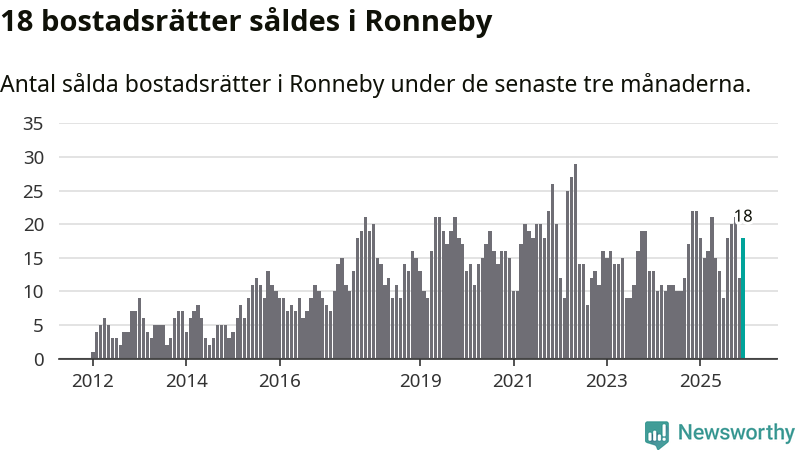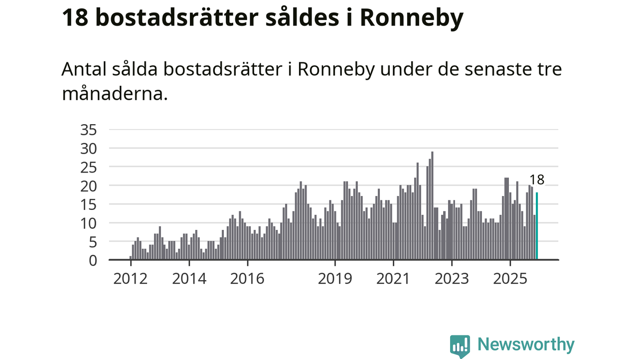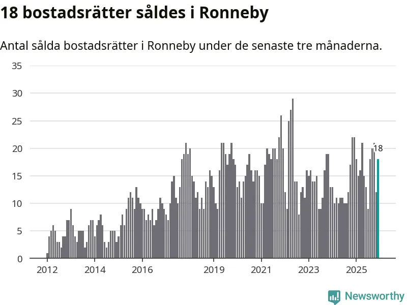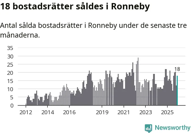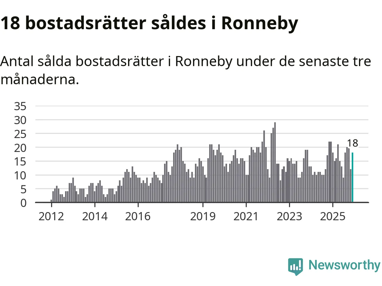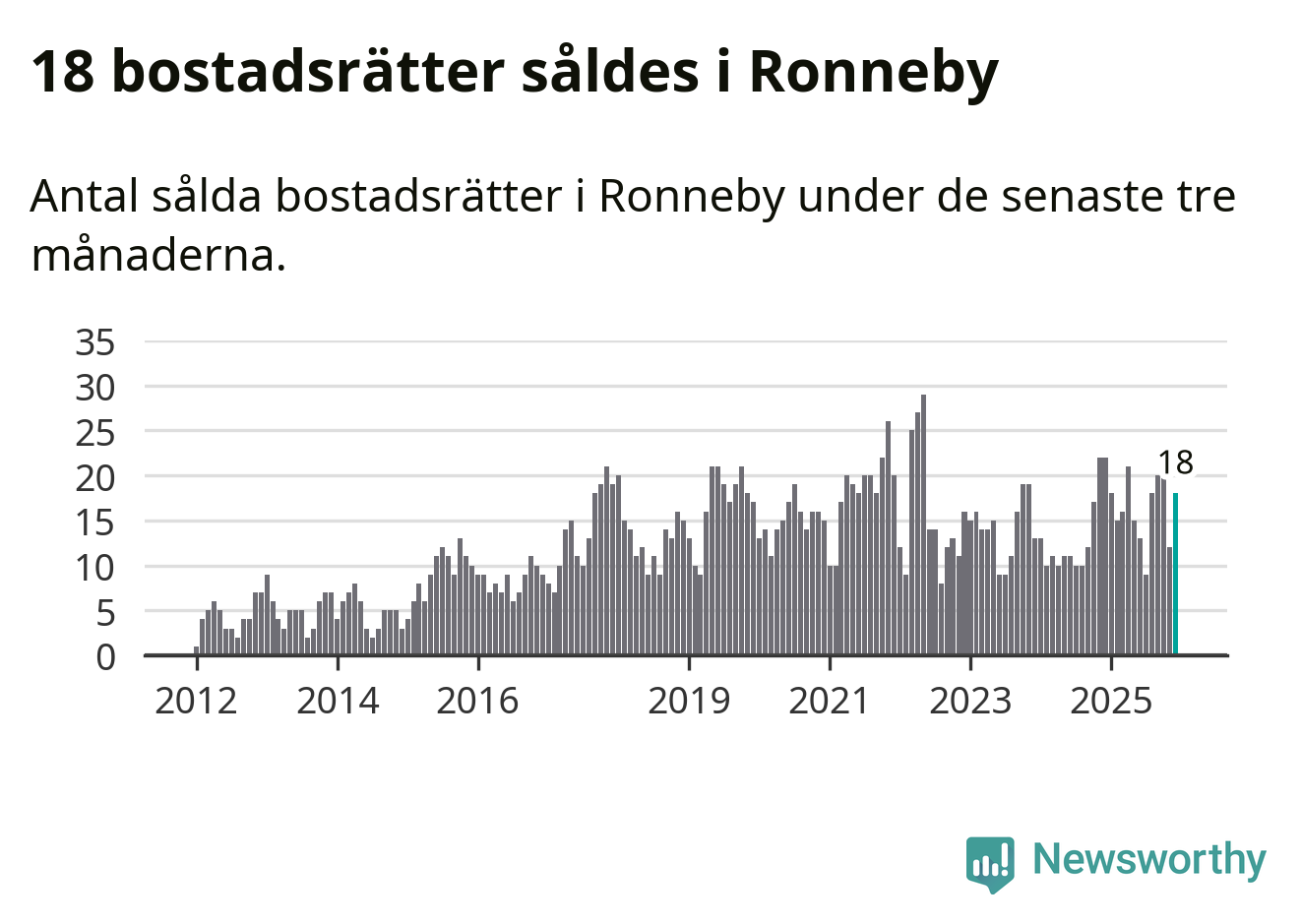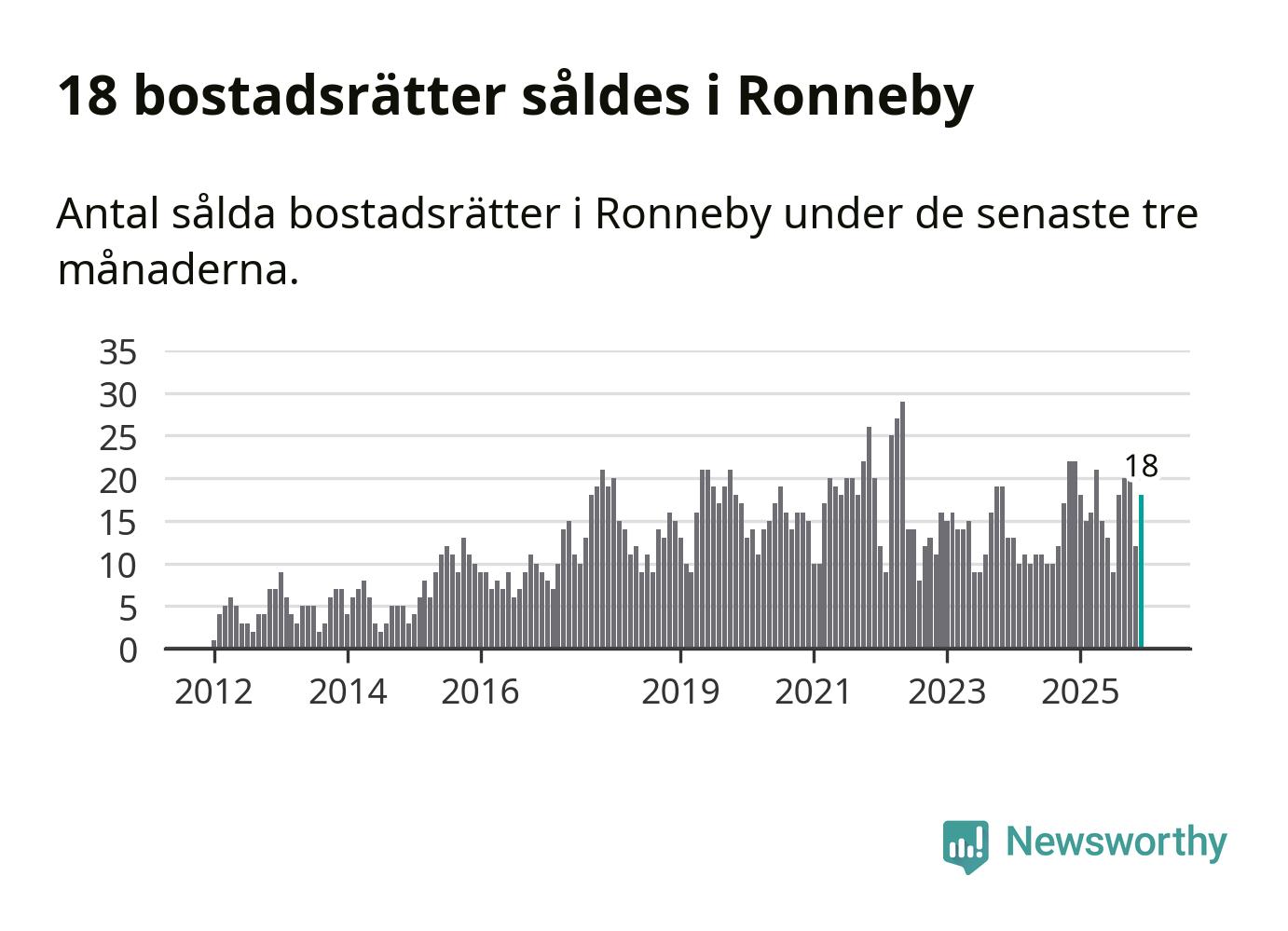 Mellan oktober och december gjordes sammanlagt 18 affärer med bostadsrätter i Ronneby kommun. Det kan jämföras med 22 vid motsvarande tid i fjol.
