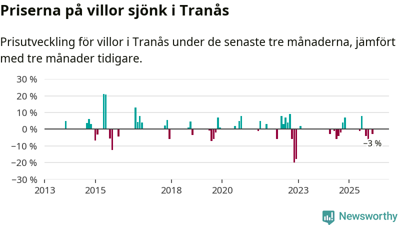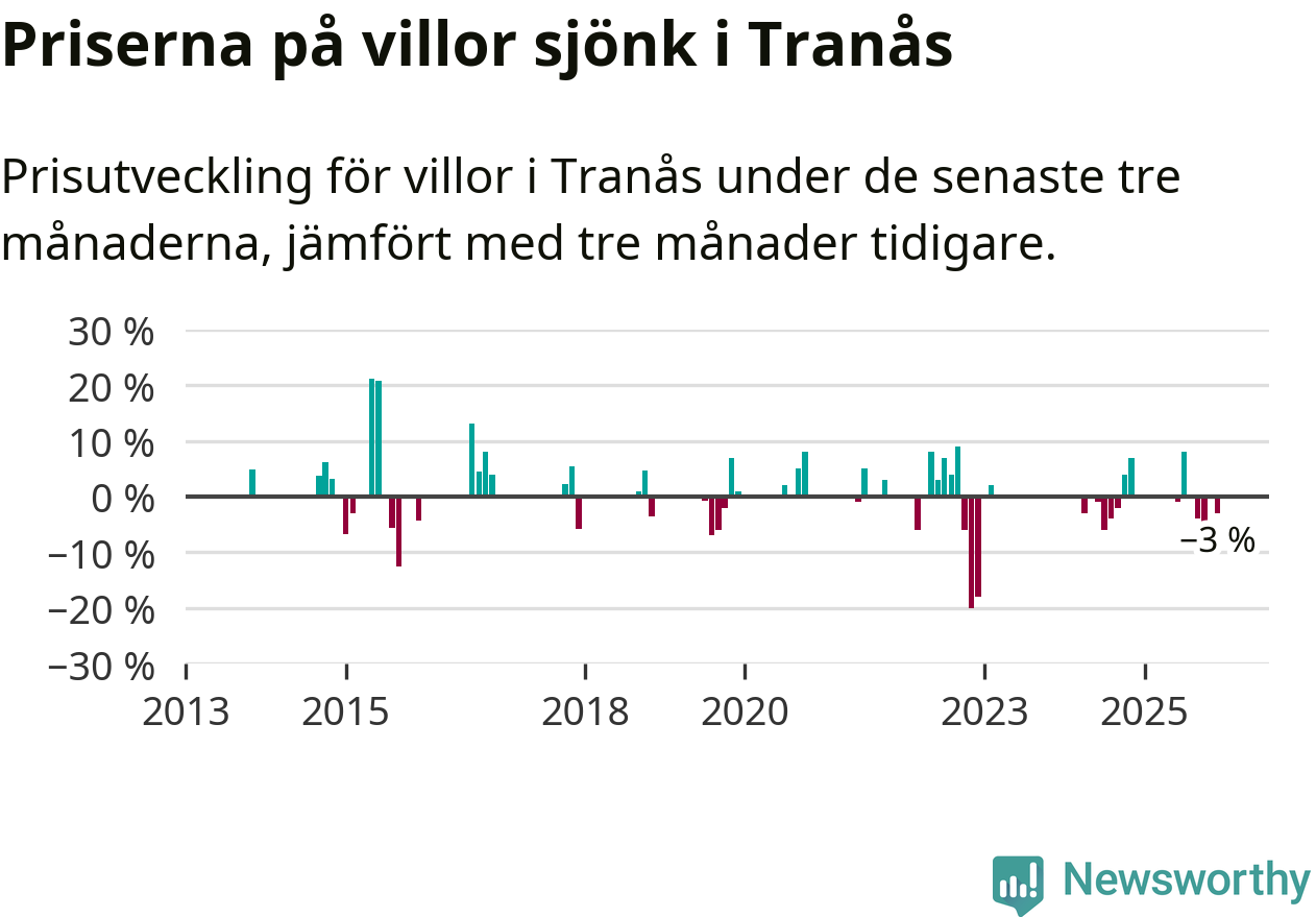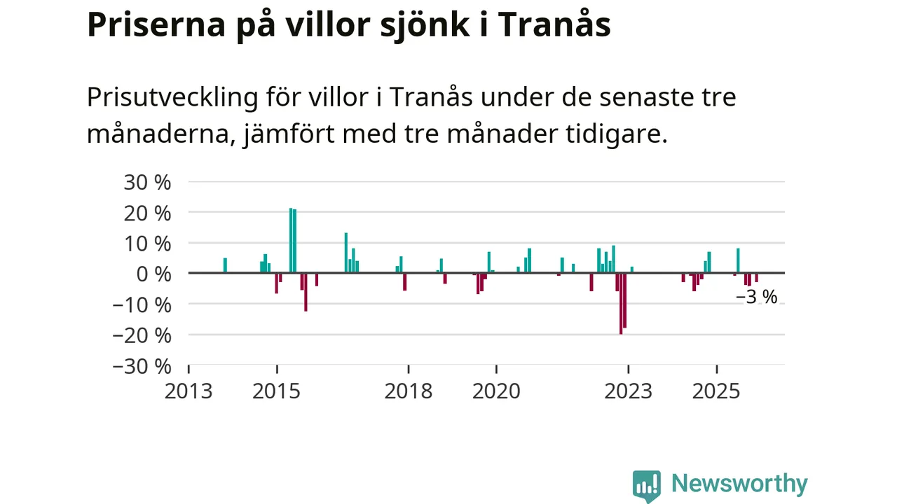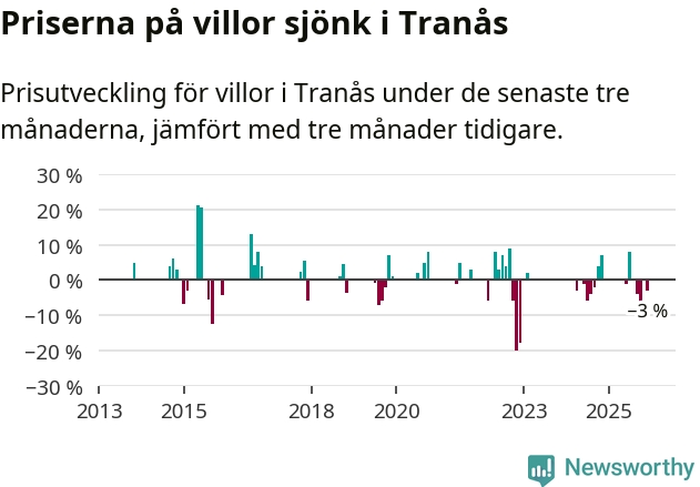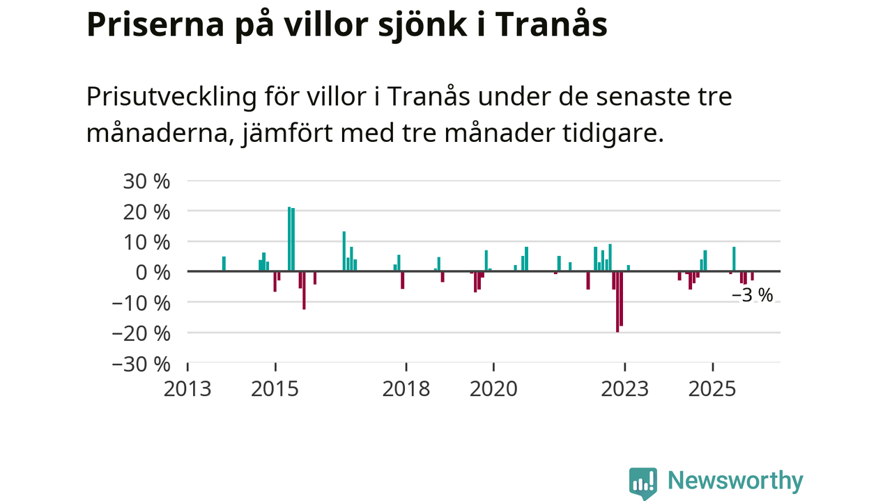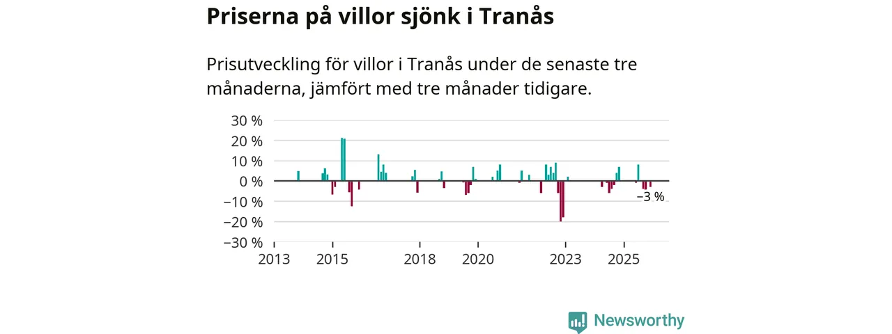 Statistiken visar även på en prisnedgång i Tranås kommun. Medelpriset på försäljningarna av villor i kommunen var 3 procent lägre än för tre månader sedan. Även i hela Jönköpings län sjunker villapriserna. I hela länet noterades en prisnedgång på 2 procent.