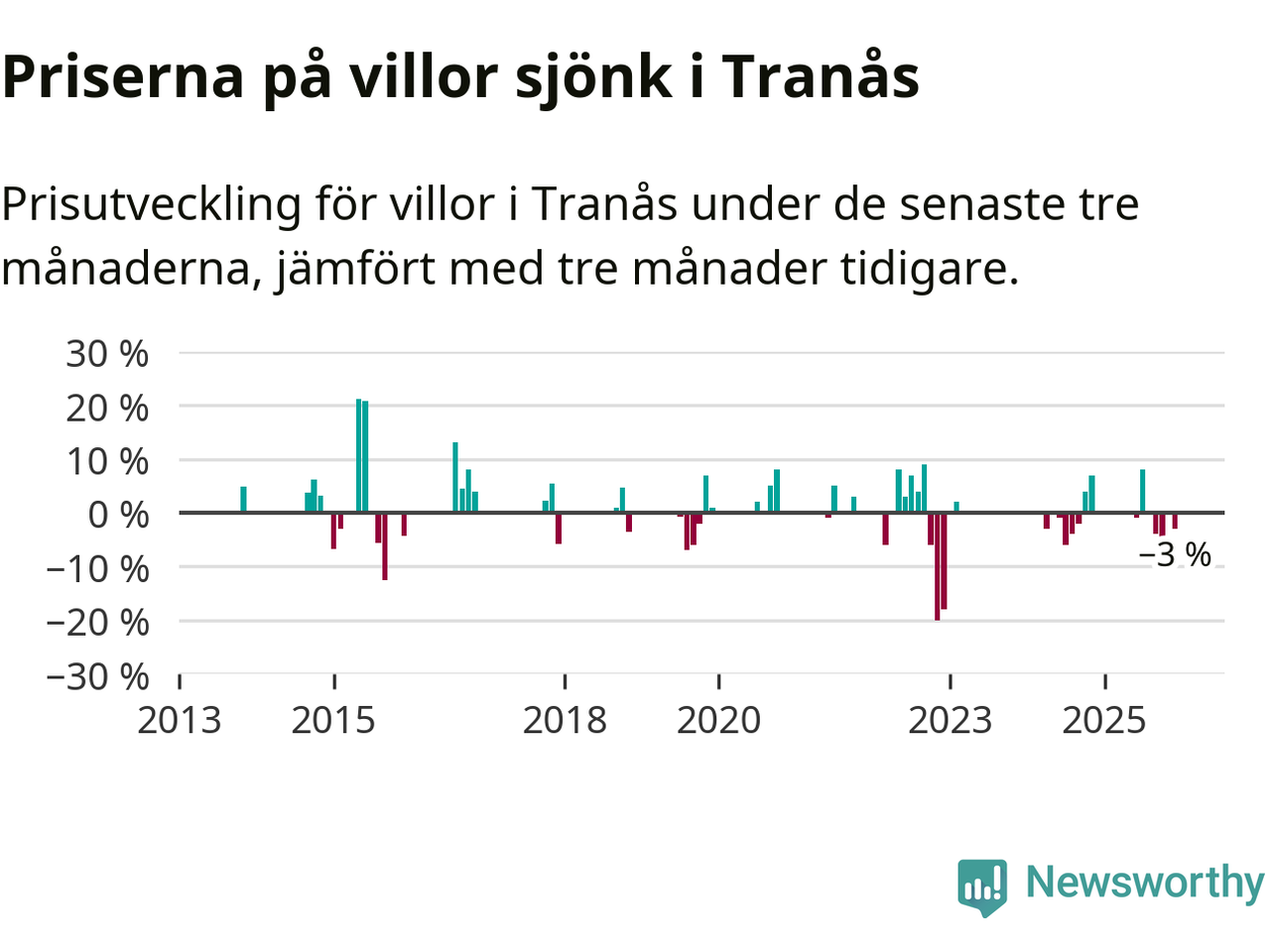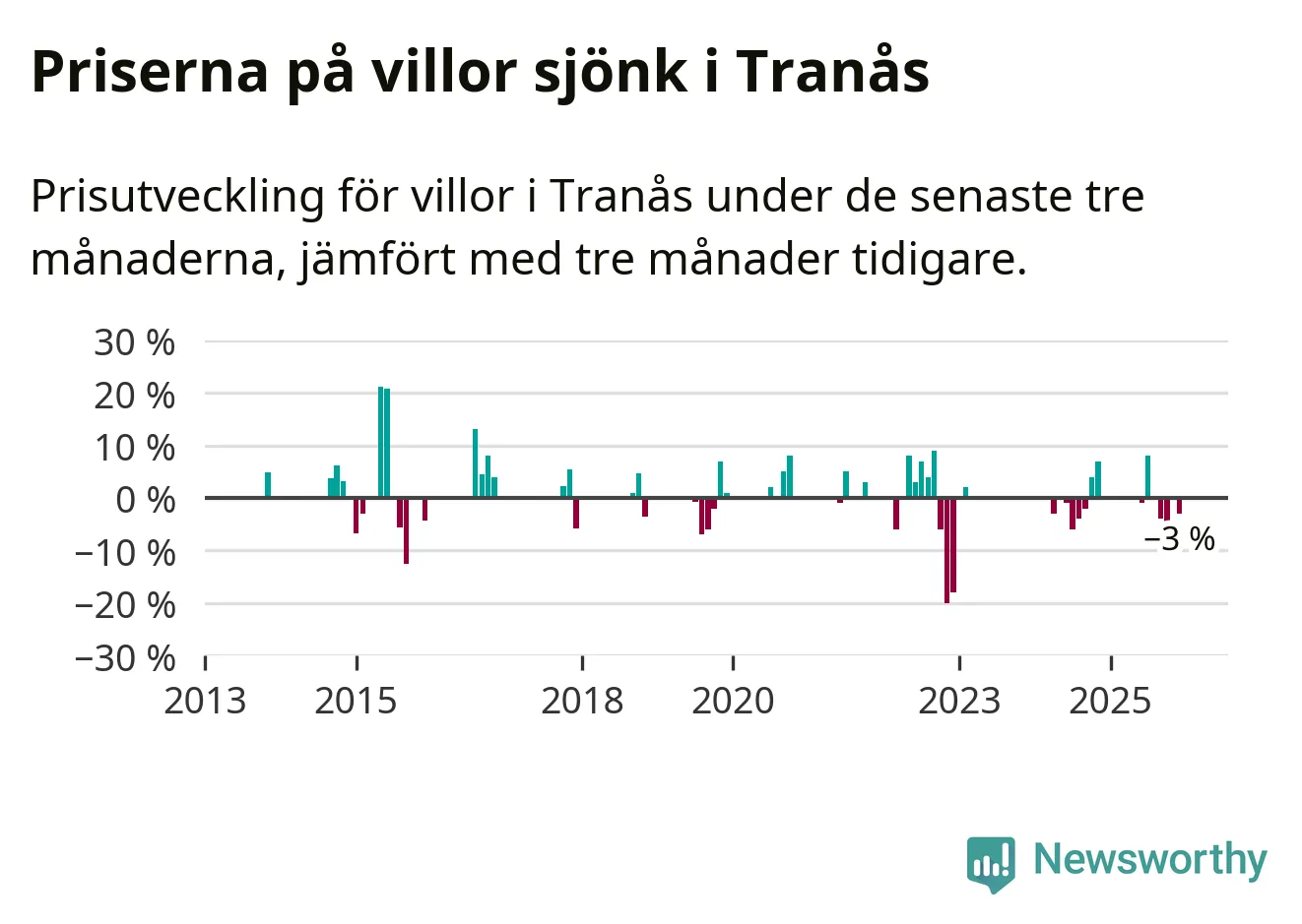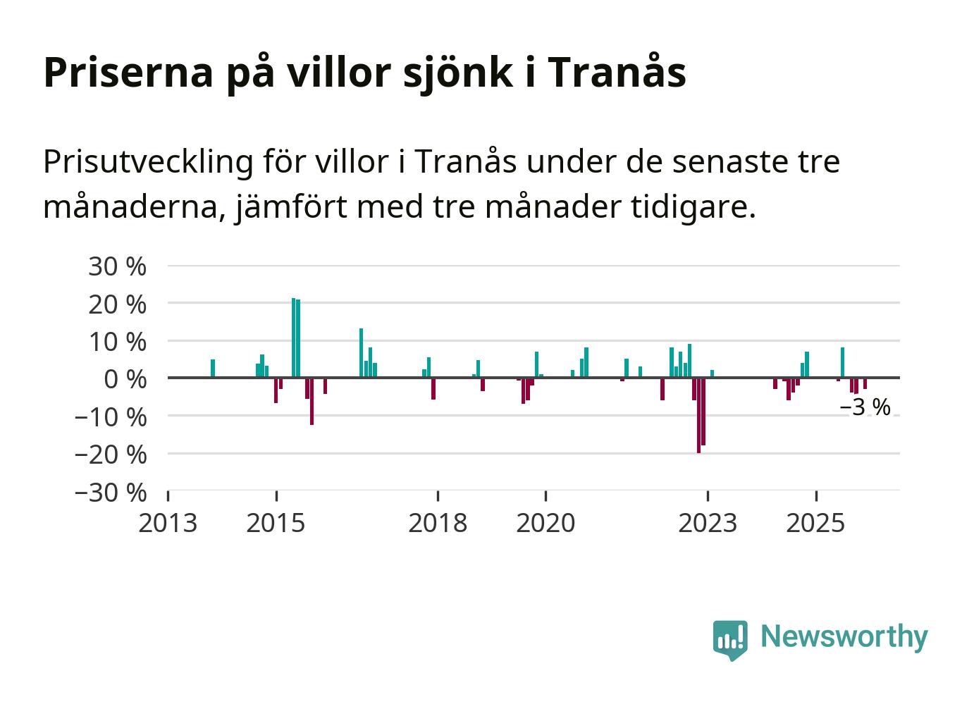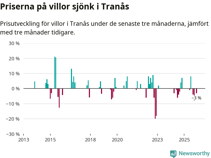Statistiken visar även på en prisnedgång i Tranås kommun. Medelpriset på försäljningarna av villor i kommunen var 3 procent lägre än för tre månader sedan. Även i hela Jönköpings län sjunker villapriserna. I hela länet noterades en prisnedgång på 2 procent.