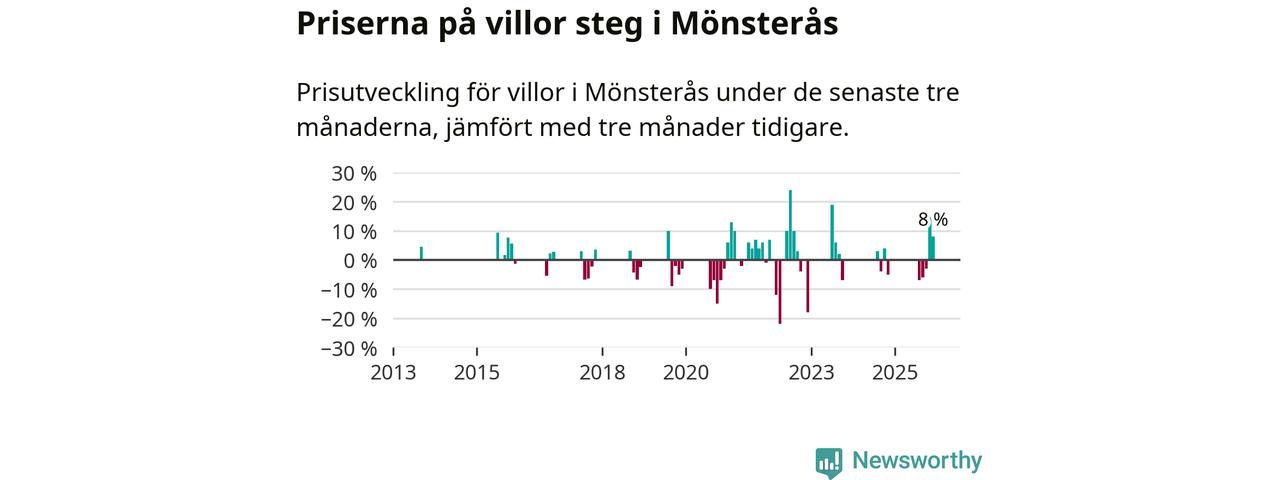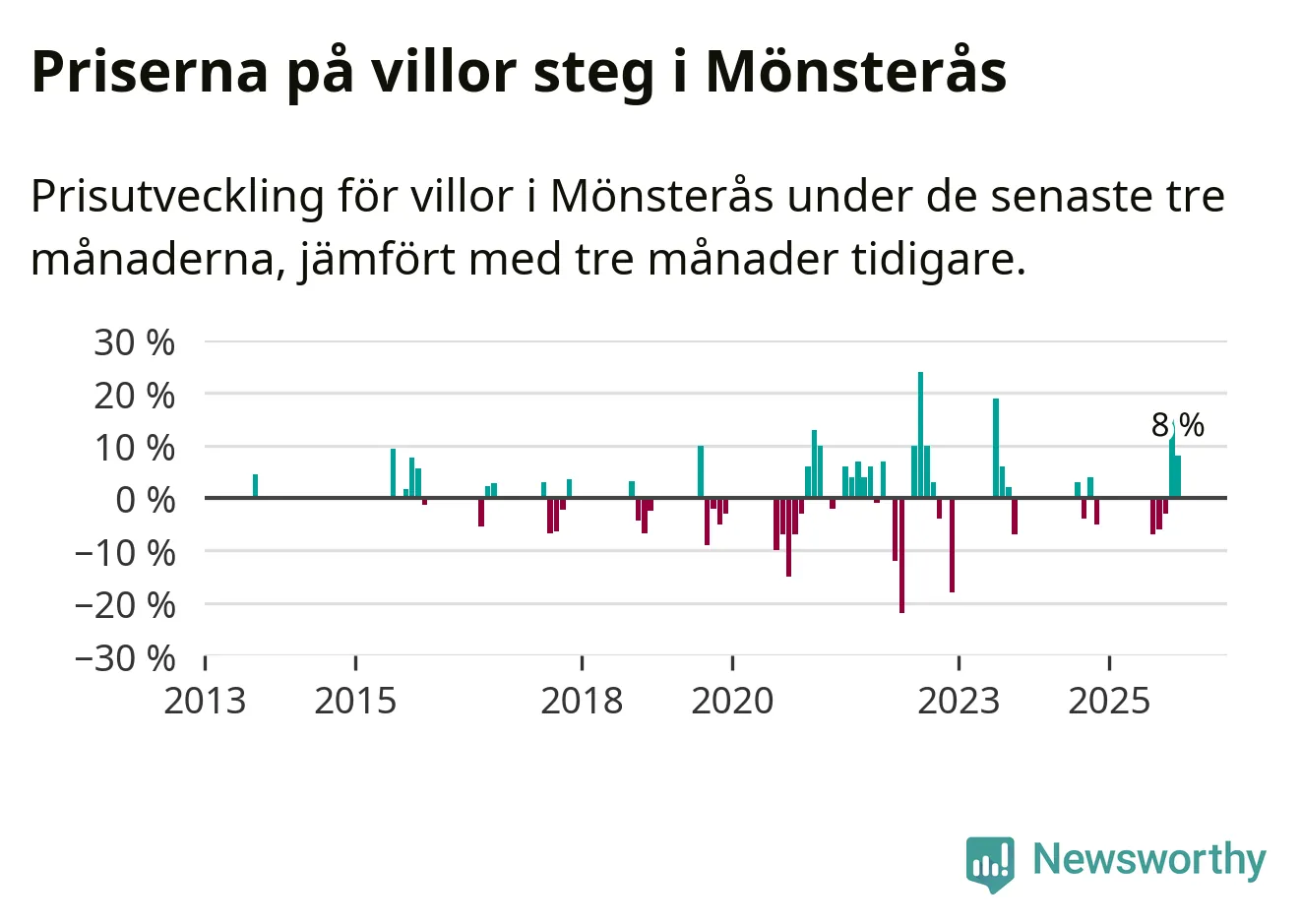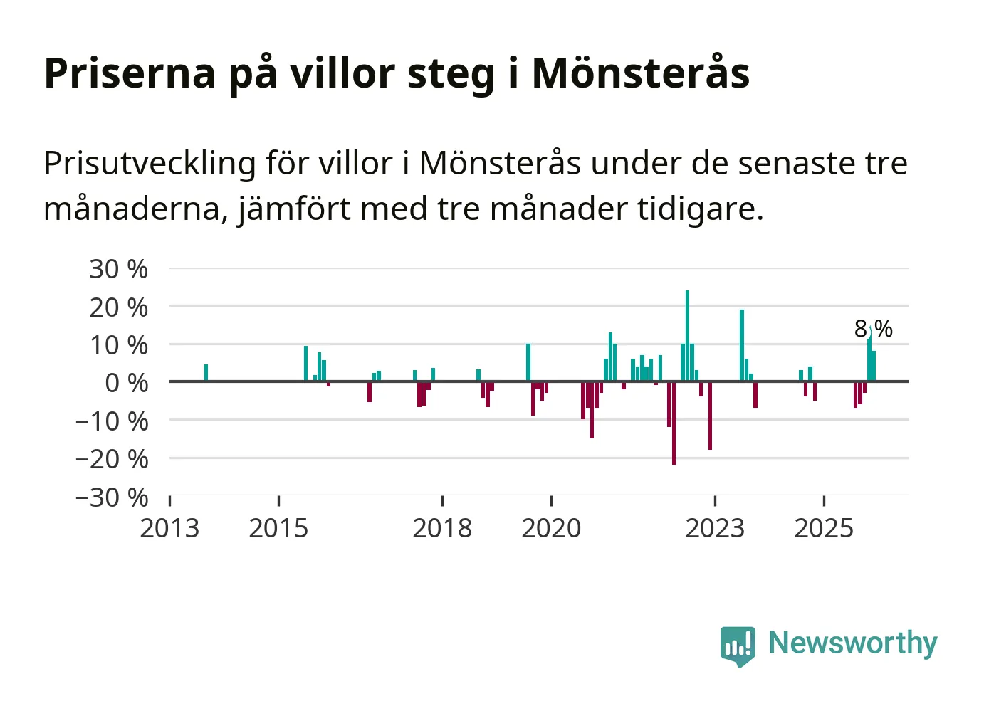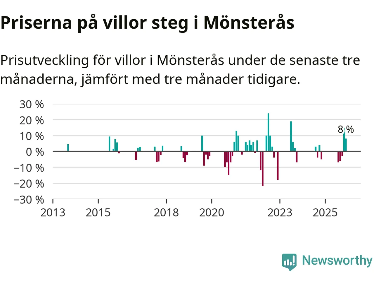 Statistiken visar även på en stor prisuppgång i Mönsterås kommun. Medelpriset på försäljningarna av villor i kommunen var 8 procent högre än för tre månader sedan. I hela Kalmar län däremot sjunker villapriserna. I hela länet noterades en prisnedgång på 5 procent.